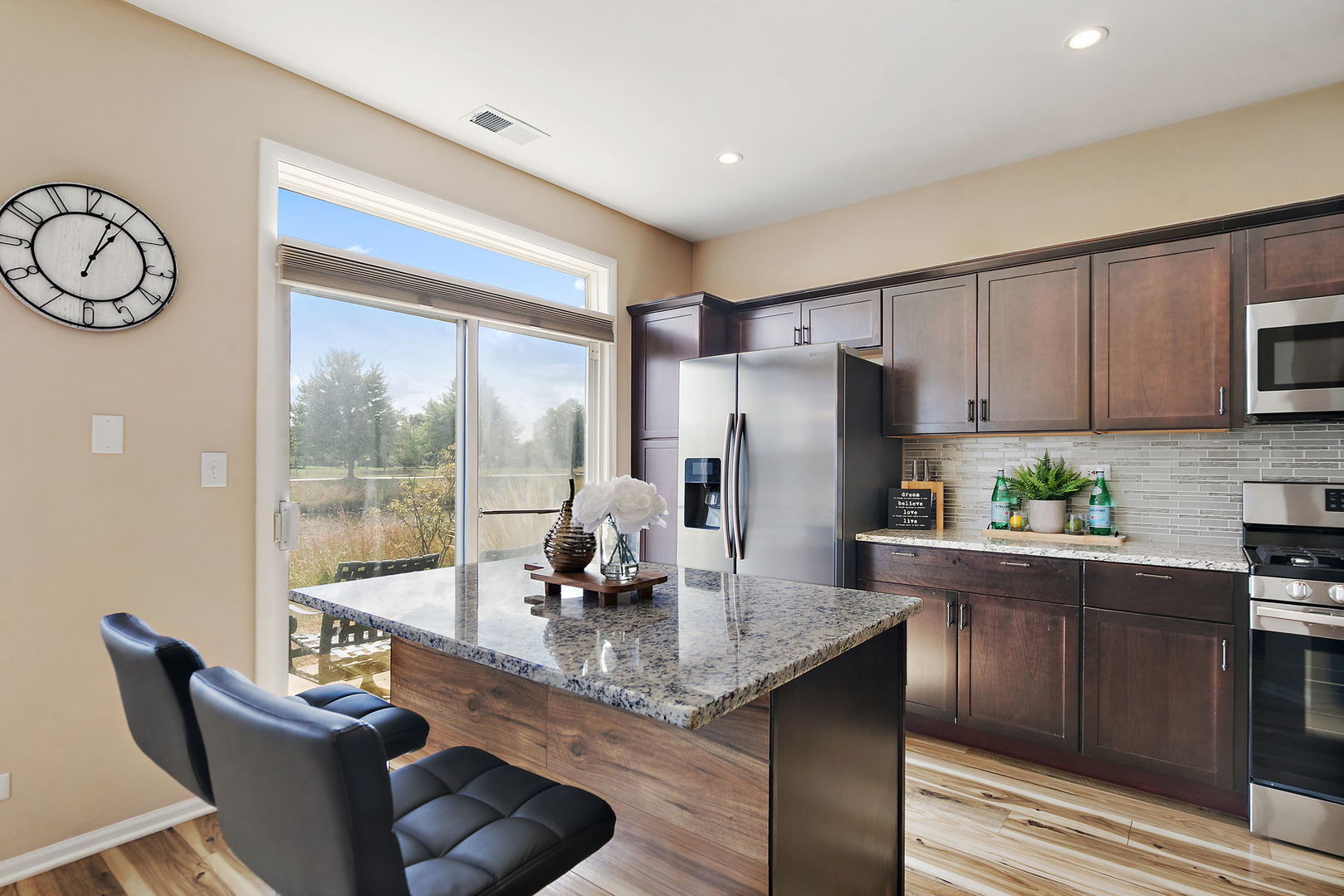 Welcome to this beautifully updated townhome offering modern style, thoughtful upgrades, and peaceful pond views. With 1,400 sq. ft. of living space, this home features two generously sized bedrooms, each with a private full bath, plus an additional guest bath. The kitchen is a showstopper with granite counters, stainless steel appliances, espresso cabinetry, and a striking glass tile backsplash. Throughout the home you’ll find new flooring, fresh lighting, ceiling fans, trim, and doors that create a clean, contemporary feel. Bathrooms have been completely refreshed, and a brand-new roof (2024) adds lasting value. Conveniently located near shopping and dining, this move-in ready home blends comfort and quality in a setting you’ll love.