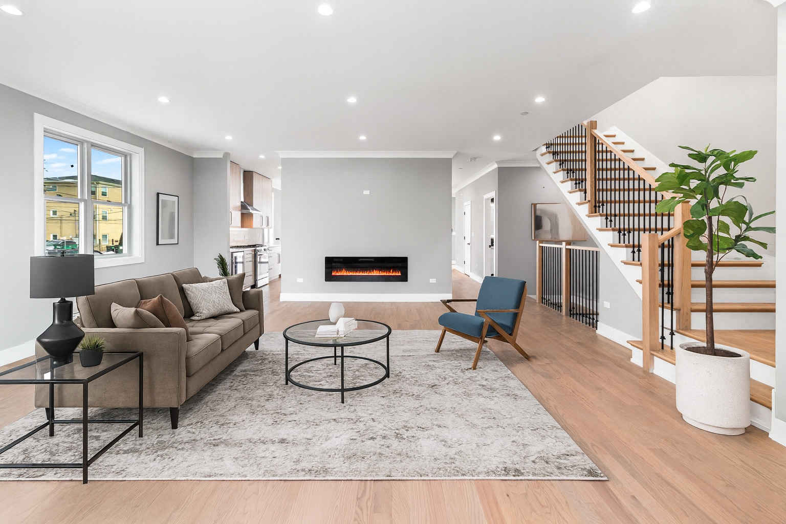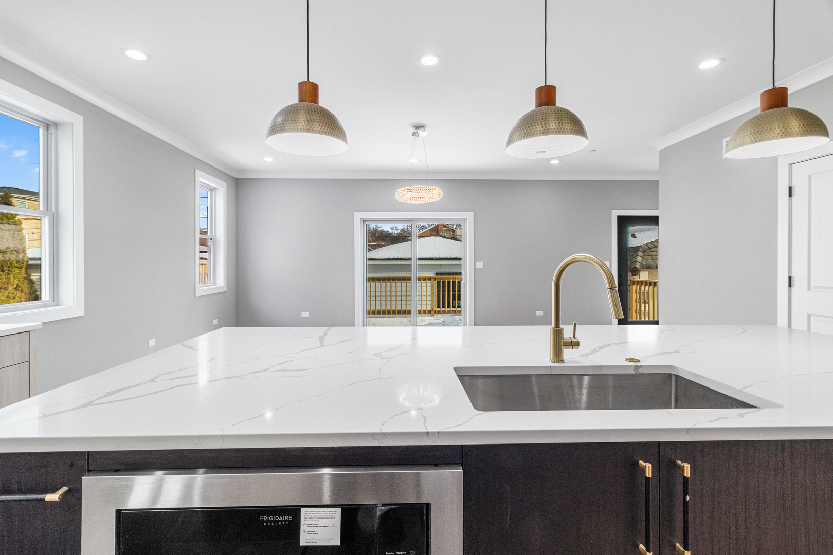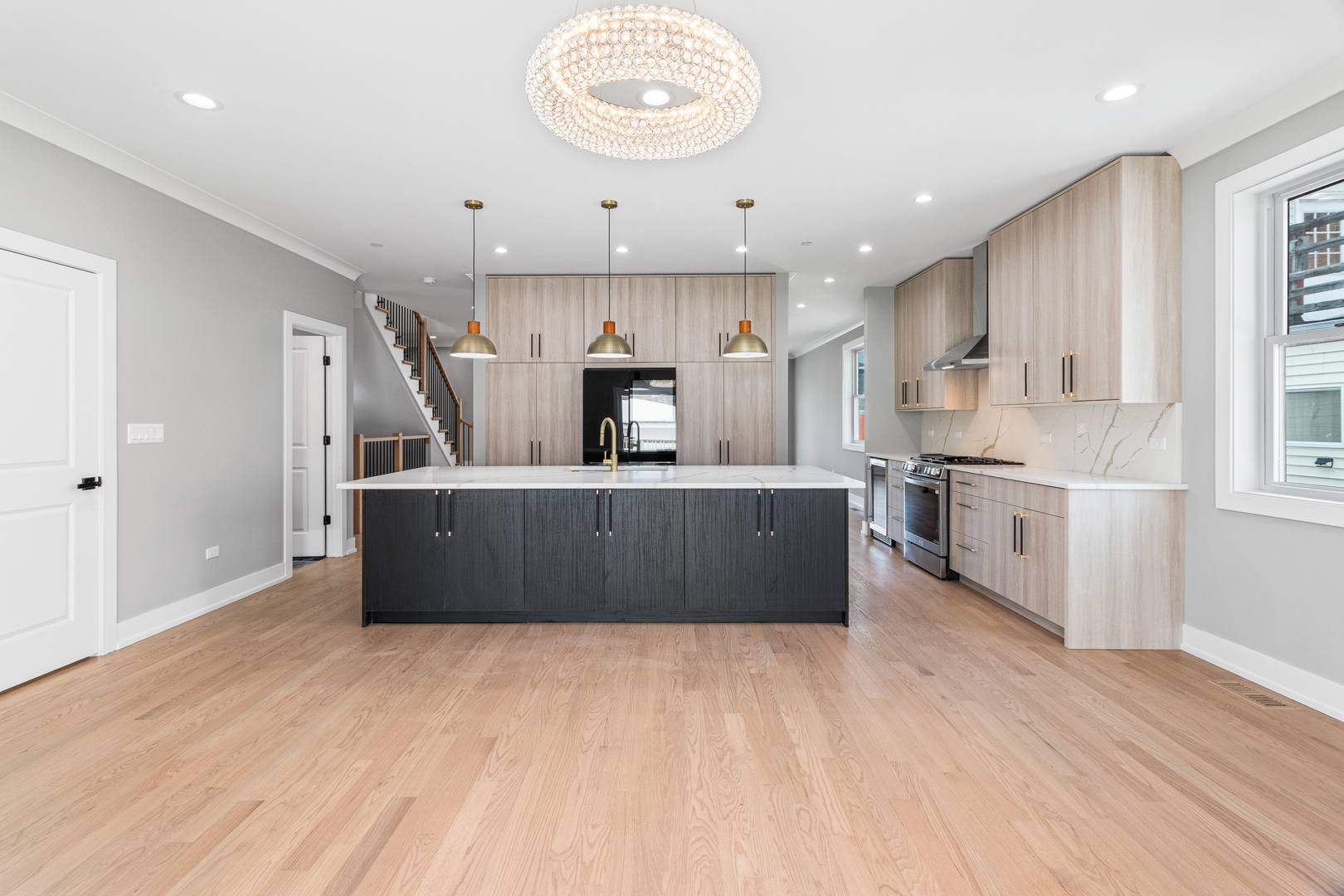 BRAND NEW CONSTRUCTION! Discover this exceptional 5-bedroom, 3.5-bath new construction home showcasing an open-concept layout with bright airy rooms and high-end finishes throughout. The gourmet kitchen is a chef’s paradise, featuring sleek quartz countertops, top-tier stainless-steel appliances, a spacious island, and a cozy eating nook. The main level also includes a modern powder room along with large and welcoming living room and electric LED fireplace. Upstairs, the lavish master suite is a true retreat, complete with expansive walk-in closets and a private ensuite featuring a double-sink vanity and soaking tub. The second floor also includes three additional bedrooms, offering plenty of space for family and guests. The fully finished basement extends the living area with a wet bar, a large recreation room, a fifth bedroom, and another full bath-perfect for entertaining or hosting visitors. Step outside into the fenced yard with a charming deck, creating a peaceful outdoor oasis for relaxation or activities. The added convenience is a brand new 2-car garage and additional 1 space – exterior carport. With its prime location near the train station, shopping and dining this home offers both luxury and convenience.