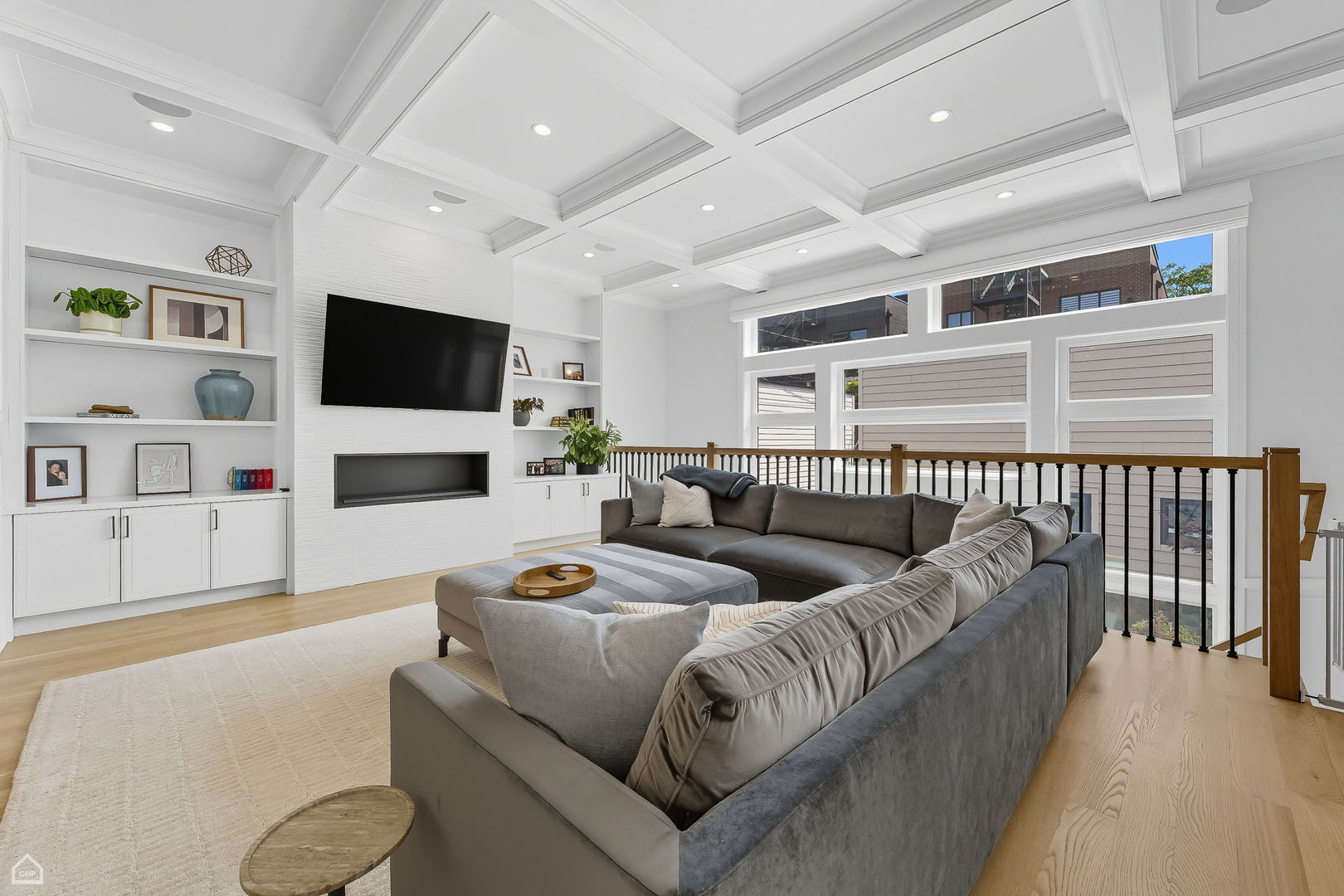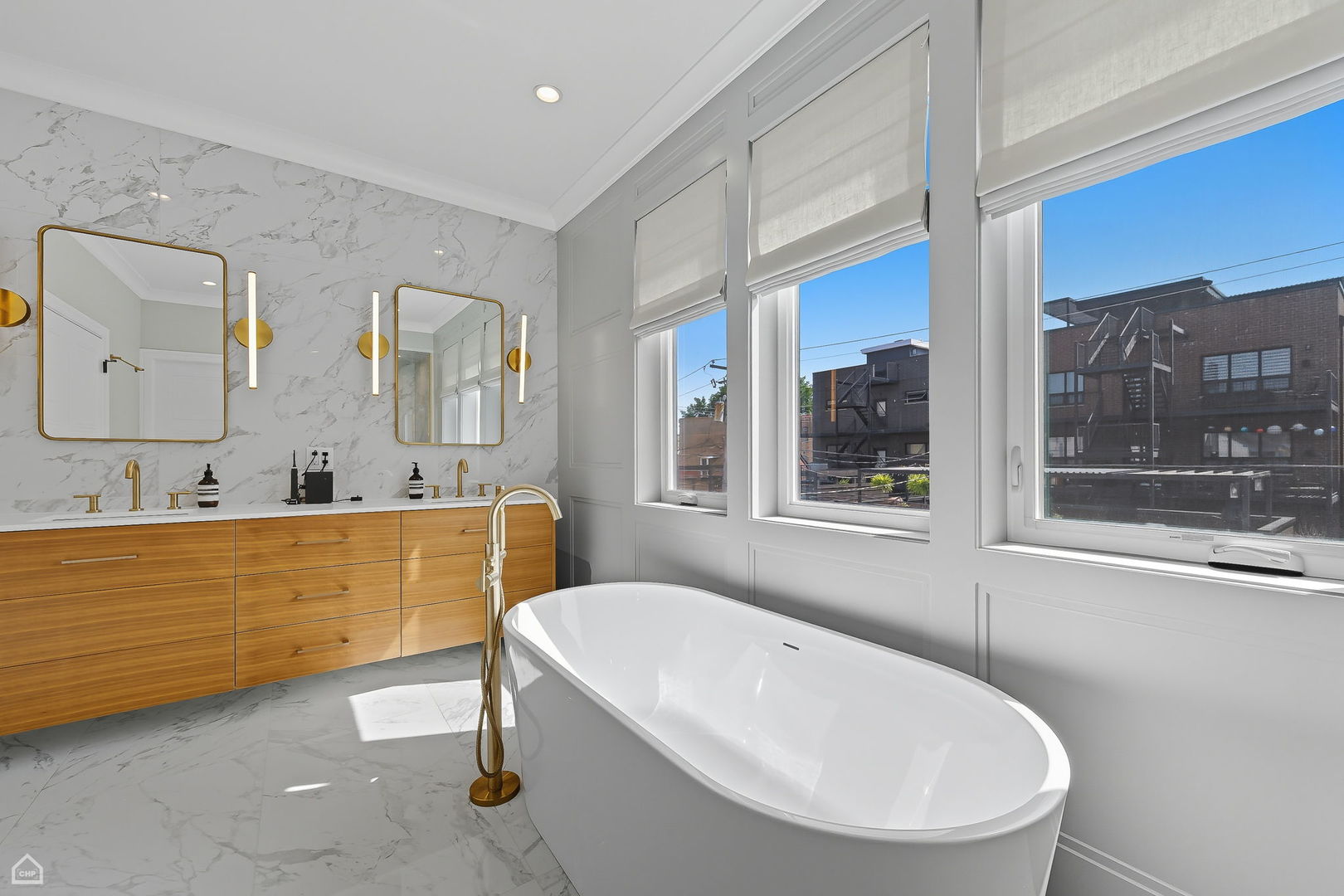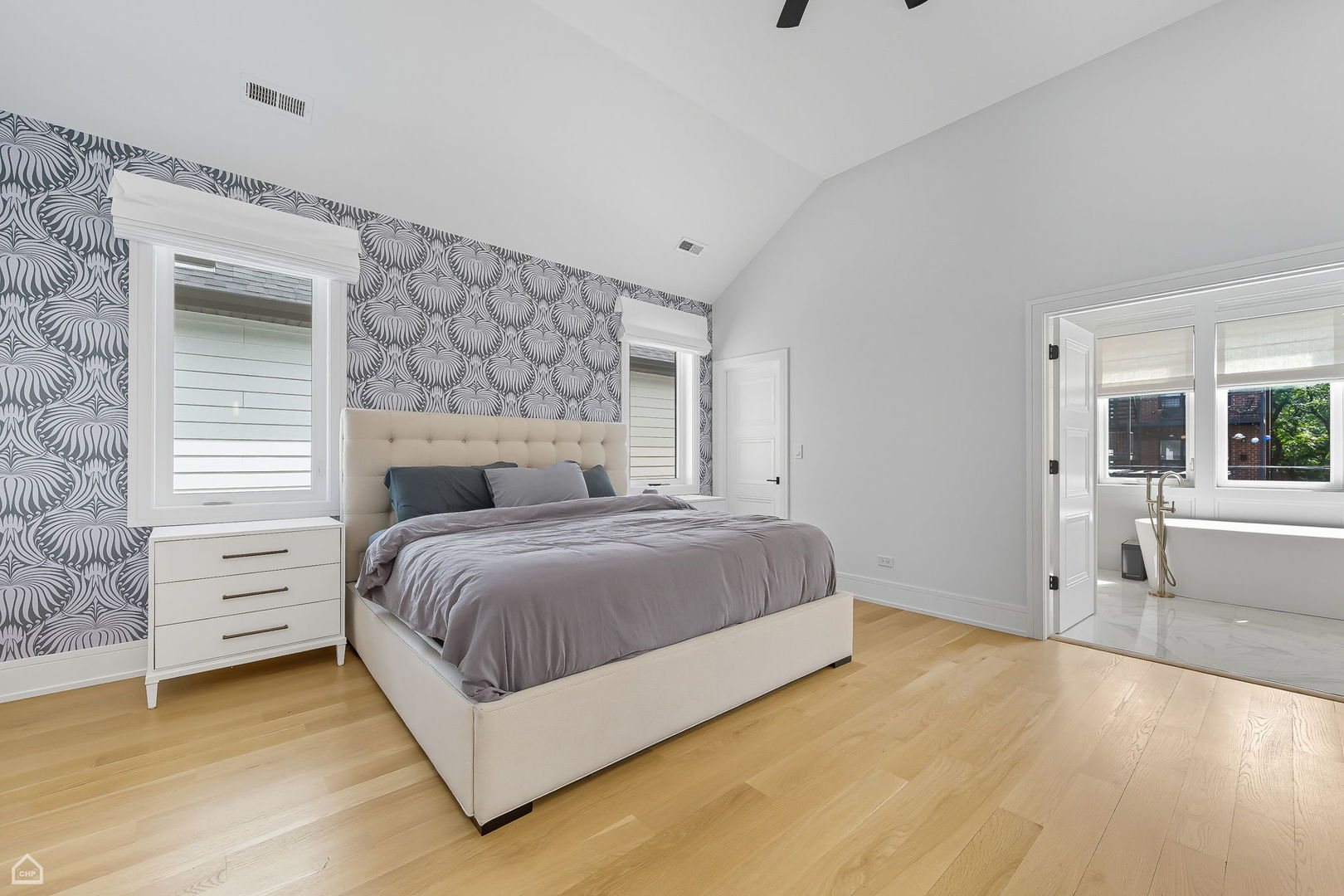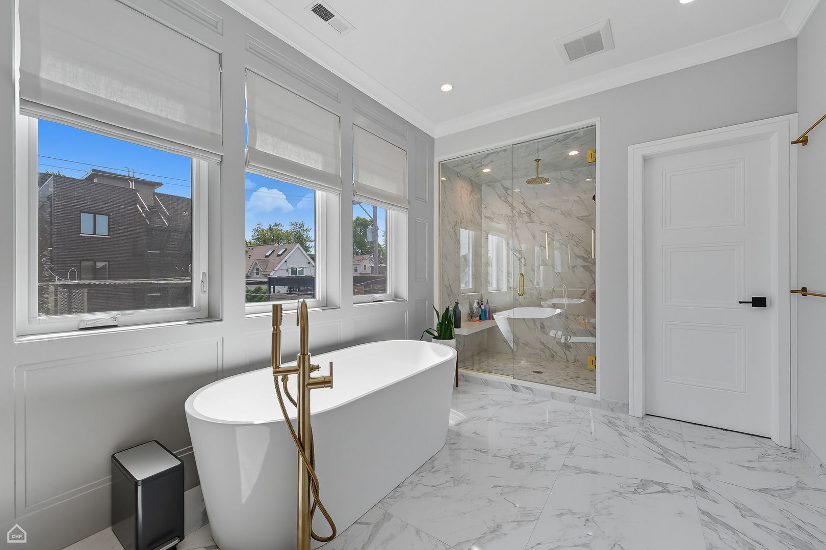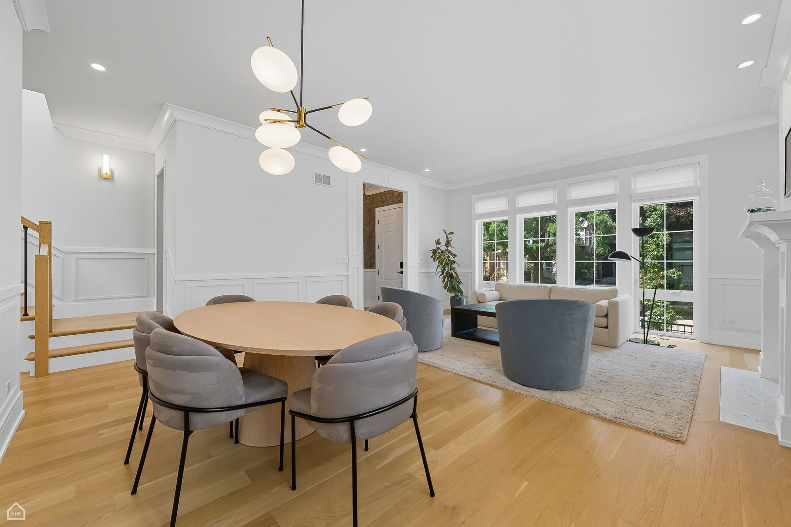 FULL WALK THRU VIDEO ON VTOUR BUTTON – WALK THE HOUSE FROM YOUR CHAIR. Amazing single family home in prime Logan Square location on an extra wide lot. Modern white board and batten facade with black accents and limestone entry. Spacious, extra wide floor plan with 6 bedrooms. Sun filled main level with 10′ ceilings and white oak hardwood flooring. Combined living/dining room with large windows offering ample natural light and wood burning fireplace with gas log. Chef quality kitchen featuring professional grade appliances, large island with bar seating, shaker cabinetry with under counter lighting, quartz counters and backsplash, butler pantry with beverage center, and pantry closet. Adjoining family room with steam fireplace, built-ins, and large windows overlooking the backyard. Spacious primary bedroom features 12′ vaulted ceilings, two walk-in closets, and inspiring master bath with freestanding soaking tub, frameless glass shower, oversized vanity with dual sinks and quartz countertops, and heated flooring. Two additional bedrooms, full bath with dual vanity, tub and heated flooring, laundry with washer/dryer, and zoned heating/cooling complete the upper level. 9ft ceilings in the basement with radiant heated flooring throughout includes recreation room with wet bar + beverage center, two guest bedrooms, full bath, two storage spaces, mechanicals, and second laundry with hook-up and sink. Statement lighting, designer fixtures and finishes, metal railings, coffered ceilings, custom millwork, pre-wiring for surround sound, and skylights. Fully enclosed landscaped yard with rear paver patio and detached two-car garage featuring roof deck with composite decking. Awesome location in Logan Square! Easy access to all your favorite spots for food, entertainment and shopping. Conveniently located near I94, parks and public tran. Close to the Blue Line.
