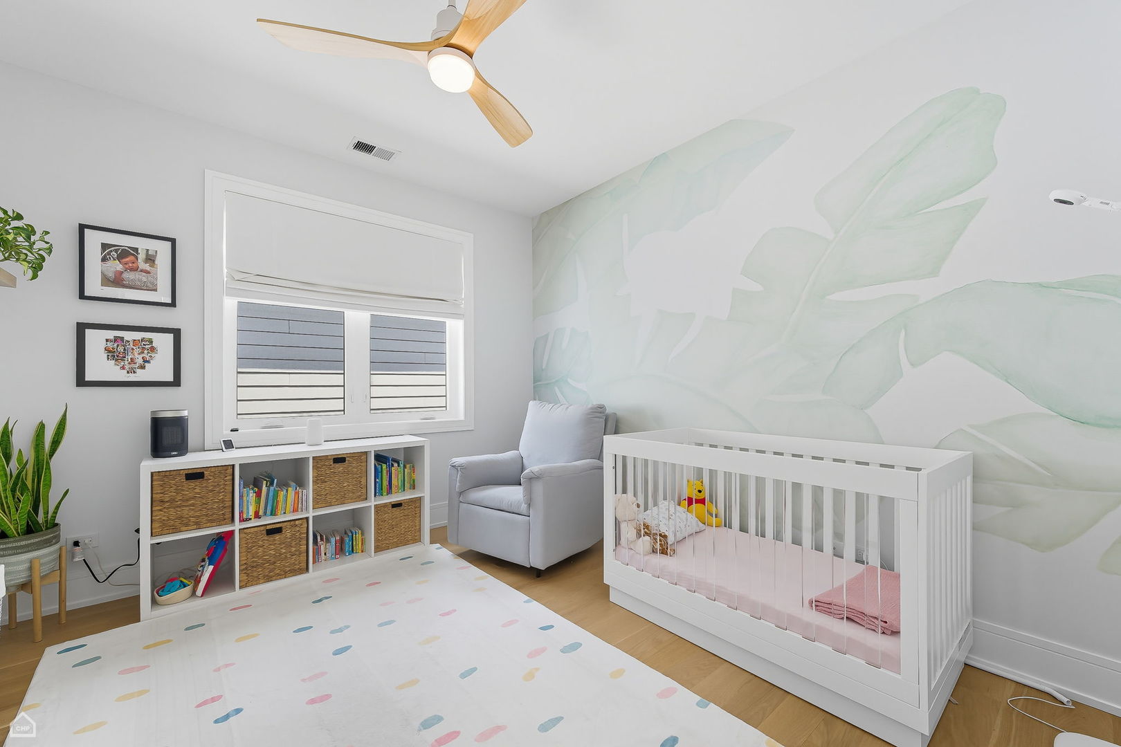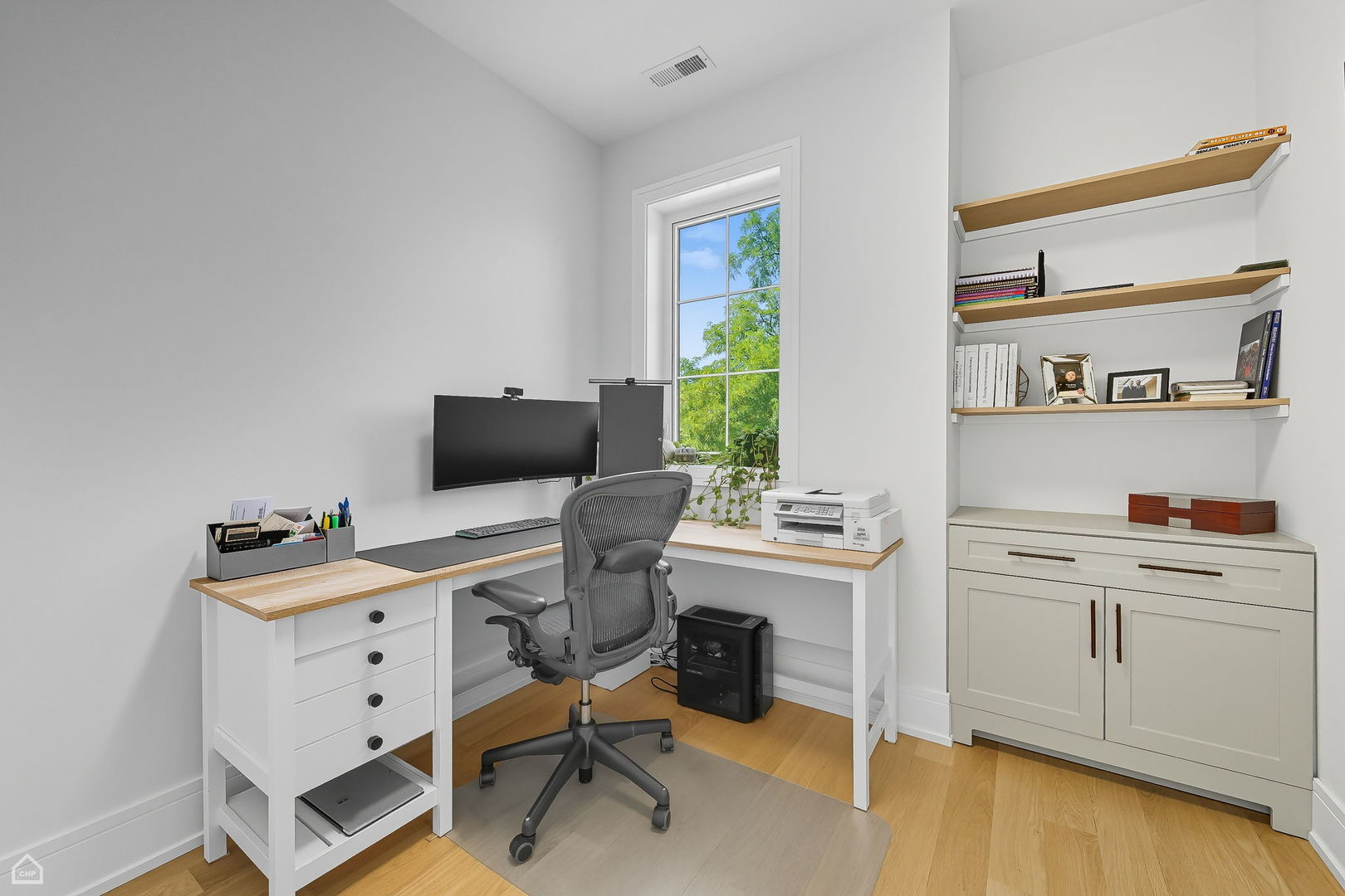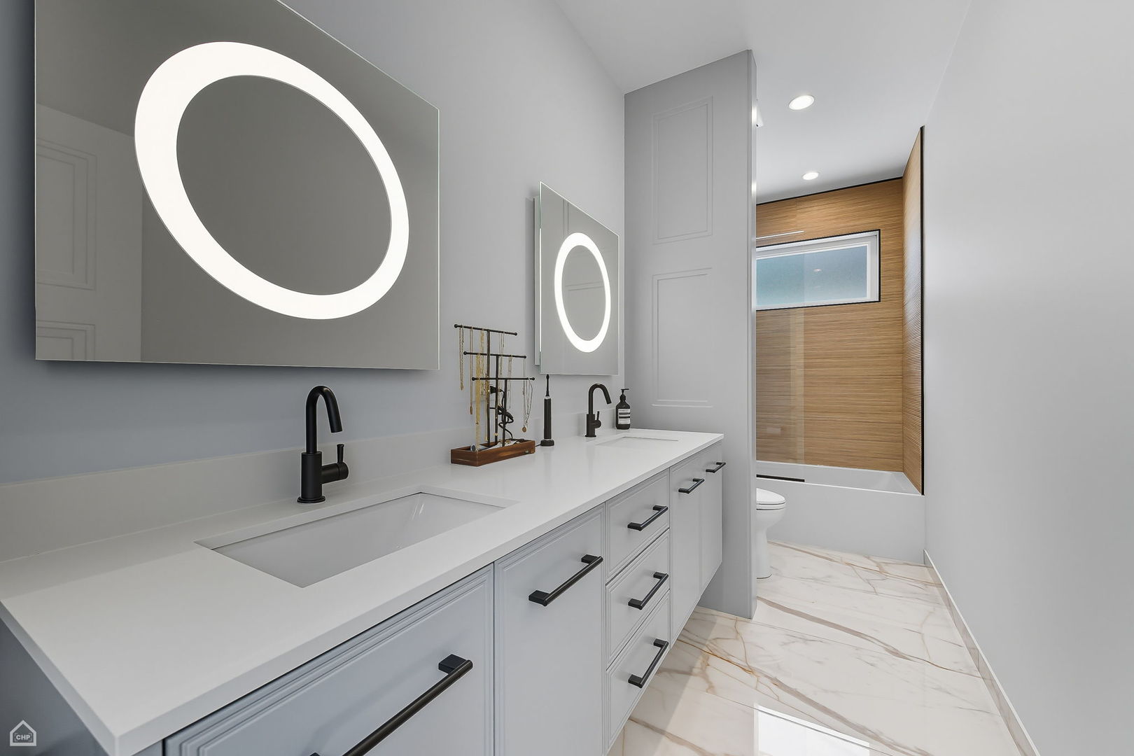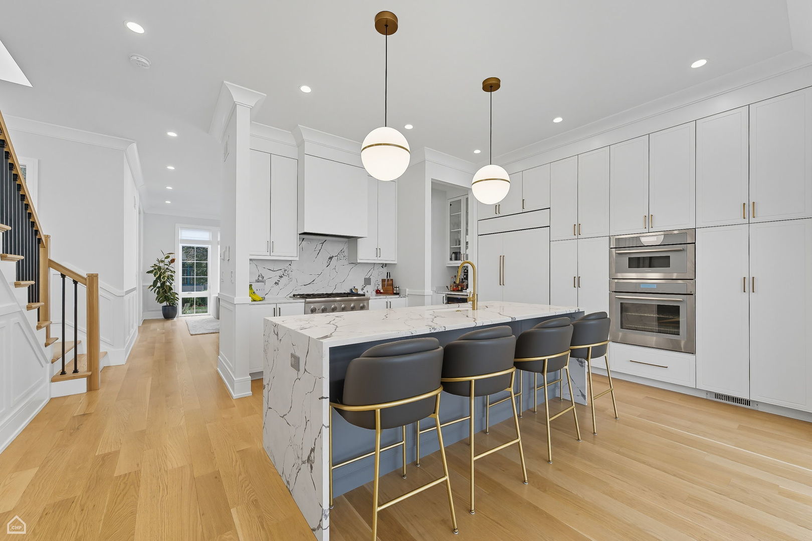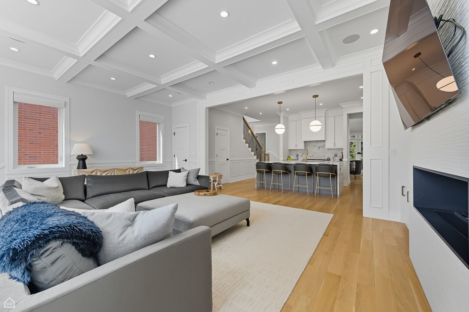 FULL WALK THRU VIDEO ON VTOUR BUTTON – WALK THE HOUSE FROM YOUR CHAIR. Amazing single family home in prime Logan Square location on an extra wide lot. Modern white board and batten facade with black accents and limestone entry. Spacious, extra wide floor plan with 6 bedrooms. Sun filled main level with 10′ ceilings and white oak hardwood flooring. Combined living/dining room with large windows offering ample natural light and wood burning fireplace with gas log. Chef quality kitchen featuring professional grade appliances, large island with bar seating, shaker cabinetry with under counter lighting, quartz counters and backsplash, butler pantry with beverage center, and pantry closet. Adjoining family room with steam fireplace, built-ins, and large windows overlooking the backyard. Spacious primary bedroom features 12′ vaulted ceilings, two walk-in closets, and inspiring master bath with freestanding soaking tub, frameless glass shower, oversized vanity with dual sinks and quartz countertops, and heated flooring. Two additional bedrooms, full bath with dual vanity, tub and heated flooring, laundry with washer/dryer, and zoned heating/cooling complete the upper level. 9ft ceilings in the basement with radiant heated flooring throughout includes recreation room with wet bar + beverage center, two guest bedrooms, full bath, two storage spaces, mechanicals, and second laundry with hook-up and sink. Statement lighting, designer fixtures and finishes, metal railings, coffered ceilings, custom millwork, pre-wiring for surround sound, and skylights. Fully enclosed landscaped yard with rear paver patio and detached two-car garage featuring roof deck with composite decking. Awesome location in Logan Square! Easy access to all your favorite spots for food, entertainment and shopping. Conveniently located near I94, parks and public tran. Close to the Blue Line.