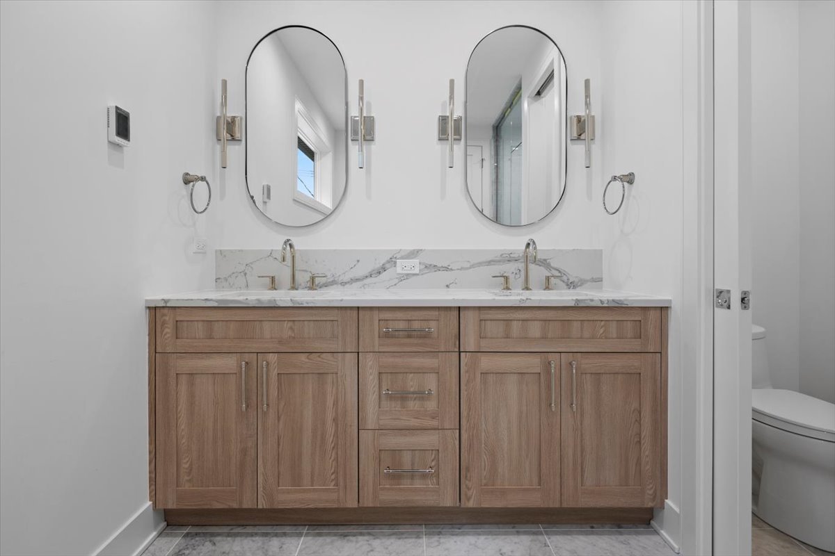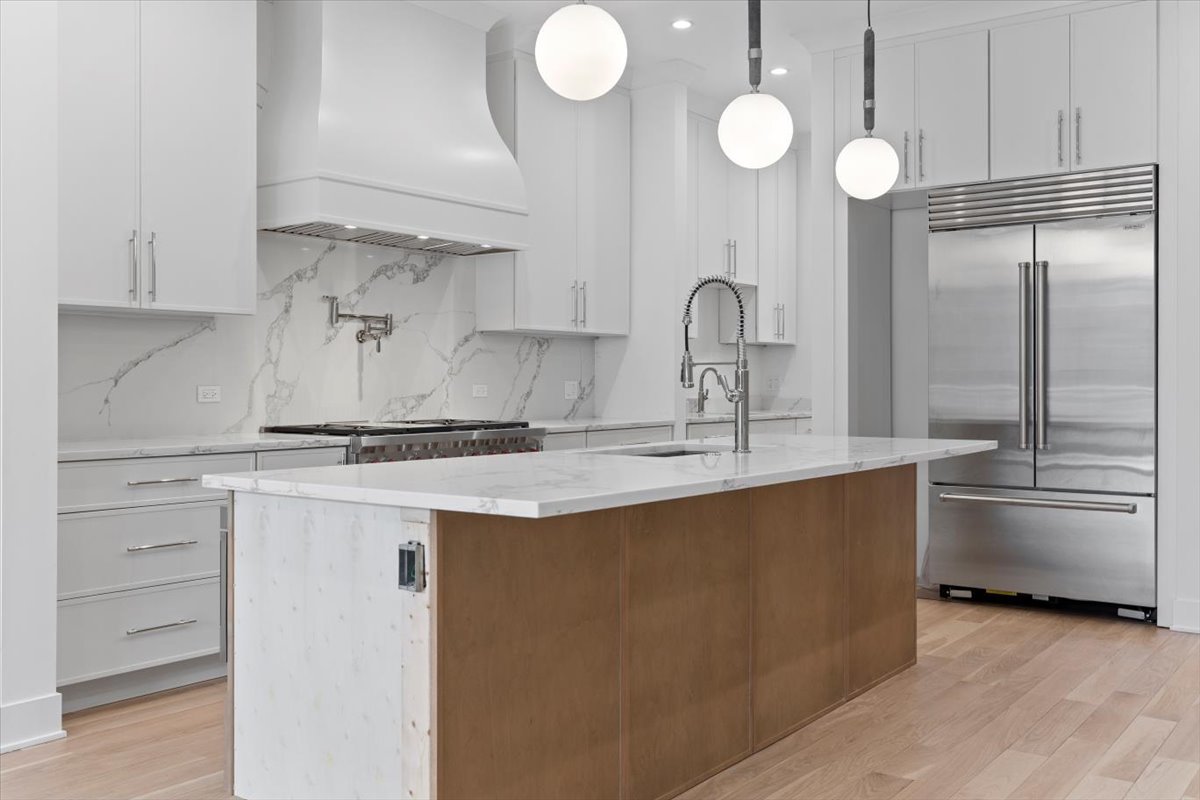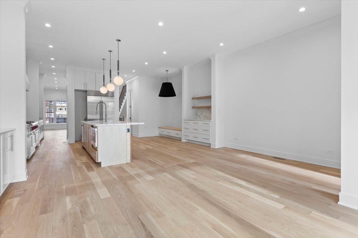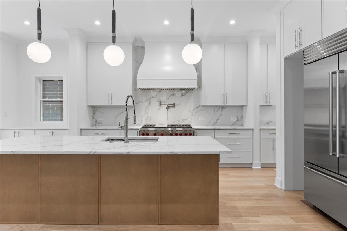 Nestled in the heart of North Center, this exquisite full gut-rehab is now complete! Located within the highly sought-after Coonley Elementary and Amundsen High School districts, this 6 bedroom, 4.2 bathroom residence spans three thoughtfully designed levels, with all new interiors within an ultra wide floor plan offering exceptional space for living and entertaining. Step inside to 10′ ceilings welcoming you into an inviting living and dining area, ideal for both intimate gatherings and larger celebrations. The kitchen is a chef’s dream, featuring a 48″ Wolf range, Sub-Zero refrigerator, quartz countertops, custom white cabinetry, and a striking white oak island. A butler’s pantry, wet bar, coffee bar, and built-in banquette seating add both style and function. Flowing seamlessly from the kitchen, the spacious family room is anchored by a sleek gas fireplace and custom built-ins, with direct access to the back deck-perfect for indoor-outdoor living. A well-equipped mudroom and a stylish powder room complete the main level. Upstairs, the second floor hosts four spacious bedrooms and three full baths, including the luxurious primary suite, a serene retreat featuring dual walk-in closets and a spa-like bath with a dual vanity, rain/steam shower, and a separate soaking tub. The second bedroom enjoys a private en-suite bath, while the remaining two share a Jack-and-Jill bathroom. A convenient second-floor laundry room adds ease to daily living. The fully finished lower level with 9′ ceilings throughout is designed for relaxation and entertainment, featuring radiant-heated luxury vinyl plank floors, a wet bar, and a large rec room. Two additional bedrooms share a Jack-and-Jill bath, while an extra half bath adds to the home’s functionality. Outside, enjoy summer evenings in the private backyard or on the rooftop deck of the newly built two-car garage. Just steps from the riverwalk path and Welles Park plus top-rated restaurants & bars like Kraken Sushi & Gideon Welles, Lincoln Square boutique shopping, and recreational hubs like Lil’ Kickers, IK Gymnastics, and Goldfish & Big Blue Swim Schools, this home offers the ultimate urban lifestyle in one of Chicago’s most desirable neighborhoods.