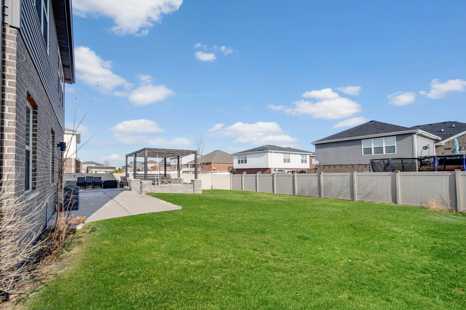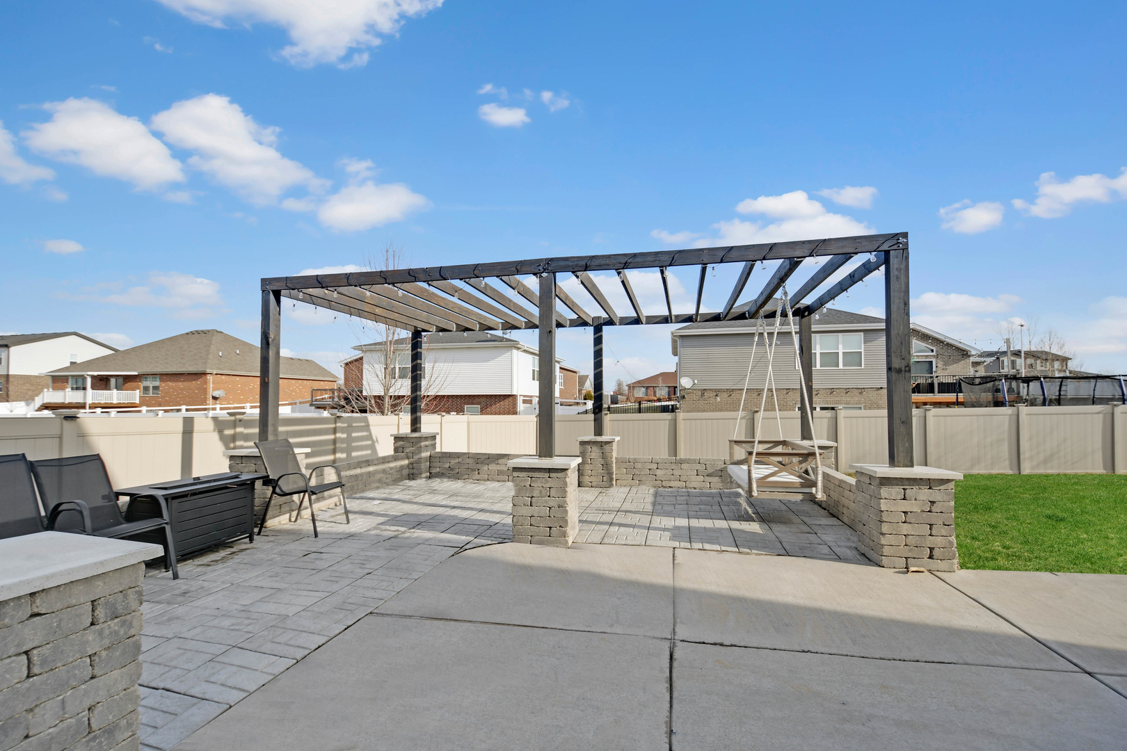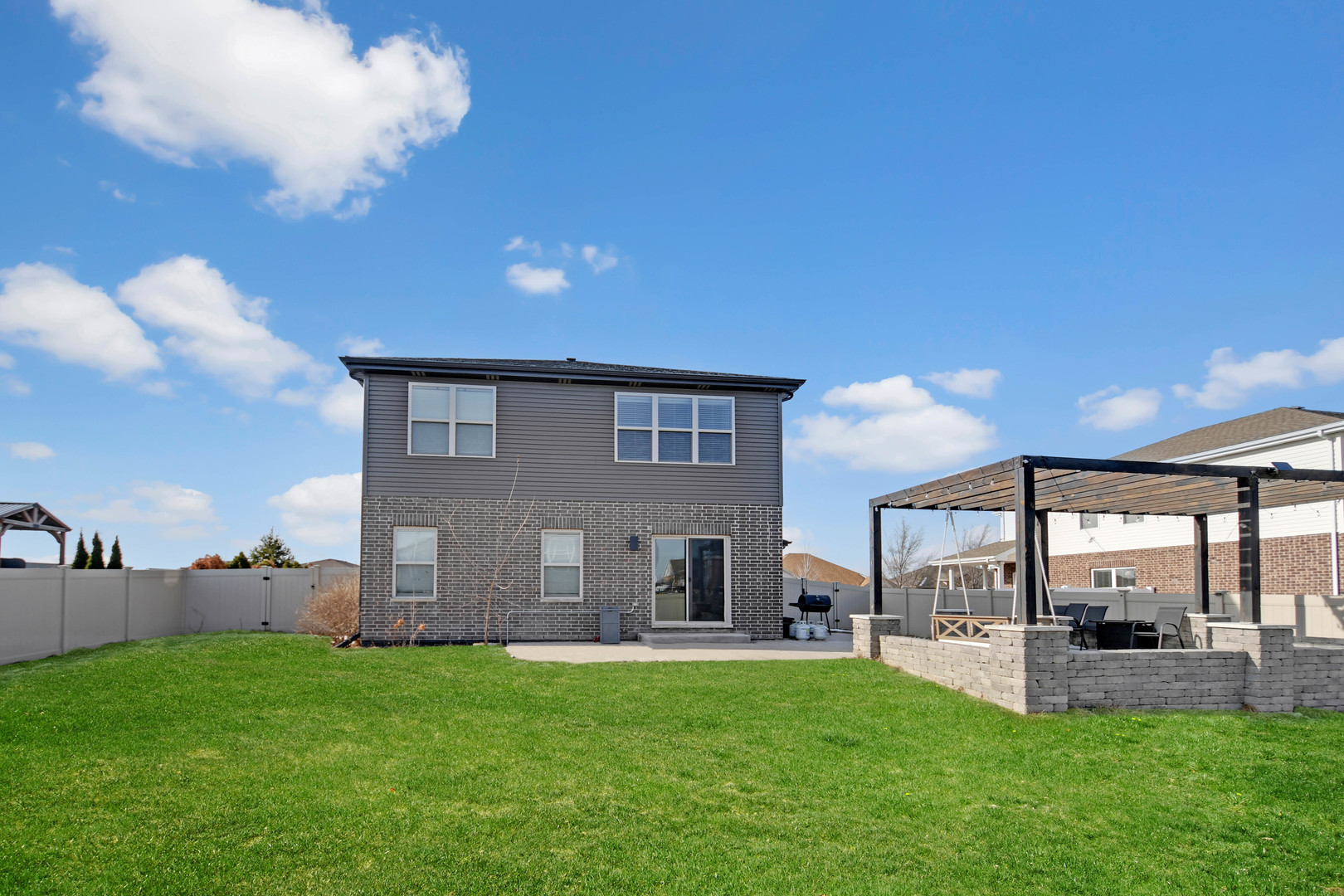 Free-flowing open design creates an immediate sense of space and comfort in this like-new, only 8-year-young, thoughtfully designed two-story home with finished basement, 3-car garage, and an outdoor setting ideal for gatherings. A charming wrap-around front porch welcomes you into a soaring two-story foyer leading to a spacious living area that flows seamlessly into the kitchen. The kitchen features rich dark cabinetry, quartz countertops, a large center island with breakfast-bar seating, farmhouse sink, and stainless steel appliance package including a gas range with modern vent hood and drawer-style microwave. Hardwood flooring and recessed and pendant lighting enhance the space for everyday living and entertaining. The dining area opens through patio doors to a fully privacy-fenced backyard offering excellent indoor/outdoor living. A large wrap-around concrete patio has been extended by a custom pergola-covered paver patio, ideal for outdoor dining and entertaining. The second floor offers three bedrooms plus a versatile loft. The primary suite includes a board-and-batten accent wall, sliding barn door, ensuite bathroom with frameless glass shower, double-sink vanity, and walk-in closet with custom organizers. All bathrooms feature modern tilework, vanities, and fixtures. The finished basement provides additional living and recreational space. Located in the desirable Benck’s Farm subdivision, this home offers the appeal of newer construction without additional monthly maintenance fees so schedule your viewing today.