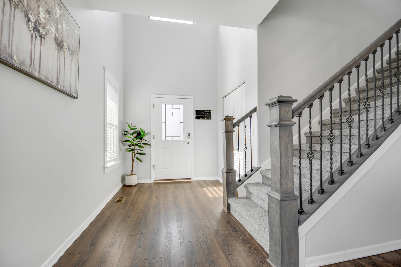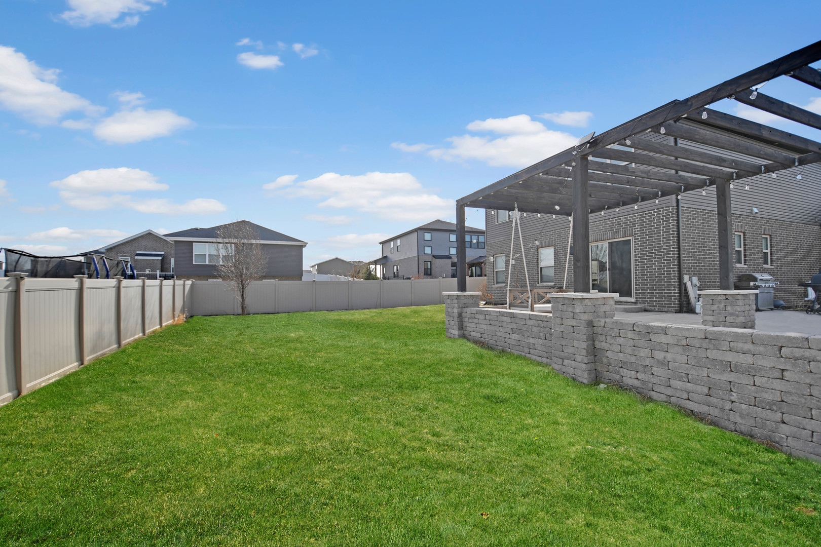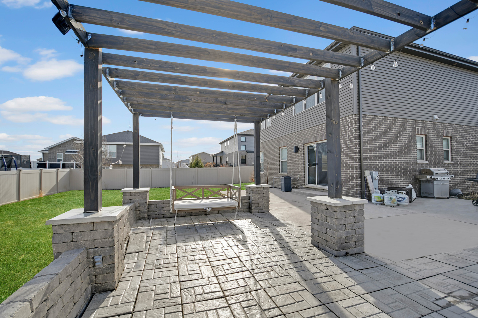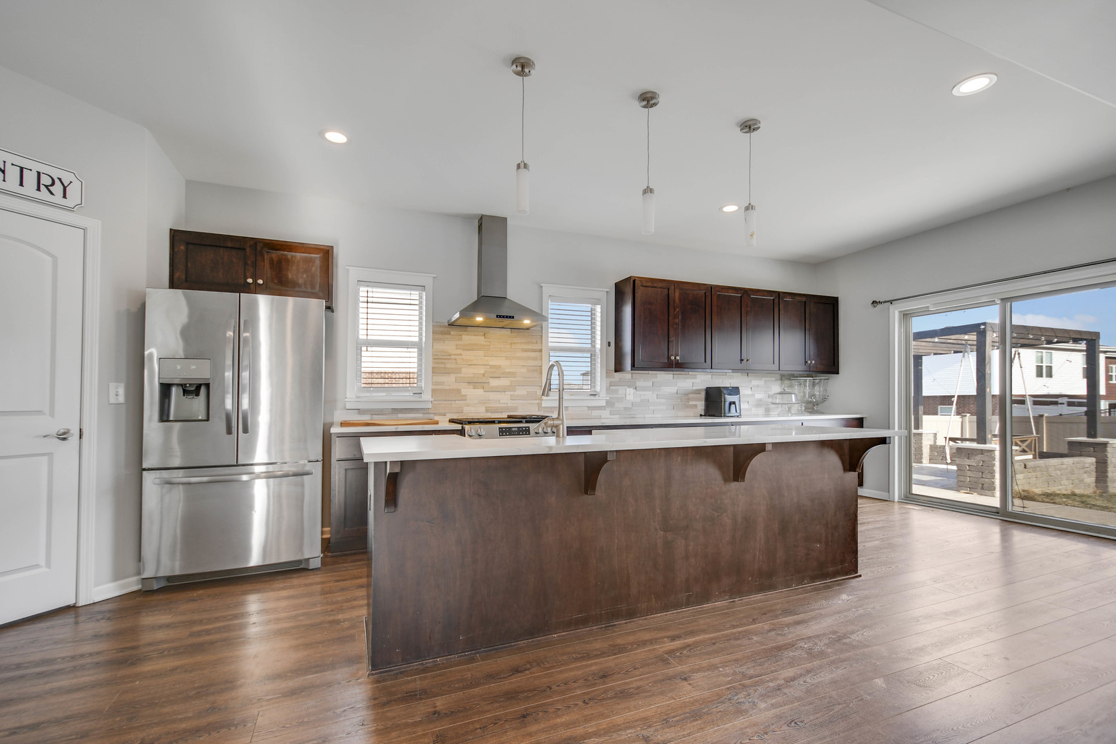 Free-flowing open design creates an immediate sense of space and comfort in this like-new, only 8-year-young, thoughtfully designed two-story home with finished basement, 3-car garage, and an outdoor setting ideal for gatherings. A charming wrap-around front porch welcomes you into a soaring two-story foyer leading to a spacious living area that flows seamlessly into the kitchen. The kitchen features rich dark cabinetry, quartz countertops, a large center island with breakfast-bar seating, farmhouse sink, and stainless steel appliance package including a gas range with modern vent hood and drawer-style microwave. Hardwood flooring and recessed and pendant lighting enhance the space for everyday living and entertaining. The dining area opens through patio doors to a fully privacy-fenced backyard offering excellent indoor/outdoor living. A large wrap-around concrete patio has been extended by a custom pergola-covered paver patio, ideal for outdoor dining and entertaining. The second floor offers three bedrooms plus a versatile loft. The primary suite includes a board-and-batten accent wall, sliding barn door, ensuite bathroom with frameless glass shower, double-sink vanity, and walk-in closet with custom organizers. All bathrooms feature modern tilework, vanities, and fixtures. The finished basement provides additional living and recreational space. Located in the desirable Benck’s Farm subdivision, this home offers the appeal of newer construction without additional monthly maintenance fees so schedule your viewing today.
