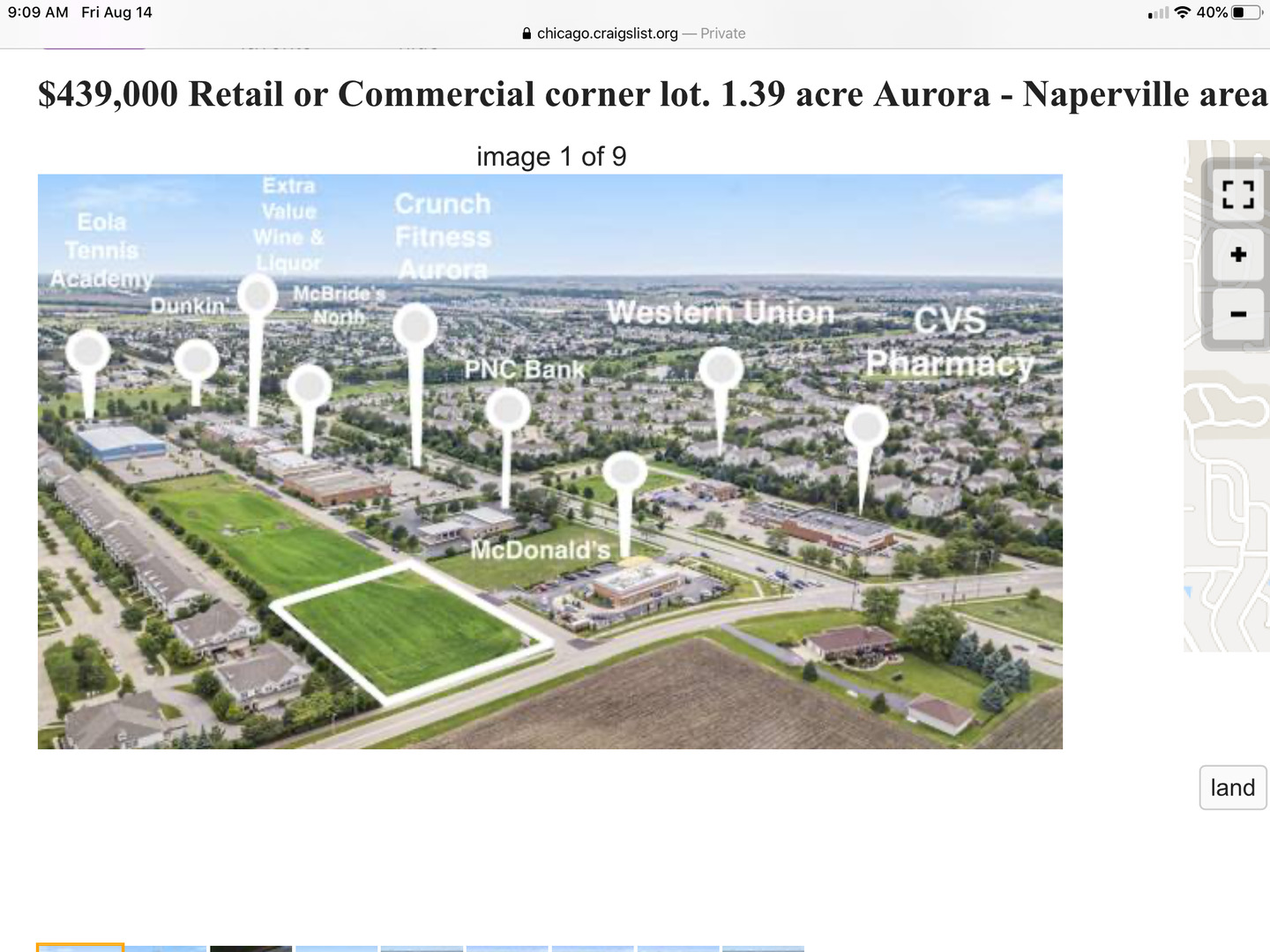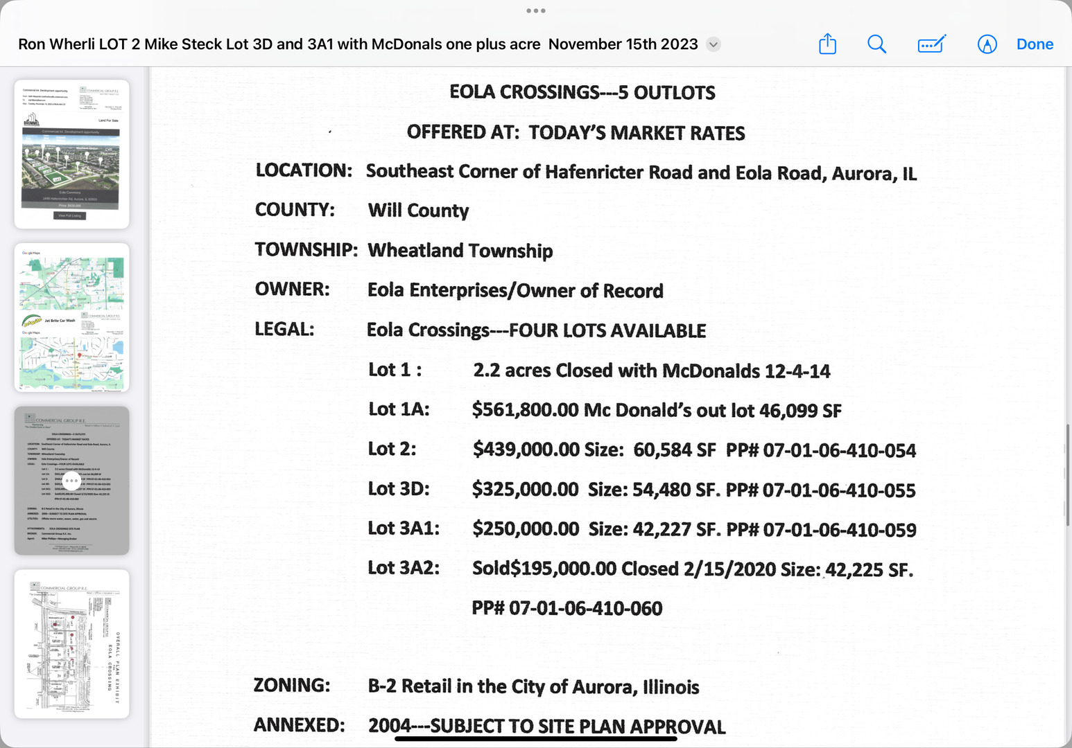 For Sale: Large fully improved 1.39 acre commercial corner lot next to McDonald’s! All utilities to site. Detention is in and offsite. Frontage on 2 roads. Suitable for most retail and commercial applications. Well positioned just off Eola Rd with easy access to Rt. 30, Rt. 34 and Rt. 59. Plenty of rooftops in the immediate area! Near schools and parks. Proposed uses may include professional or medical building, daycare, sports training, fitness, school, car wash, retail space and more. Bring your ideas here and grow in this vibrant area. Located in southeast Aurora near Naperville, Plainfield and Oswego. Oswego schools. Need a highly visible commercial building site with houses, schools, restaurants and other retailers nearby? Look no further… See and Compare! Price right for today’s market.