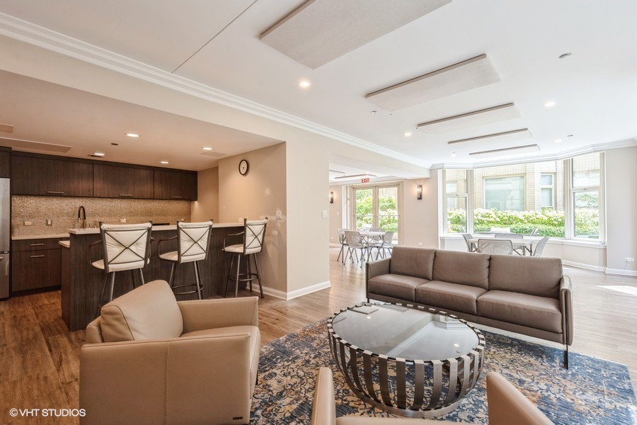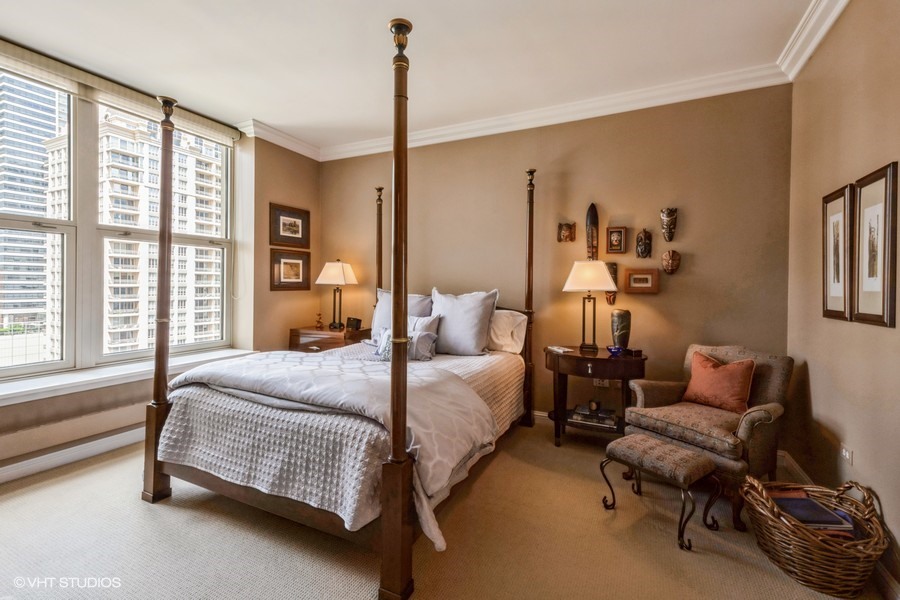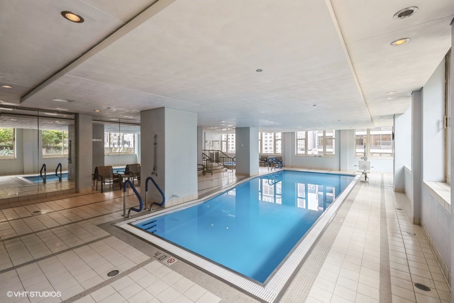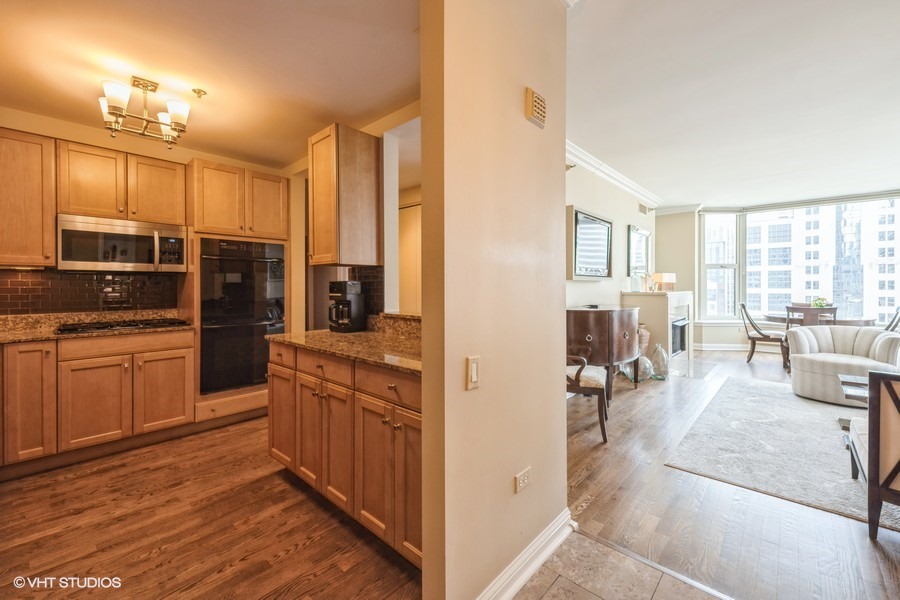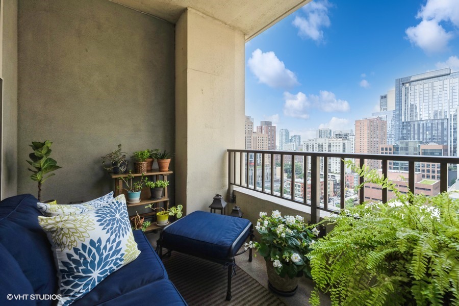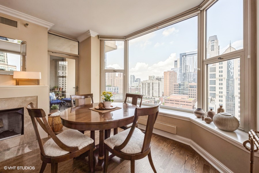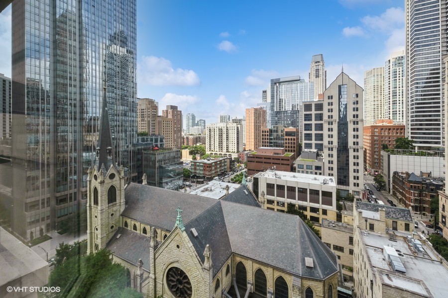 Welcome to your sanctuary in the sky-an elegant 2-bedroom, 2-bath residence designed for both lively entertaining and peaceful city escapes. Located at The Fordham, a full-service, luxury building, this split bedroom floor plan unit combines modern design with timeless comfort. Cooking is a pleasure in the open style kitchen, complete with granite counter tops, hardwood flooring, and a breakfast bar. Enjoy sweeping North & East views of Holy Name Cathedral, skyline, and lake from large windows that flood the space with natural light. Your private balcony, equipped with a gas line for outdoor grilling, is ideal for morning coffee or evening cocktails. The spacious living area features a cozy fireplace, perfect for relaxing after a long day. Generous walk-in closets and in-unit laundry add to everyday convenience. The Fordham has 24-hour security, doorperson service, dry cleaning, and a receiving room. Amenities to make your life here more enjoyable include: an outdoor garden and sundeck, wine cellar with private storage and lounge, a humidor room, indoor pool, fitness center, private theater, spa room, hospitality room, dog run, bike room and more. Shop designer boutiques along the Magnificent Mile, dine at four-star restaurants, sample the exciting nightlife and take in the cultural venues you only find in a world-class city. A secure, deeded parking space, in the attached garage, IS INCLUDED in the price. Whether you’re hosting guests or enjoying a quiet moment above the city, this unit offers the perfect balance of vibrancy and tranquility.