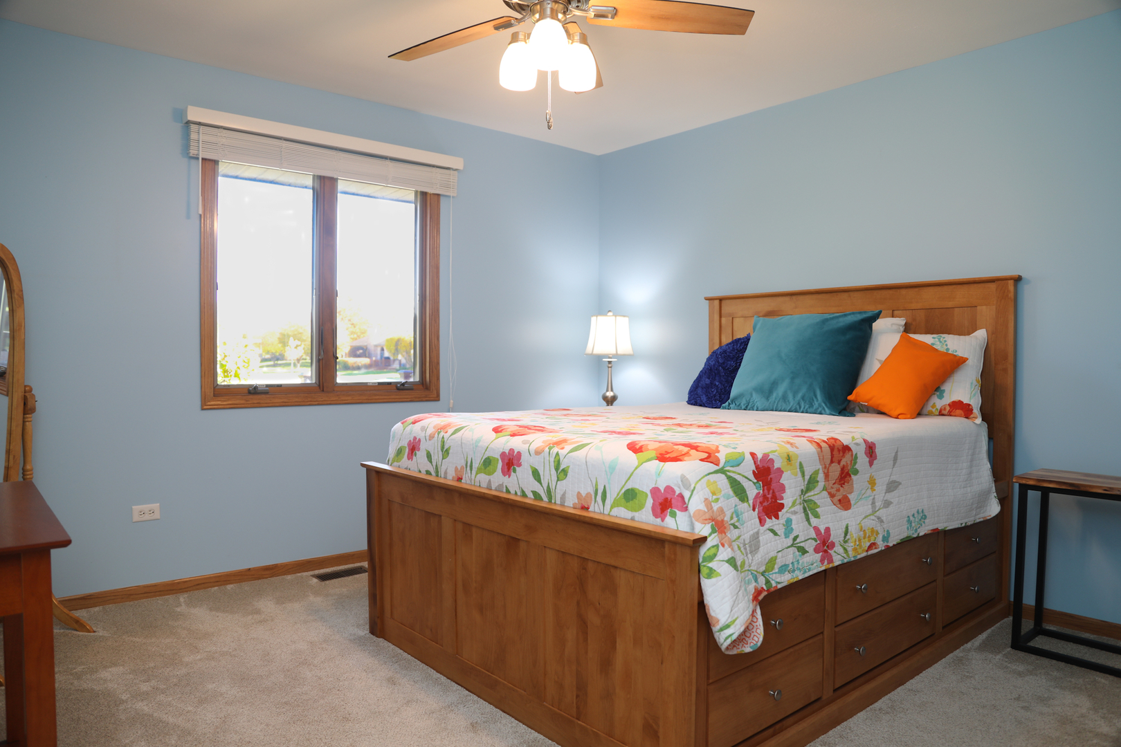 Beautifully maintained brick duplex located on a quiet cul-de-sac in the desirable Grand Prairie subdivision of New Lenox. This spacious corner-lot home offers incredible curb appeal with mature trees and a large side and backyard perfect for entertaining or relaxing outdoors. Inside, the open-concept layout features a generously sized living area with fresh carpet, a cozy fireplace, and plenty of natural light through classic wooden windows with tinting for added comfort. The updated kitchen includes quartz countertops, stainless steel appliances (2021-2022), a GE French door refrigerator, brushed nickel hardware, and modern lighting throughout. Additional features include Moen faucets, Delta showerheads, Hunter ceiling fans, and a jacuzzi tub for relaxing at the end of the day. Enjoy the newly built deck (2023) and take peace of mind knowing major mechanicals have been updated: roof (2016), furnace (2021), water heater (2021), and A/C (2018). This move-in ready home offers the perfect blend of updates, comfort, and long-term value.
