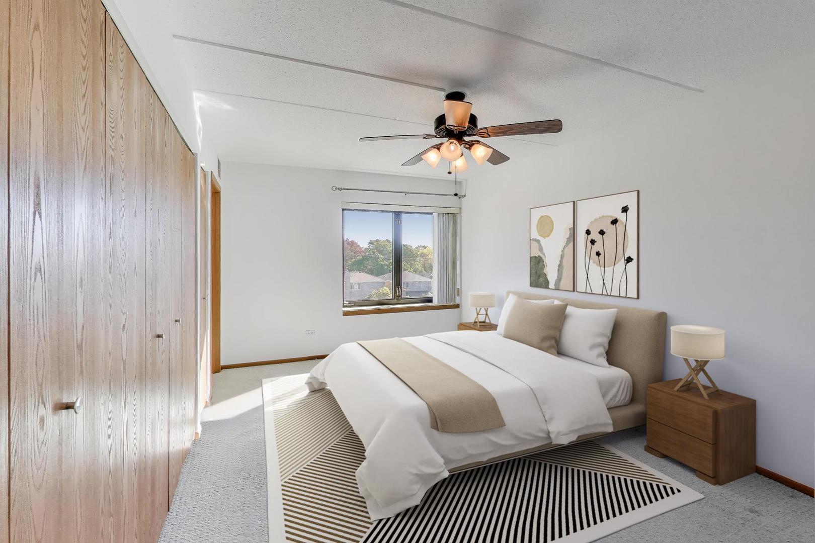 Come see this bright, spacious 2-bedroom, 2-bath corner unit with a balcony. Freshly painted. Open concept with Living Room/Dining Room combo has sliding glass doors to balcony. Kitchen has stainless steel appliances including a dishwasher and Breakfast Bar. Primary bedroom with en-suite bathroom. Great room sizes and closet space. Central Air, in-unit washer/dryer, and storage on the same floor. Very clean, well-maintained building. 2 elevators. Heated garage parking. Great Location. CLOSE TO HARLEM/IRVING PLAZA SHOPPING MALL. WALKING DISTANCE TO STORES, RESTAURANTS, AND SCHILLER WOODS FOREST PRESERVE. And the bus stop is outside the front door. Easy access to I-294, I-90/94 expressways- and O’Hare. No Dogs. Cats and Birds allowed. NO RENTALS