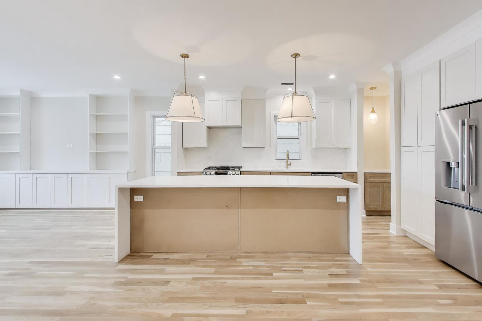 Be the first to live in this fully renovated Logan Square home! This full gut rehab offers brand-new everything from top to bottom – including plumbing, electrical, HVAC, roof, siding and windows. Featuring 5 bedrooms, 3.5 bathrooms with a luxurious primary suite with a walk-in closet. Additional highlights include, light oak wood floors, waterfall kitchen island, custom beverage station, wet bar, a separate mudroom, 2 laundry rooms, contemporary finishes, private yard and 2.5 car garage. This home blends modern comfort with timeless design. Conveniently located within walking distance to the Blue Line, and only steps from the vibrant Logan Square boulevard, cafes, and shops. Finishing touches are currently being completed and will be fully done prior to closing.