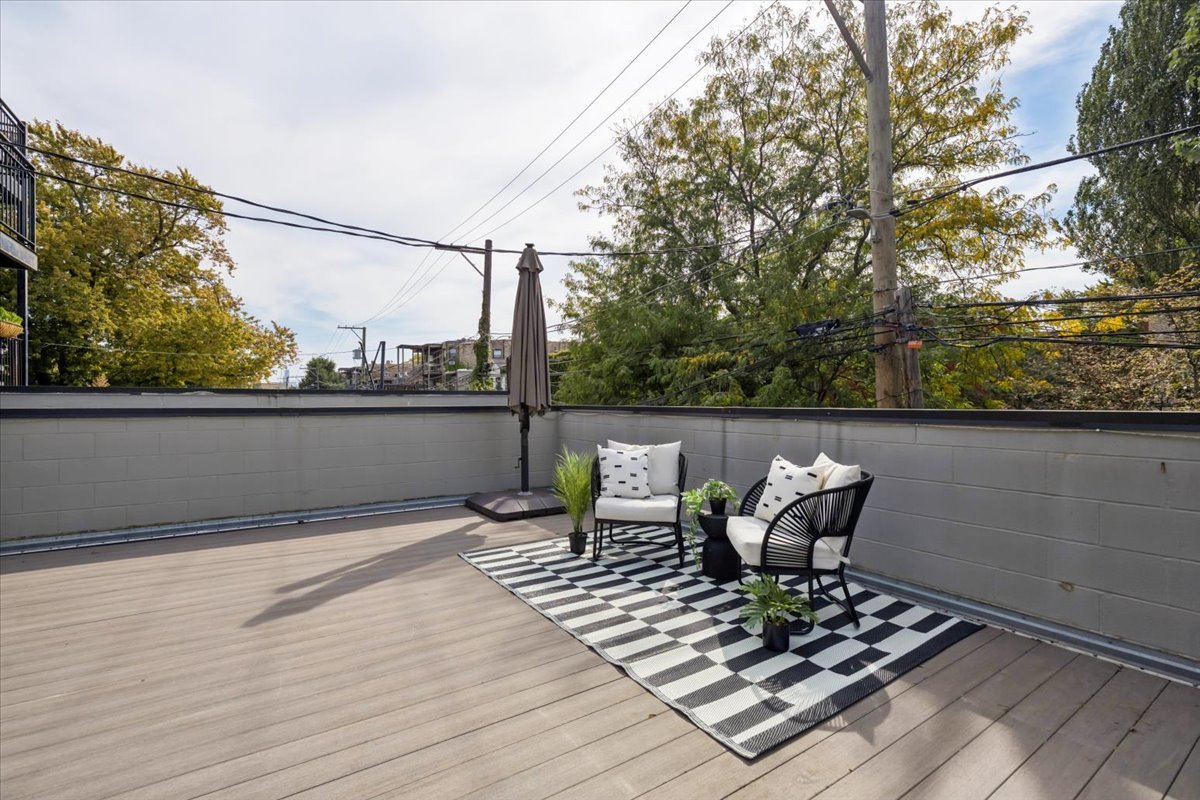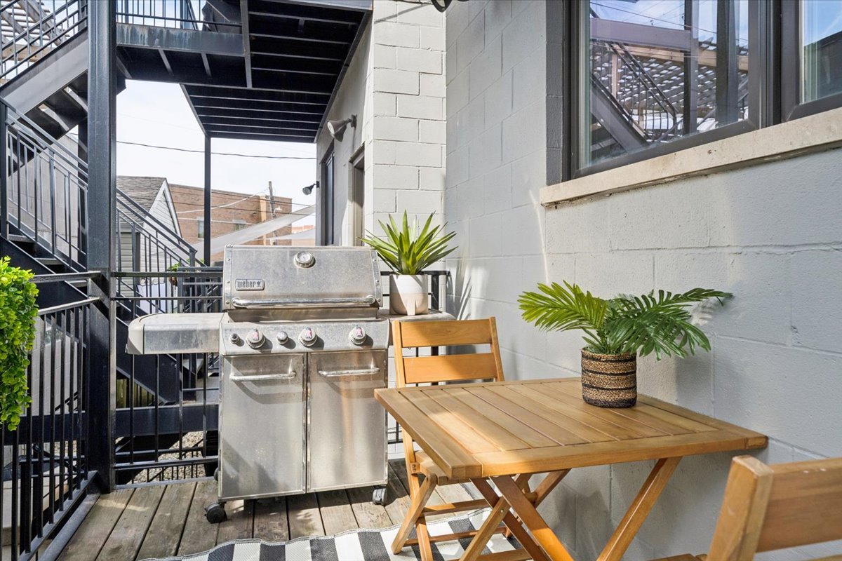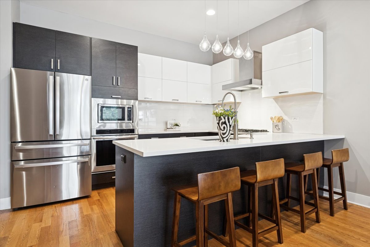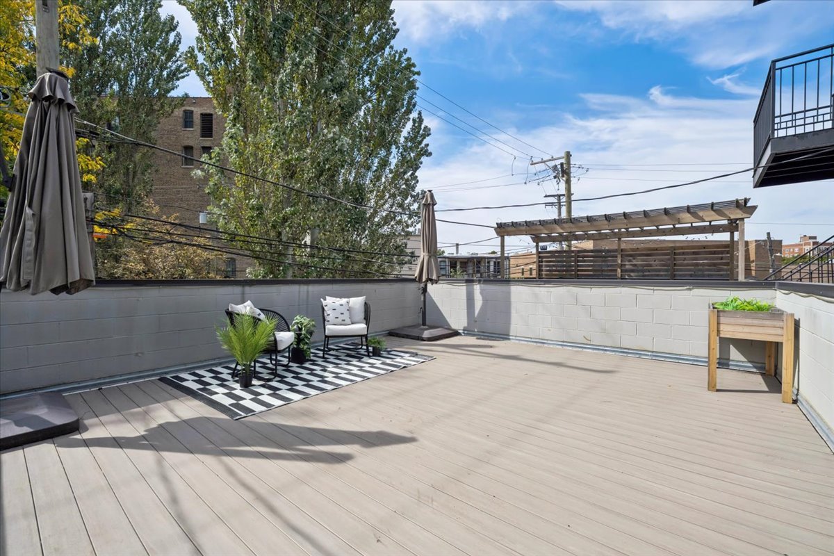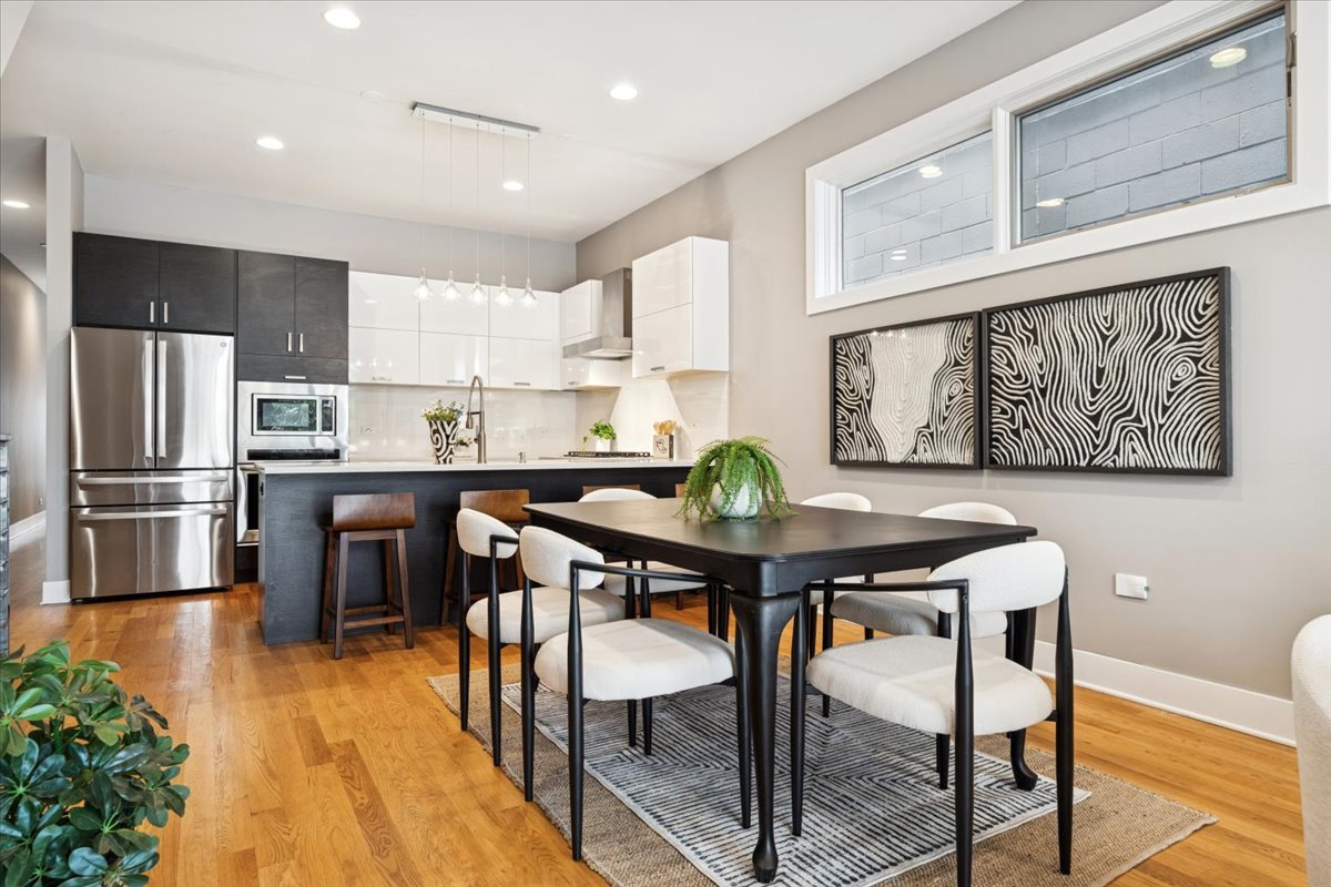 Welcome to this impeccably designed 3 bedroom, 2.5 bathroom duplex down condo located in an intimate 2-unit building, just steps from the heart of Logan Square. Offering over 2,400 square feet of thoughtfully curated living space, this home blends modern design with exceptional functionality. The main level is flooded with natural light thanks to east facing floor-to-ceiling windows and features an open-concept living and dining area – perfect for entertaining. The sleek, contemporary kitchen is a true showstopper, featuring two-tone flat-panel cabinetry, quartz countertops, Bosch stainless steel appliances, an exterior-vented hood, and a large peninsula island with seating. Down the hall, you’ll find a spacious pantry/coat closet, a chic powder room, and a serene primary suite boasting a professionally organized walk-in closet and a spa-like ensuite bathroom with floating dual vanity, soaking tub, and separate glass-enclosed shower. The carpeted lower level offers soaring 10-foot ceilings and a massive family room complete with a wet bar and beverage fridge – ideal for movie nights or hosting guests. Two generously sized bedrooms (one with a built-in Murphy bed), a full bathroom, a large laundry closet with side-by-side washer/dryer, and two additional storage closets complete this level. Enjoy the outdoors with two private spaces: a cozy covered rear deck and an expansive 400 sq ft garage roof deck with newer Trex decking – perfect for entertaining or relaxing. Garage parking is included. Additional highlights include: 8′ solid core doors, hardwood flooring on the main level, professionally organized closets throughout, incredible location just minutes from Logan Square’s best dining, shopping, parks, and Blue Line This move-in ready home offers the perfect blend of style, space, and location.