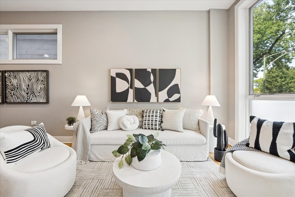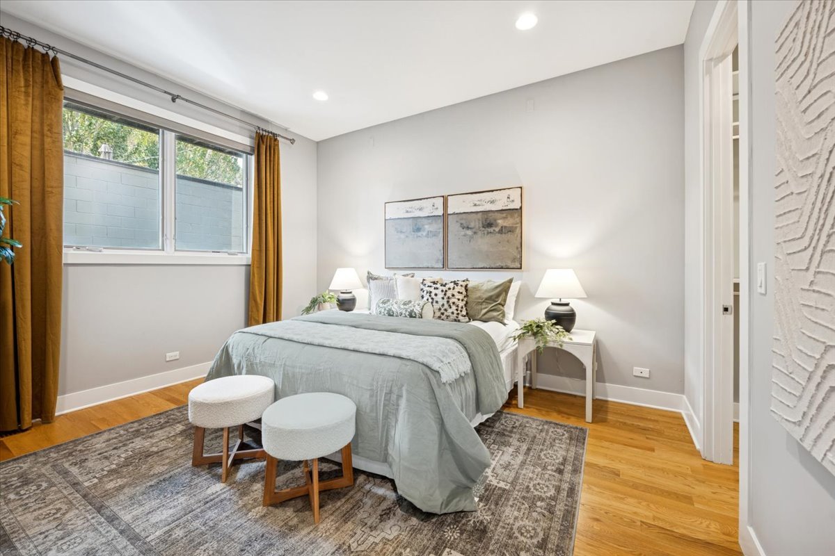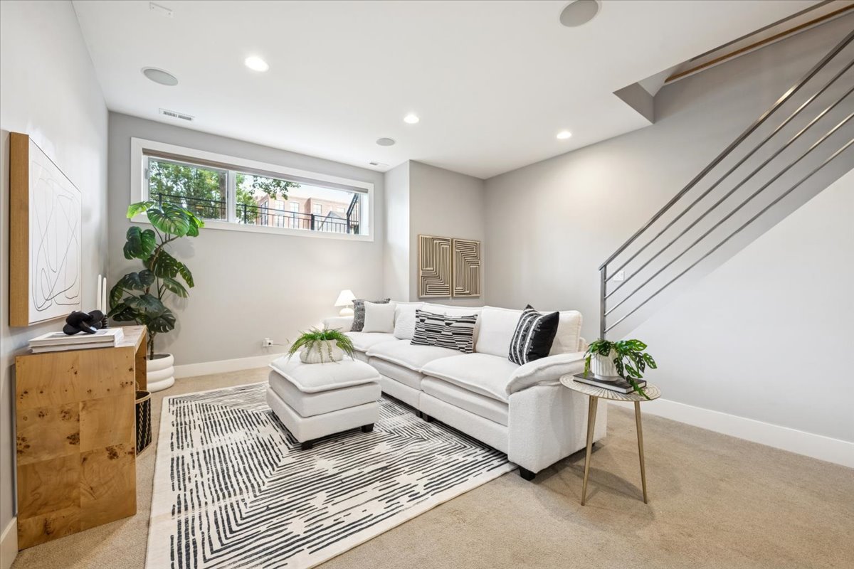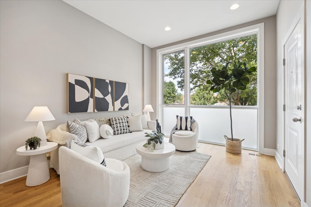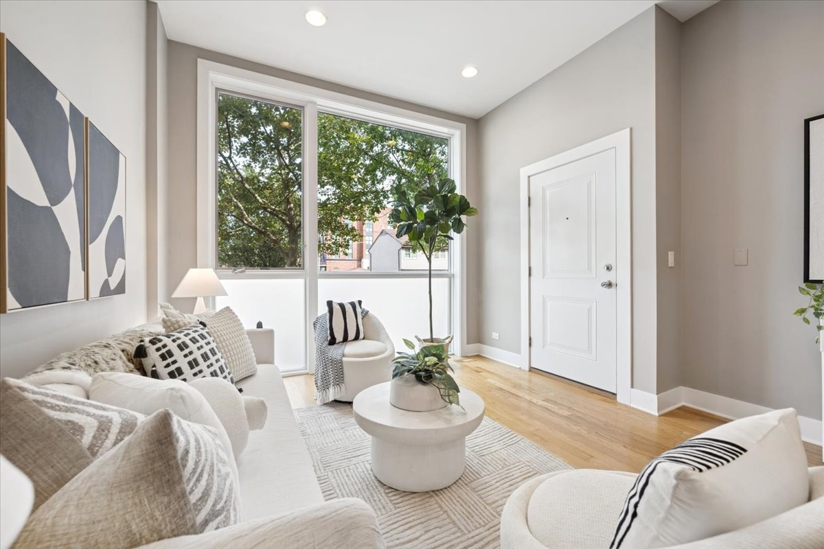 Welcome to this impeccably designed 3 bedroom, 2.5 bathroom duplex down condo located in an intimate 2-unit building, just steps from the heart of Logan Square. Offering over 2,400 square feet of thoughtfully curated living space, this home blends modern design with exceptional functionality. The main level is flooded with natural light thanks to east facing floor-to-ceiling windows and features an open-concept living and dining area – perfect for entertaining. The sleek, contemporary kitchen is a true showstopper, featuring two-tone flat-panel cabinetry, quartz countertops, Bosch stainless steel appliances, an exterior-vented hood, and a large peninsula island with seating. Down the hall, you’ll find a spacious pantry/coat closet, a chic powder room, and a serene primary suite boasting a professionally organized walk-in closet and a spa-like ensuite bathroom with floating dual vanity, soaking tub, and separate glass-enclosed shower. The carpeted lower level offers soaring 10-foot ceilings and a massive family room complete with a wet bar and beverage fridge – ideal for movie nights or hosting guests. Two generously sized bedrooms (one with a built-in Murphy bed), a full bathroom, a large laundry closet with side-by-side washer/dryer, and two additional storage closets complete this level. Enjoy the outdoors with two private spaces: a cozy covered rear deck and an expansive 400 sq ft garage roof deck with newer Trex decking – perfect for entertaining or relaxing. Garage parking is included. Additional highlights include: 8′ solid core doors, hardwood flooring on the main level, professionally organized closets throughout, incredible location just minutes from Logan Square’s best dining, shopping, parks, and Blue Line This move-in ready home offers the perfect blend of style, space, and location.