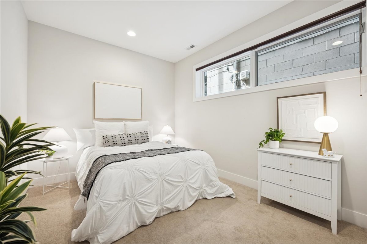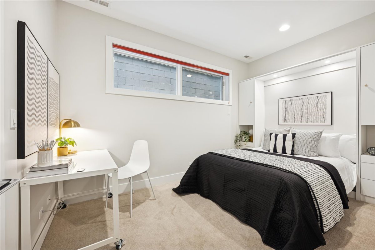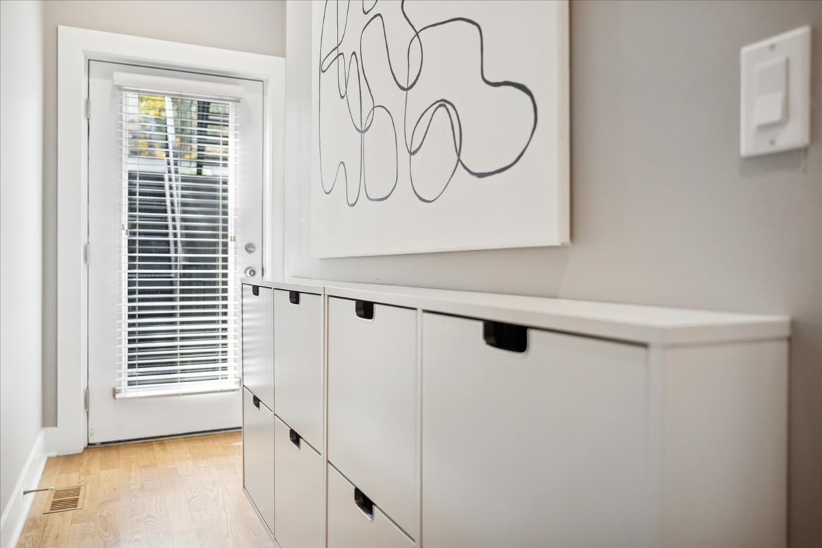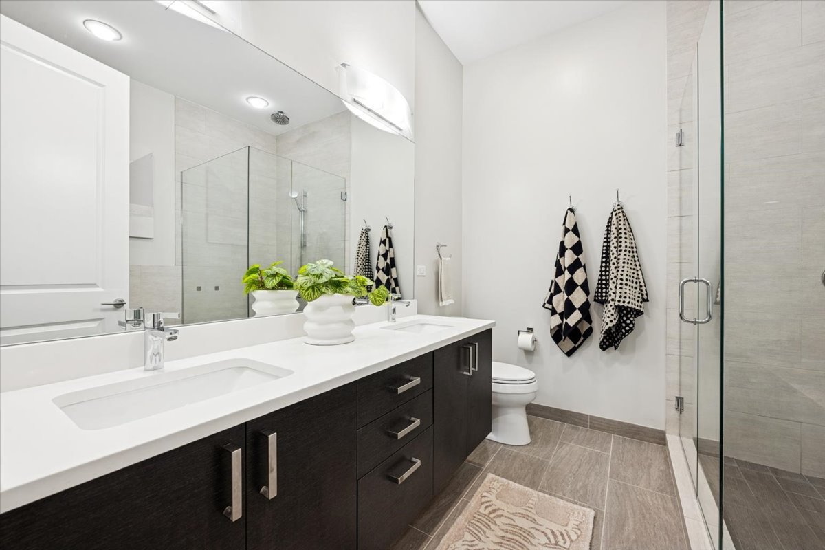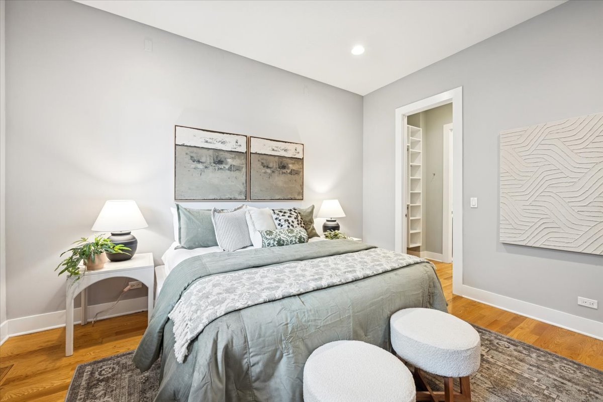 Welcome to this impeccably designed 3 bedroom, 2.5 bathroom duplex down condo located in an intimate 2-unit building, just steps from the heart of Logan Square. Offering over 2,400 square feet of thoughtfully curated living space, this home blends modern design with exceptional functionality. The main level is flooded with natural light thanks to east facing floor-to-ceiling windows and features an open-concept living and dining area – perfect for entertaining. The sleek, contemporary kitchen is a true showstopper, featuring two-tone flat-panel cabinetry, quartz countertops, Bosch stainless steel appliances, an exterior-vented hood, and a large peninsula island with seating. Down the hall, you’ll find a spacious pantry/coat closet, a chic powder room, and a serene primary suite boasting a professionally organized walk-in closet and a spa-like ensuite bathroom with floating dual vanity, soaking tub, and separate glass-enclosed shower. The carpeted lower level offers soaring 10-foot ceilings and a massive family room complete with a wet bar and beverage fridge – ideal for movie nights or hosting guests. Two generously sized bedrooms (one with a built-in Murphy bed), a full bathroom, a large laundry closet with side-by-side washer/dryer, and two additional storage closets complete this level. Enjoy the outdoors with two private spaces: a cozy covered rear deck and an expansive 400 sq ft garage roof deck with newer Trex decking – perfect for entertaining or relaxing. Garage parking is included. Additional highlights include: 8′ solid core doors, hardwood flooring on the main level, professionally organized closets throughout, incredible location just minutes from Logan Square’s best dining, shopping, parks, and Blue Line This move-in ready home offers the perfect blend of style, space, and location.