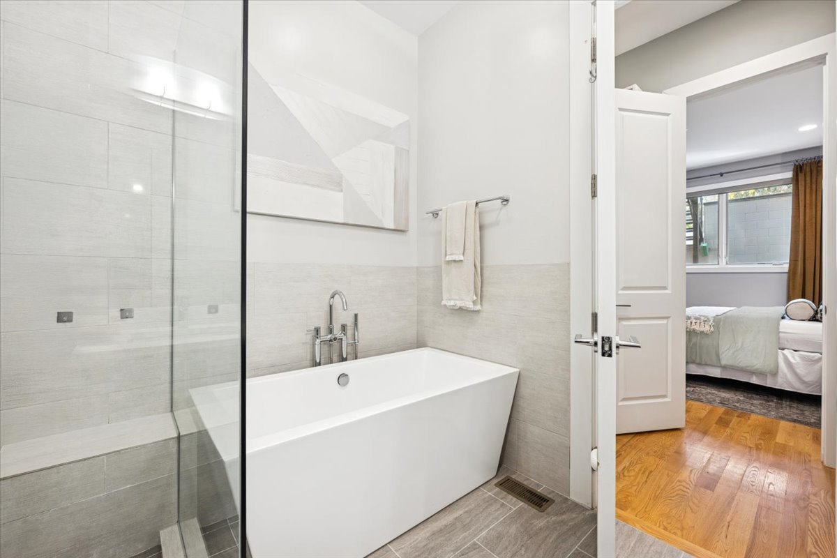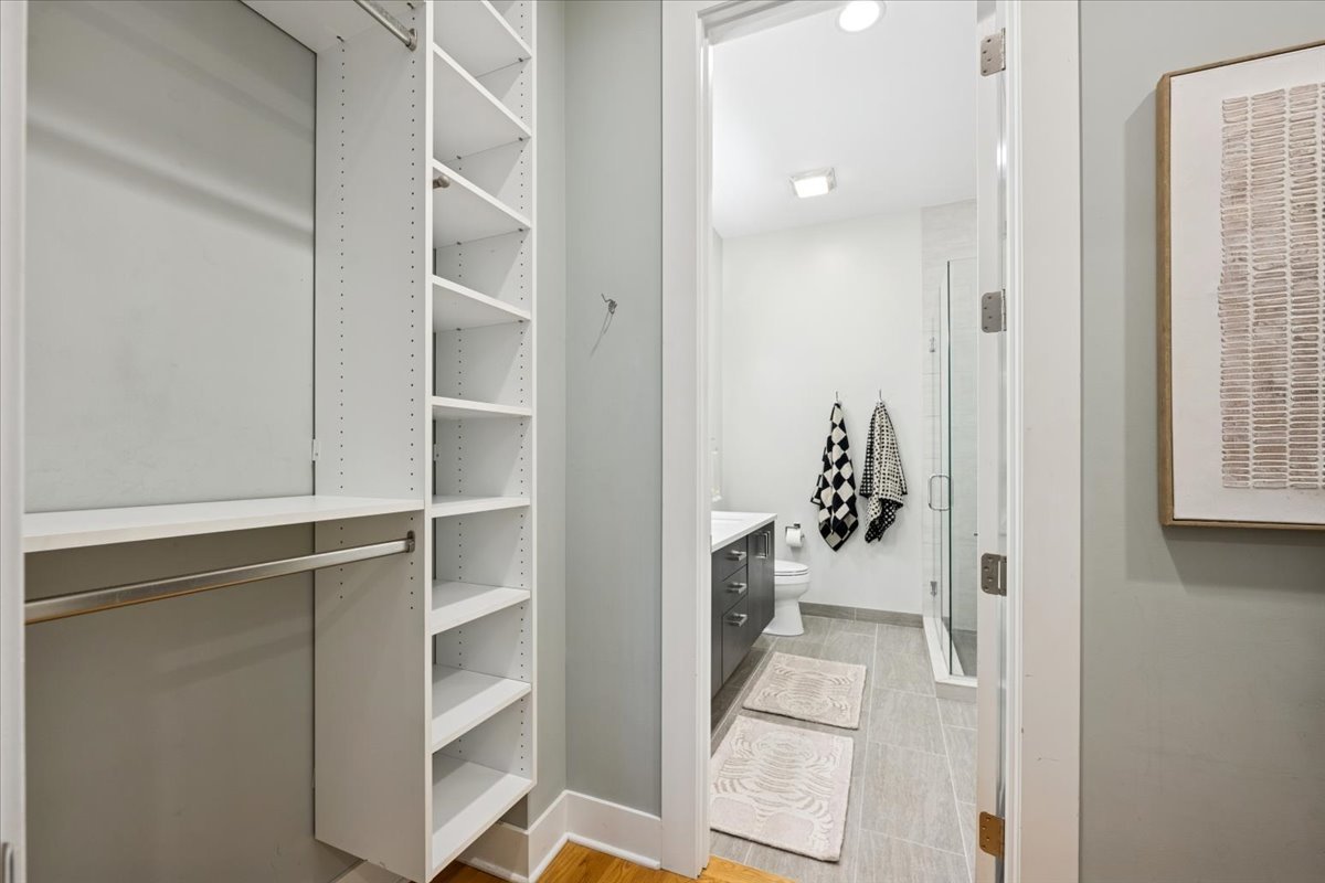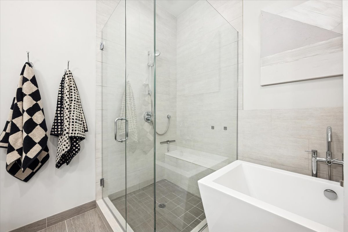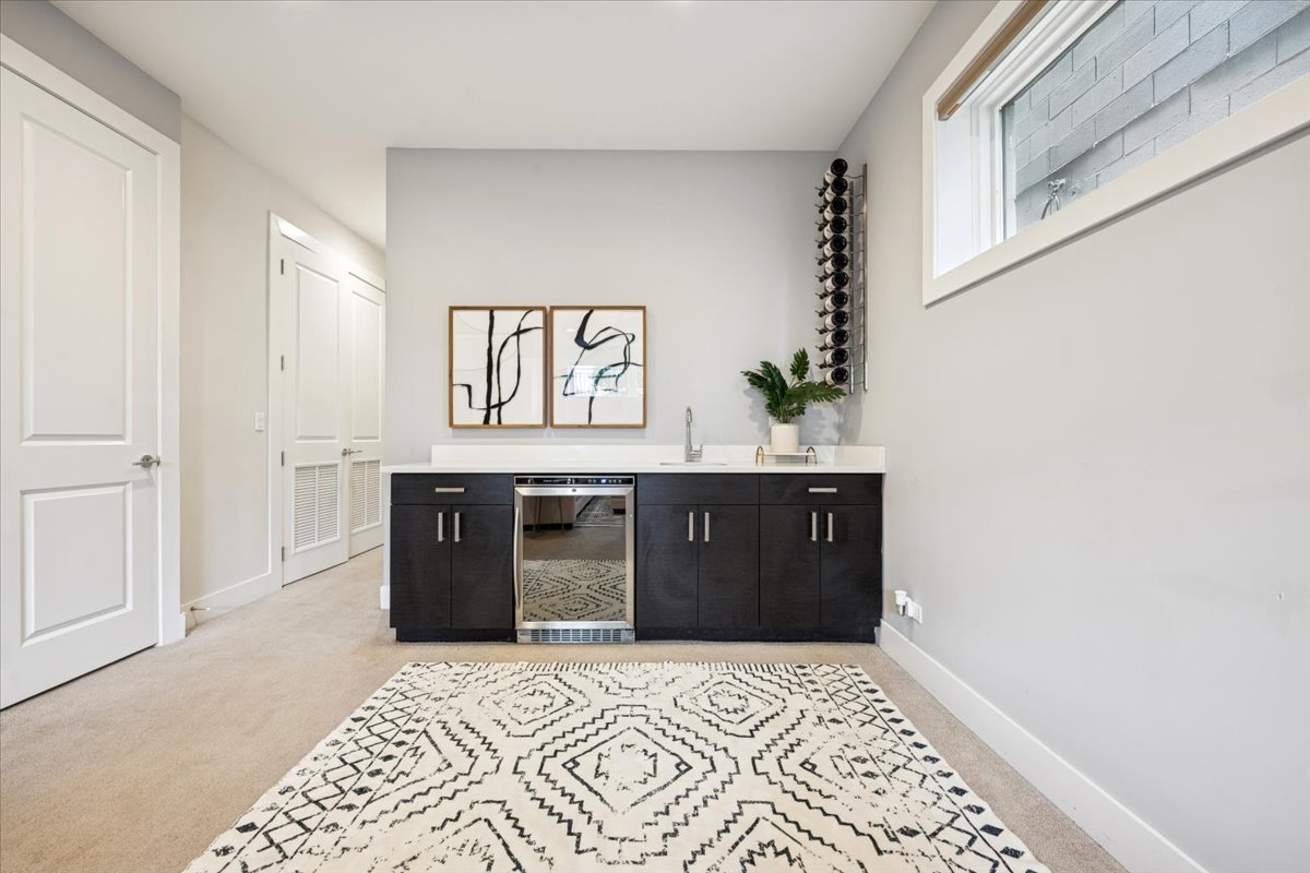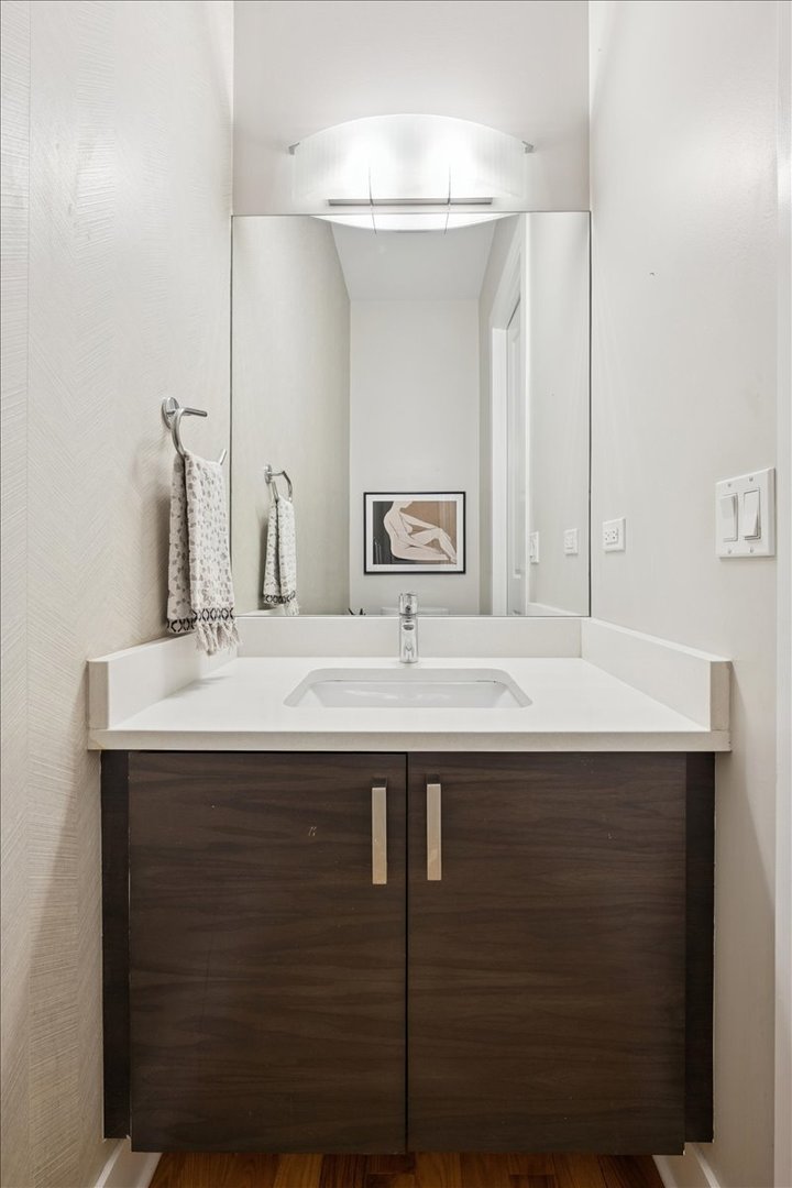 Welcome to this impeccably designed 3 bedroom, 2.5 bathroom duplex down condo located in an intimate 2-unit building, just steps from the heart of Logan Square. Offering over 2,400 square feet of thoughtfully curated living space, this home blends modern design with exceptional functionality. The main level is flooded with natural light thanks to east facing floor-to-ceiling windows and features an open-concept living and dining area – perfect for entertaining. The sleek, contemporary kitchen is a true showstopper, featuring two-tone flat-panel cabinetry, quartz countertops, Bosch stainless steel appliances, an exterior-vented hood, and a large peninsula island with seating. Down the hall, you’ll find a spacious pantry/coat closet, a chic powder room, and a serene primary suite boasting a professionally organized walk-in closet and a spa-like ensuite bathroom with floating dual vanity, soaking tub, and separate glass-enclosed shower. The carpeted lower level offers soaring 10-foot ceilings and a massive family room complete with a wet bar and beverage fridge – ideal for movie nights or hosting guests. Two generously sized bedrooms (one with a built-in Murphy bed), a full bathroom, a large laundry closet with side-by-side washer/dryer, and two additional storage closets complete this level. Enjoy the outdoors with two private spaces: a cozy covered rear deck and an expansive 400 sq ft garage roof deck with newer Trex decking – perfect for entertaining or relaxing. Garage parking is included. Additional highlights include: 8′ solid core doors, hardwood flooring on the main level, professionally organized closets throughout, incredible location just minutes from Logan Square’s best dining, shopping, parks, and Blue Line This move-in ready home offers the perfect blend of style, space, and location.