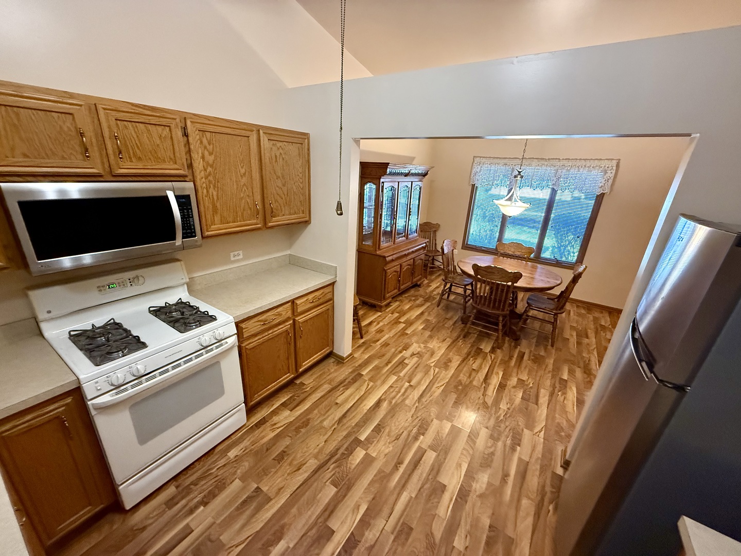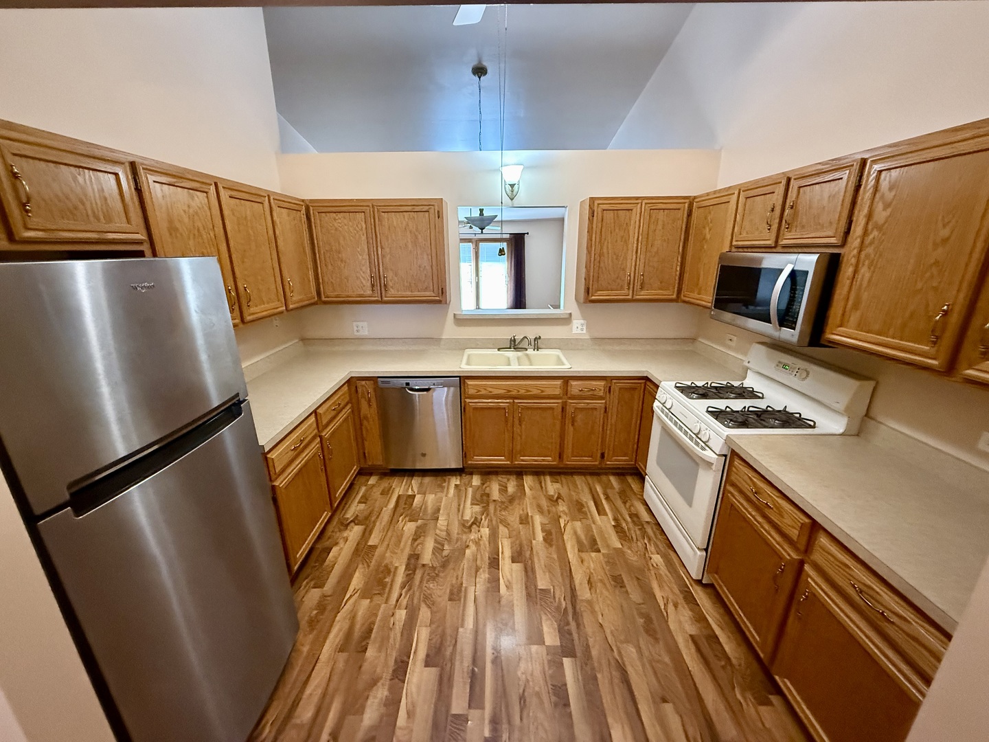 Step into this bright and inviting condo featuring fresh paint throughout, vaulted ceilings, and an open floor plan perfect for modern living. The kitchen is equipped with a new refrigerator, dishwasher, and microwave, while the laundry area includes a washer and dryer for added convenience. Enjoy outdoor living on the updated composite deck, ideal for entertaining or relaxing. A two-car attached garage provides ample storage and convenience. Located in the sought-after Fairway Estates II community, this home blends comfort, style, and functionality-ready for you to move right in! Make your appointment today!