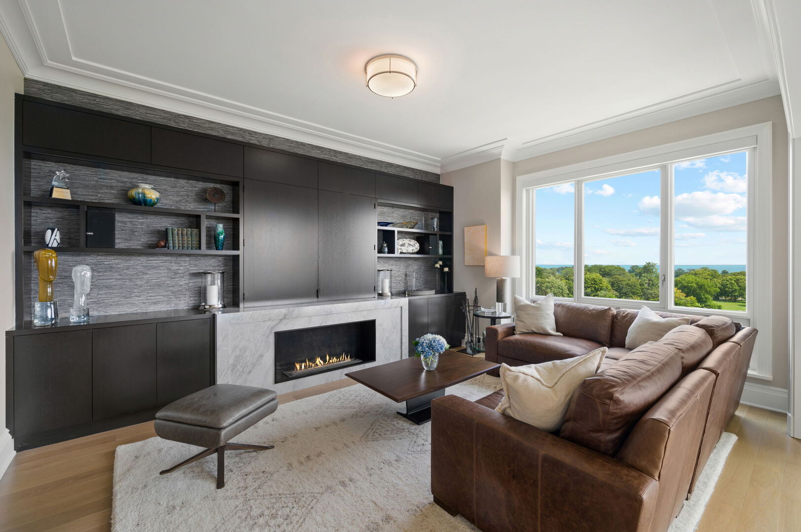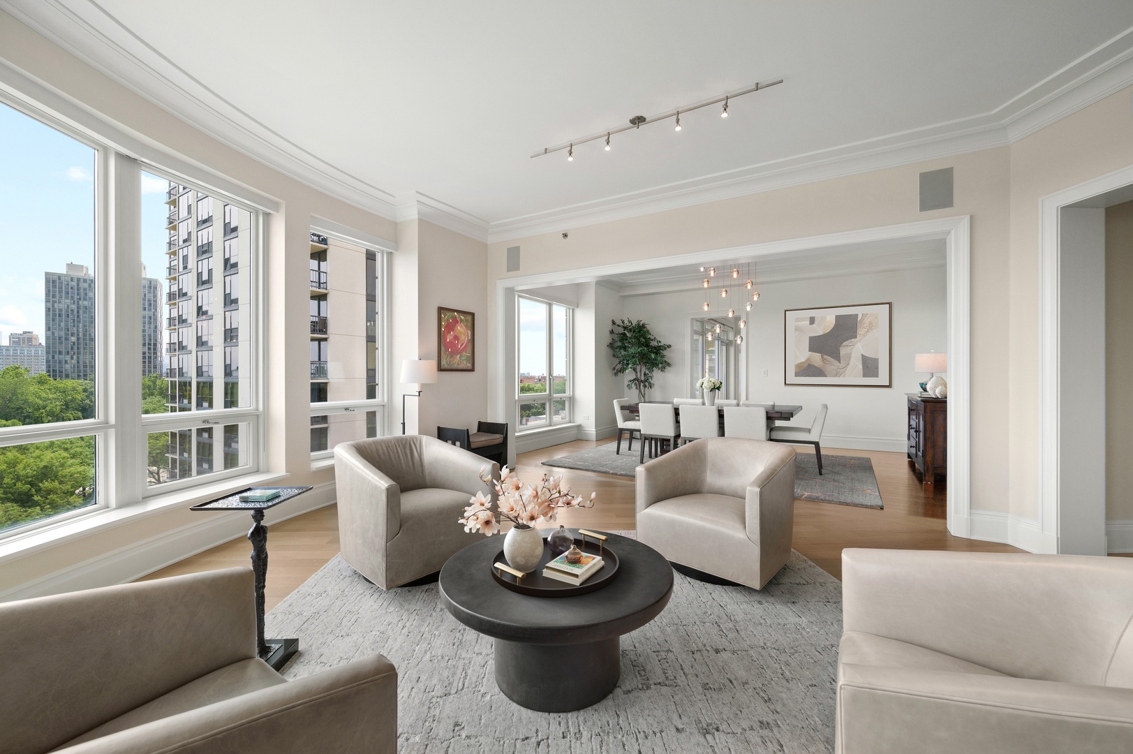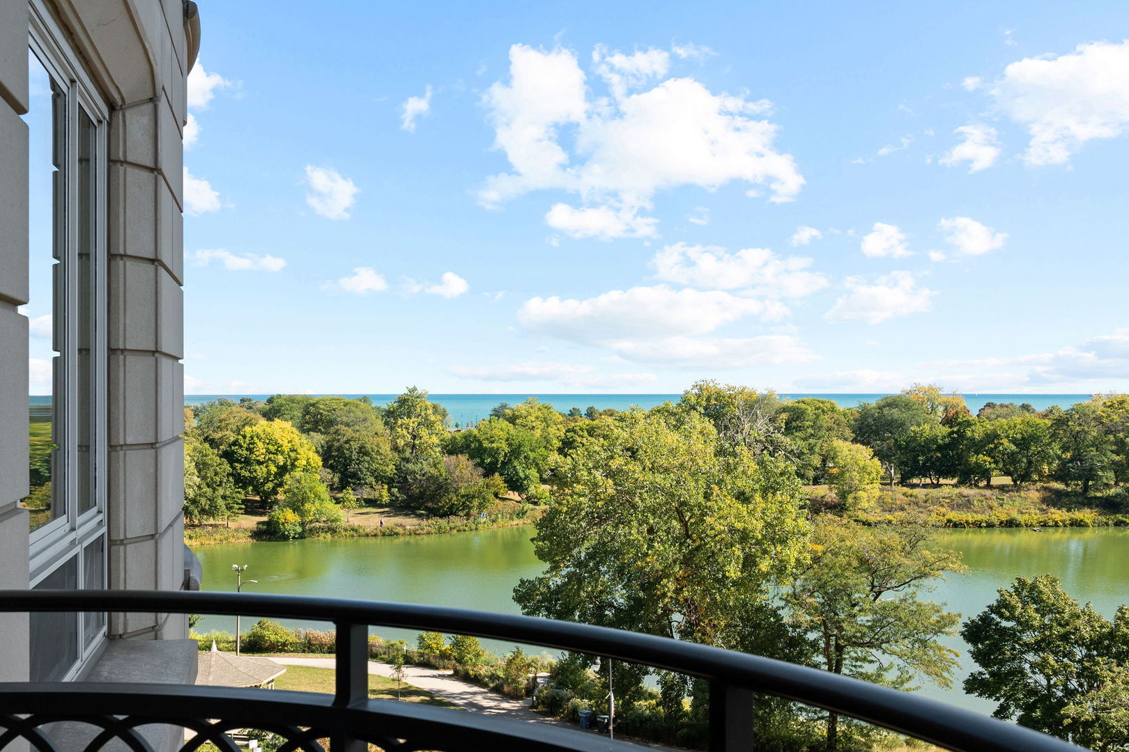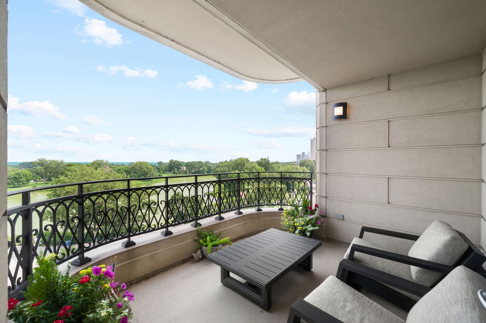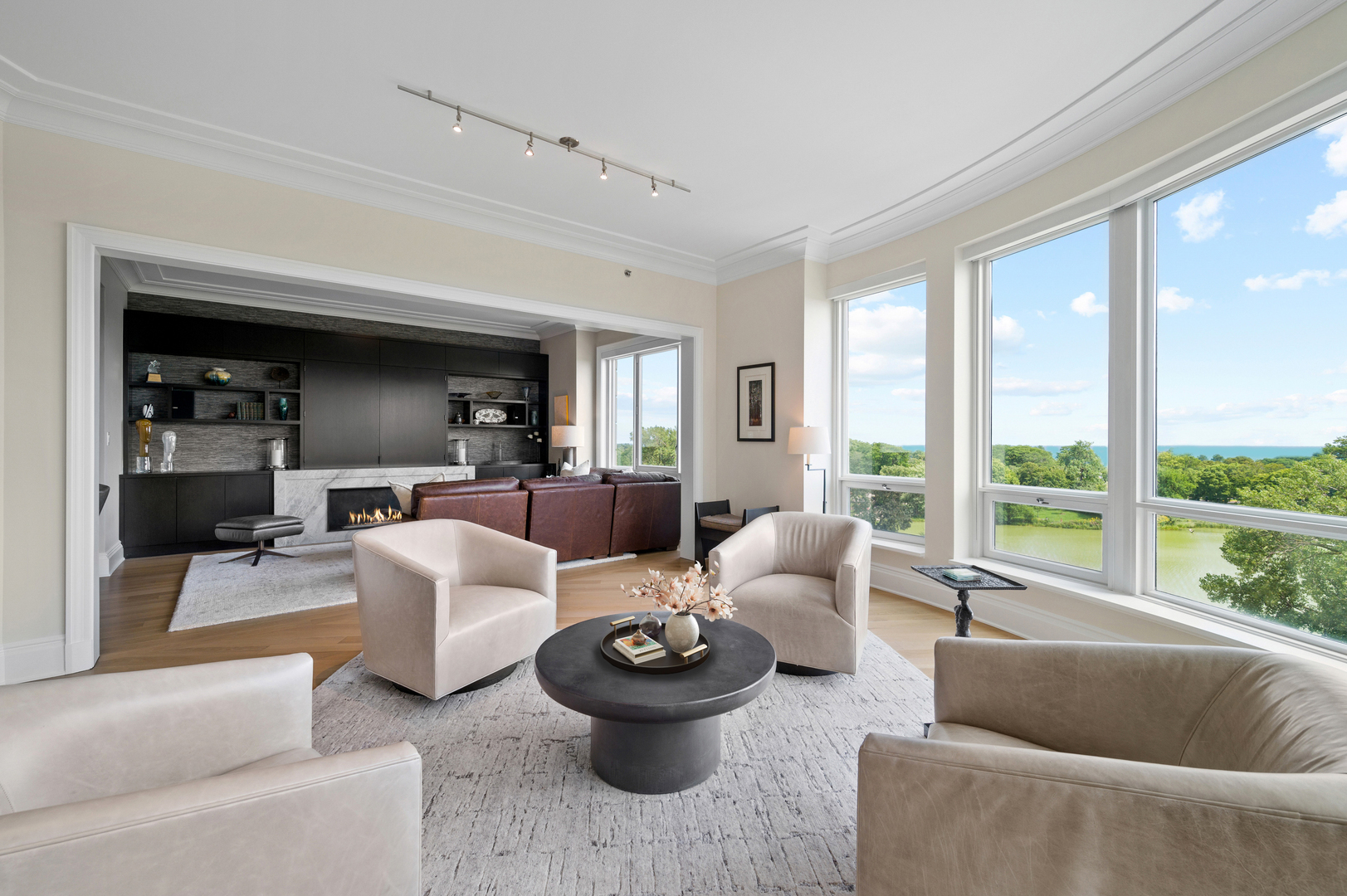 Residence S701, a Southeast corner 3 bedroom/3.1 bathroom home in the highly coveted, Lucien LaGrange-designed, Lincoln Park 2550. This remarkable home offers 4,000 square feet of thoughtfully designed living space, picturesque views from three terraces, and best-in-class amenities. Throughout the home – one of the largest in the building – floor-to-ceiling windows offer family and guests breathtaking and panoramic views of Lake Michigan, Lincoln Park, North Pond, and the Chicago skyline – views that change with the seasons and shift with the day’s light. Inside the home, floor-to-ceiling windows bathe the interior spaces with light, inviting the natural beauty of the outdoors in. The focal point of the large formal living room is once again the view, this time visible through a bright wall of windows that curve the entire width of the space and amplify the 180-degree cityscape. The adjoining den and large dining room are clearly defined spaces, but are capable together of accommodating a large gathering. Sophisticated and elegant finishes are found throughout the home including the kitchen which features Caesarstone quartz countertops with island seating, customized Snaidero cabinetry and top of the line appliances including Subzero, Wolf, and two Miele dishwashers. The pass through butler’s pantry adds storage, a wet bar, and temperature controlled wine storage. The south terrace, accessible from the kitchen, has gas grill hook-up and is large enough for a seated meal. Stepping off the kitchen, a comfortably sized family room provides the perfect setting for a relaxing evening or enjoy sunsets on the western terrace. The largest of the three, this 44×12-foot covered terrace overlooks the stunning manicured gardens and fountain within the 1.5-acre gated, private park. Back inside, the substantial primary bedroom is a peaceful retreat and includes its own east facing terrace, two walk-in closets, and spa-quality bathroom with dual vanity sinks, great storage, soaking tub, and an aromatherapy steam shower. Two additional bedrooms, both ensuite with private bathrooms and walk-in closets make perfect sanctuaries for family or guests. Key features throughout this large-scale home include: wide plank oak flooring, custom millwork and built-ins, smart home technology with centralized media and climate control, built-in speakers, programmable lighting, and Lutron shades. Residents of the building enjoy exceptional amenities: indoor pool with sundeck, top-of-the-line fitness center, sauna and steam rooms, movie theater, newly renovated party/event room with amazing kitchen, game and billiards room, massage rooms, on-site dry cleaner, dog run, private playground and an exceptional team of 24/7 door staff. Two large storage spaces and two parking spots with guest passes and optional valet service are included.