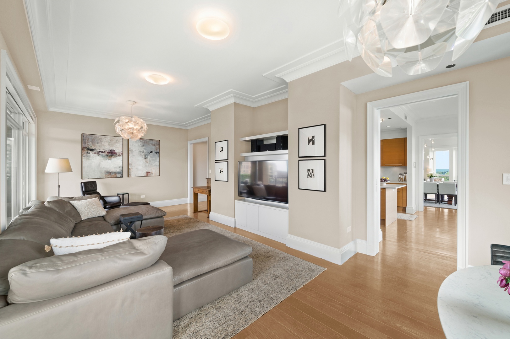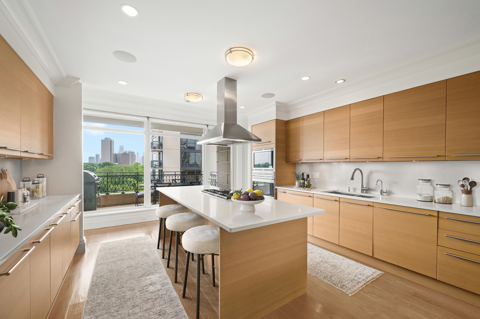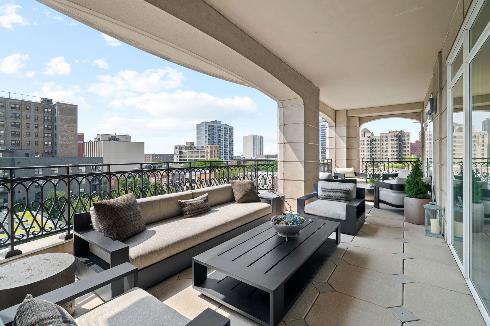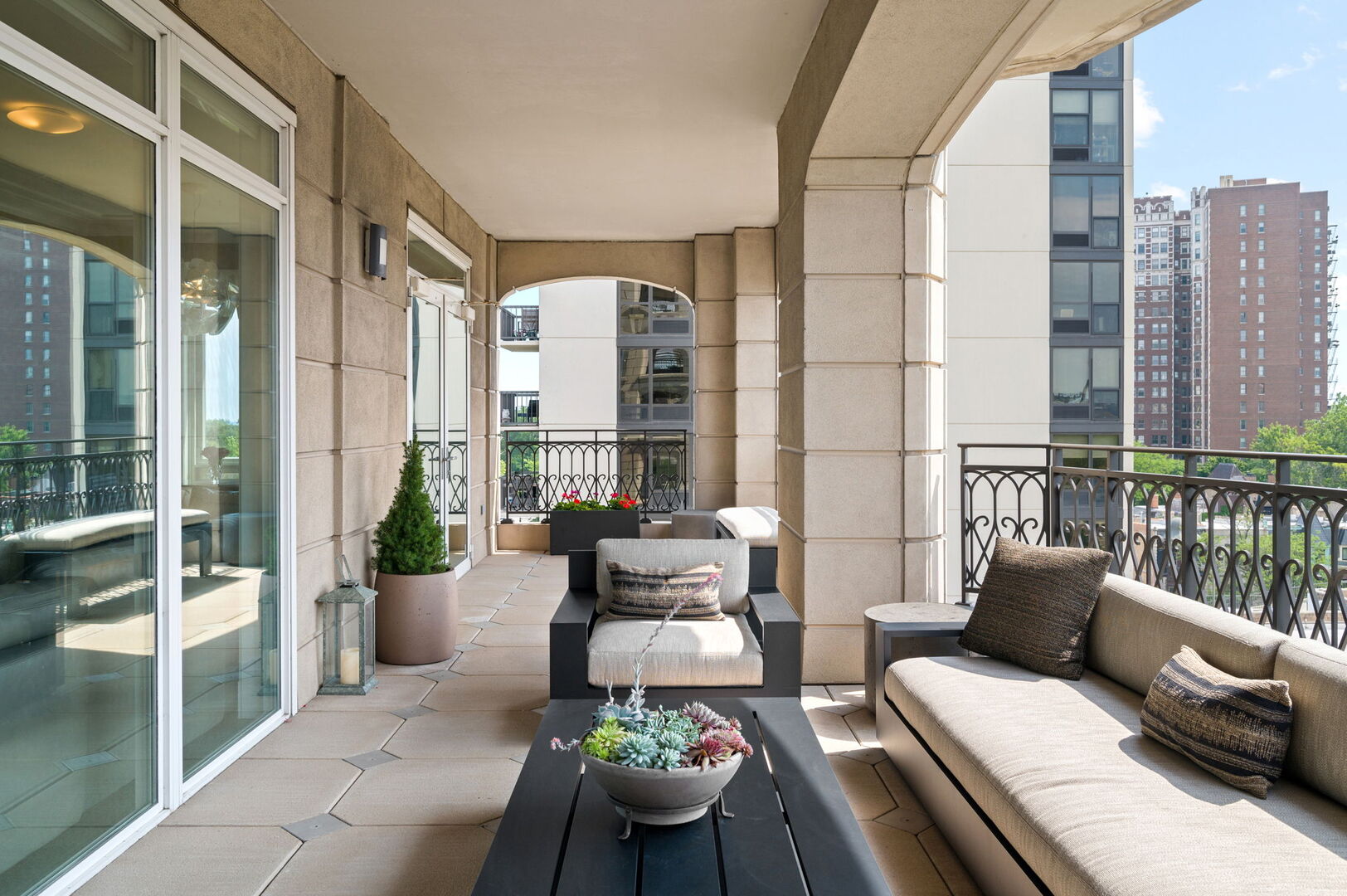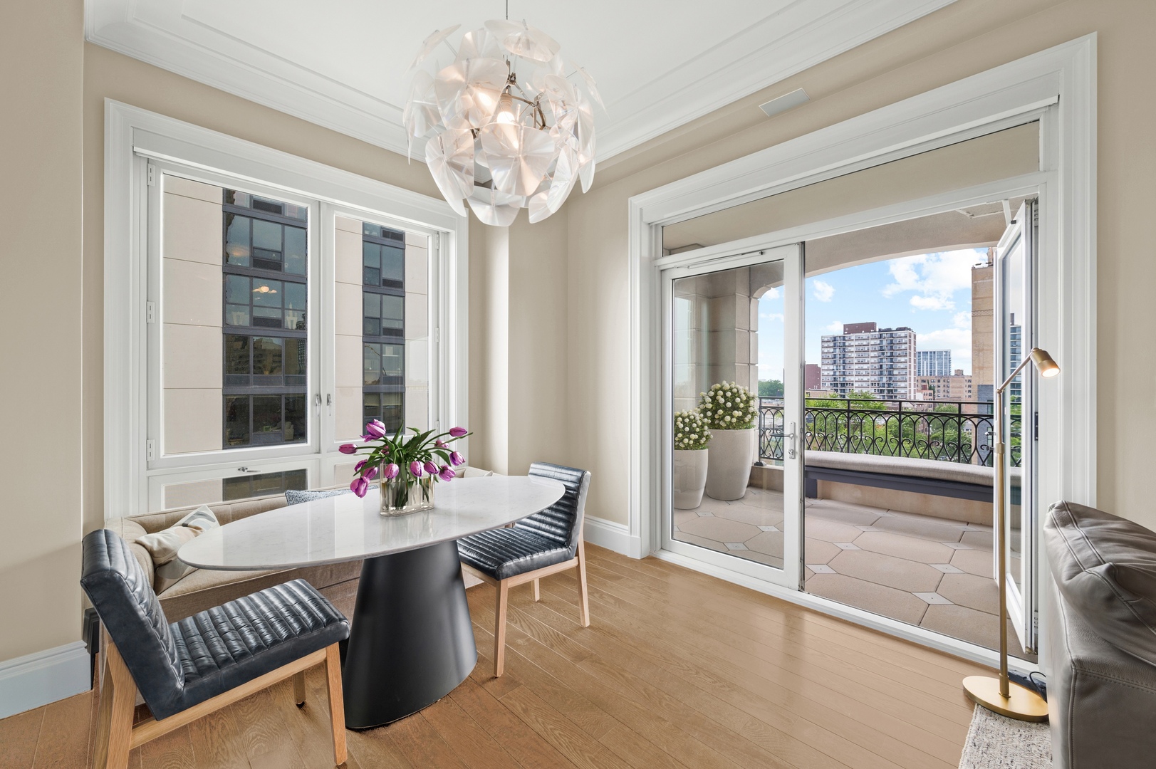 Residence S701, a Southeast corner 3 bedroom/3.1 bathroom home in the highly coveted, Lucien LaGrange-designed, Lincoln Park 2550. This remarkable home offers 4,000 square feet of thoughtfully designed living space, picturesque views from three terraces, and best-in-class amenities. Throughout the home – one of the largest in the building – floor-to-ceiling windows offer family and guests breathtaking and panoramic views of Lake Michigan, Lincoln Park, North Pond, and the Chicago skyline – views that change with the seasons and shift with the day’s light. Inside the home, floor-to-ceiling windows bathe the interior spaces with light, inviting the natural beauty of the outdoors in. The focal point of the large formal living room is once again the view, this time visible through a bright wall of windows that curve the entire width of the space and amplify the 180-degree cityscape. The adjoining den and large dining room are clearly defined spaces, but are capable together of accommodating a large gathering. Sophisticated and elegant finishes are found throughout the home including the kitchen which features Caesarstone quartz countertops with island seating, customized Snaidero cabinetry and top of the line appliances including Subzero, Wolf, and two Miele dishwashers. The pass through butler’s pantry adds storage, a wet bar, and temperature controlled wine storage. The south terrace, accessible from the kitchen, has gas grill hook-up and is large enough for a seated meal. Stepping off the kitchen, a comfortably sized family room provides the perfect setting for a relaxing evening or enjoy sunsets on the western terrace. The largest of the three, this 44×12-foot covered terrace overlooks the stunning manicured gardens and fountain within the 1.5-acre gated, private park. Back inside, the substantial primary bedroom is a peaceful retreat and includes its own east facing terrace, two walk-in closets, and spa-quality bathroom with dual vanity sinks, great storage, soaking tub, and an aromatherapy steam shower. Two additional bedrooms, both ensuite with private bathrooms and walk-in closets make perfect sanctuaries for family or guests. Key features throughout this large-scale home include: wide plank oak flooring, custom millwork and built-ins, smart home technology with centralized media and climate control, built-in speakers, programmable lighting, and Lutron shades. Residents of the building enjoy exceptional amenities: indoor pool with sundeck, top-of-the-line fitness center, sauna and steam rooms, movie theater, newly renovated party/event room with amazing kitchen, game and billiards room, massage rooms, on-site dry cleaner, dog run, private playground and an exceptional team of 24/7 door staff. Two large storage spaces and two parking spots with guest passes and optional valet service are included.