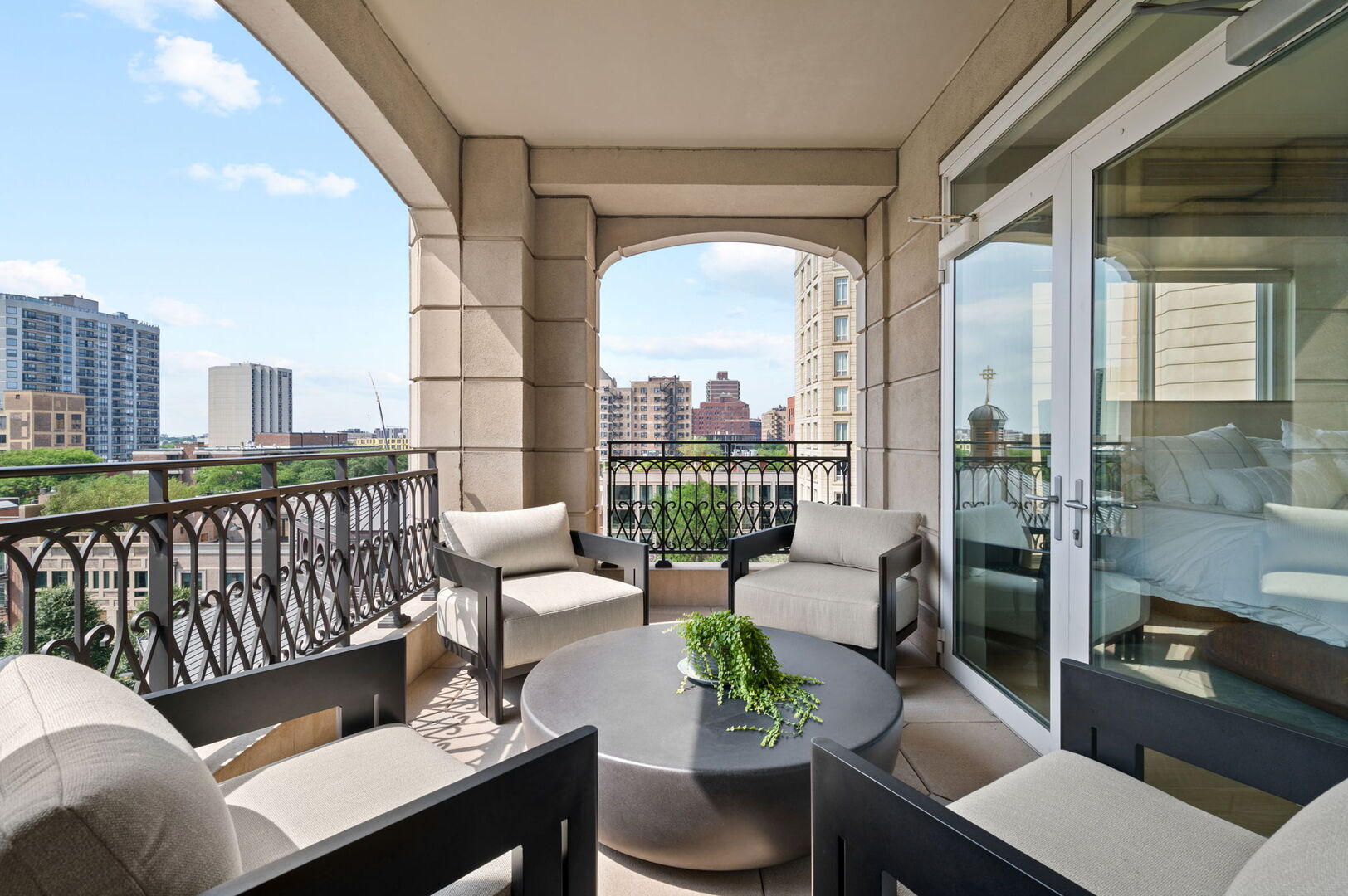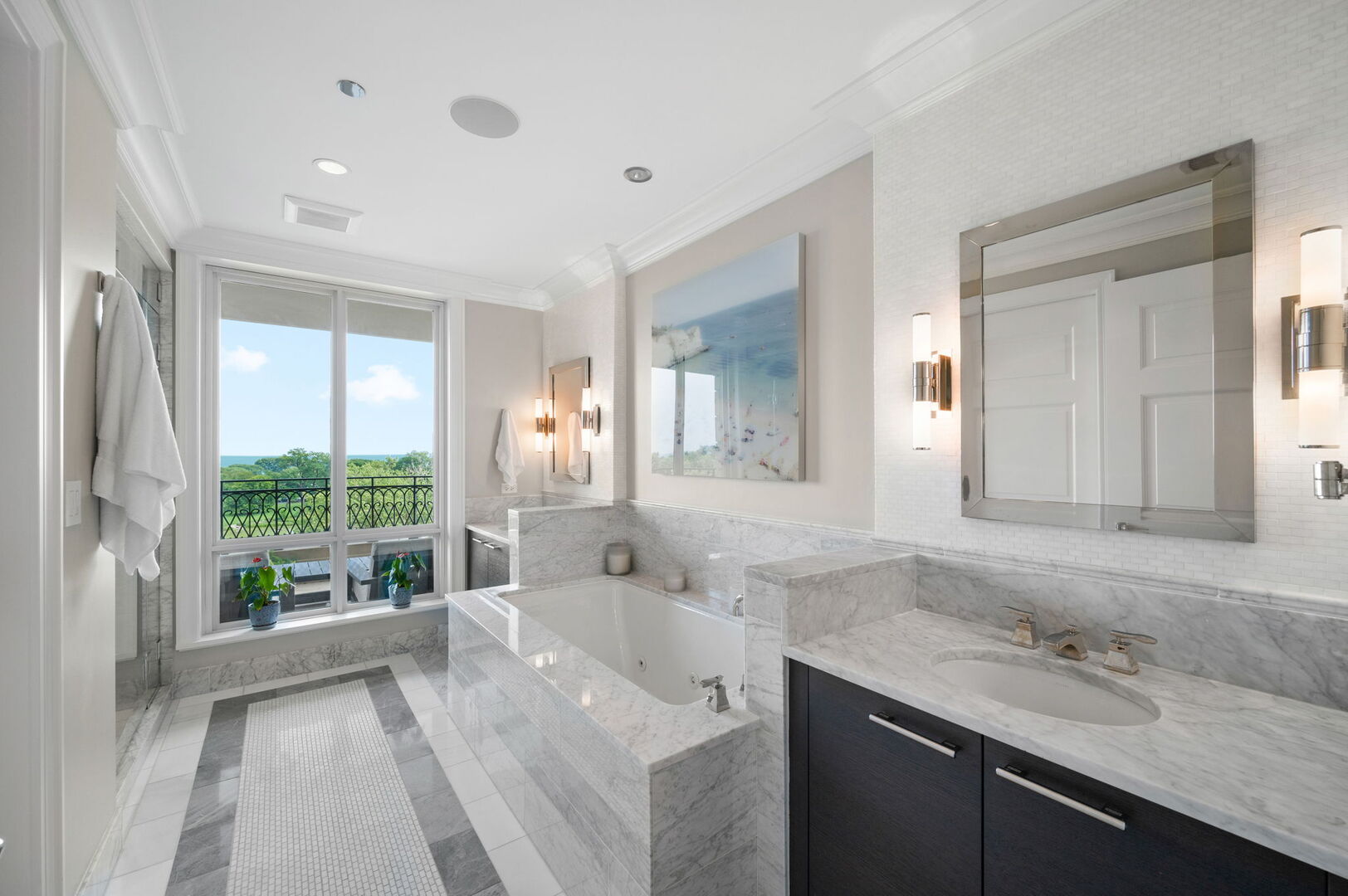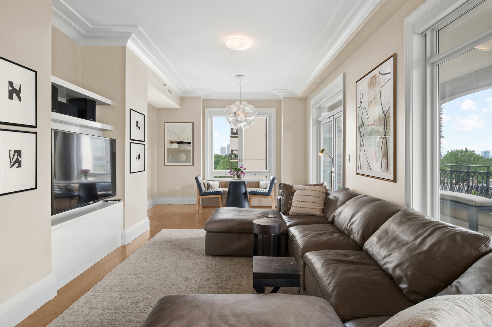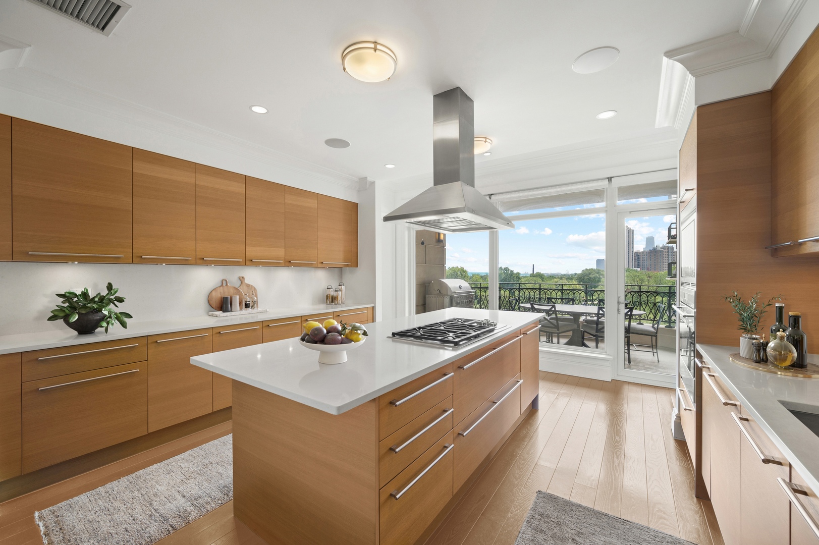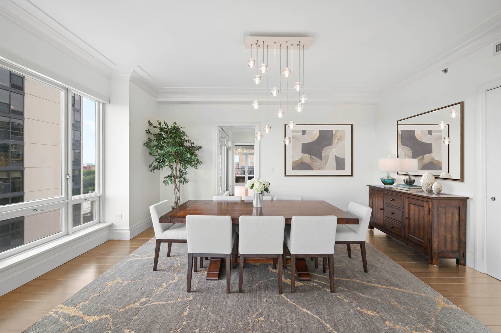 Residence S701, a Southeast corner 3 bedroom/3.1 bathroom home in the highly coveted, Lucien LaGrange-designed, Lincoln Park 2550. This remarkable home offers 4,000 square feet of thoughtfully designed living space, picturesque views from three terraces, and best-in-class amenities. Throughout the home – one of the largest in the building – floor-to-ceiling windows offer family and guests breathtaking and panoramic views of Lake Michigan, Lincoln Park, North Pond, and the Chicago skyline – views that change with the seasons and shift with the day’s light. Inside the home, floor-to-ceiling windows bathe the interior spaces with light, inviting the natural beauty of the outdoors in. The focal point of the large formal living room is once again the view, this time visible through a bright wall of windows that curve the entire width of the space and amplify the 180-degree cityscape. The adjoining den and large dining room are clearly defined spaces, but are capable together of accommodating a large gathering. Sophisticated and elegant finishes are found throughout the home including the kitchen which features Caesarstone quartz countertops with island seating, customized Snaidero cabinetry and top of the line appliances including Subzero, Wolf, and two Miele dishwashers. The pass through butler’s pantry adds storage, a wet bar, and temperature controlled wine storage. The south terrace, accessible from the kitchen, has gas grill hook-up and is large enough for a seated meal. Stepping off the kitchen, a comfortably sized family room provides the perfect setting for a relaxing evening or enjoy sunsets on the western terrace. The largest of the three, this 44×12-foot covered terrace overlooks the stunning manicured gardens and fountain within the 1.5-acre gated, private park. Back inside, the substantial primary bedroom is a peaceful retreat and includes its own east facing terrace, two walk-in closets, and spa-quality bathroom with dual vanity sinks, great storage, soaking tub, and an aromatherapy steam shower. Two additional bedrooms, both ensuite with private bathrooms and walk-in closets make perfect sanctuaries for family or guests. Key features throughout this large-scale home include: wide plank oak flooring, custom millwork and built-ins, smart home technology with centralized media and climate control, built-in speakers, programmable lighting, and Lutron shades. Residents of the building enjoy exceptional amenities: indoor pool with sundeck, top-of-the-line fitness center, sauna and steam rooms, movie theater, newly renovated party/event room with amazing kitchen, game and billiards room, massage rooms, on-site dry cleaner, dog run, private playground and an exceptional team of 24/7 door staff. Two large storage spaces and two parking spots with guest passes and optional valet service are included.