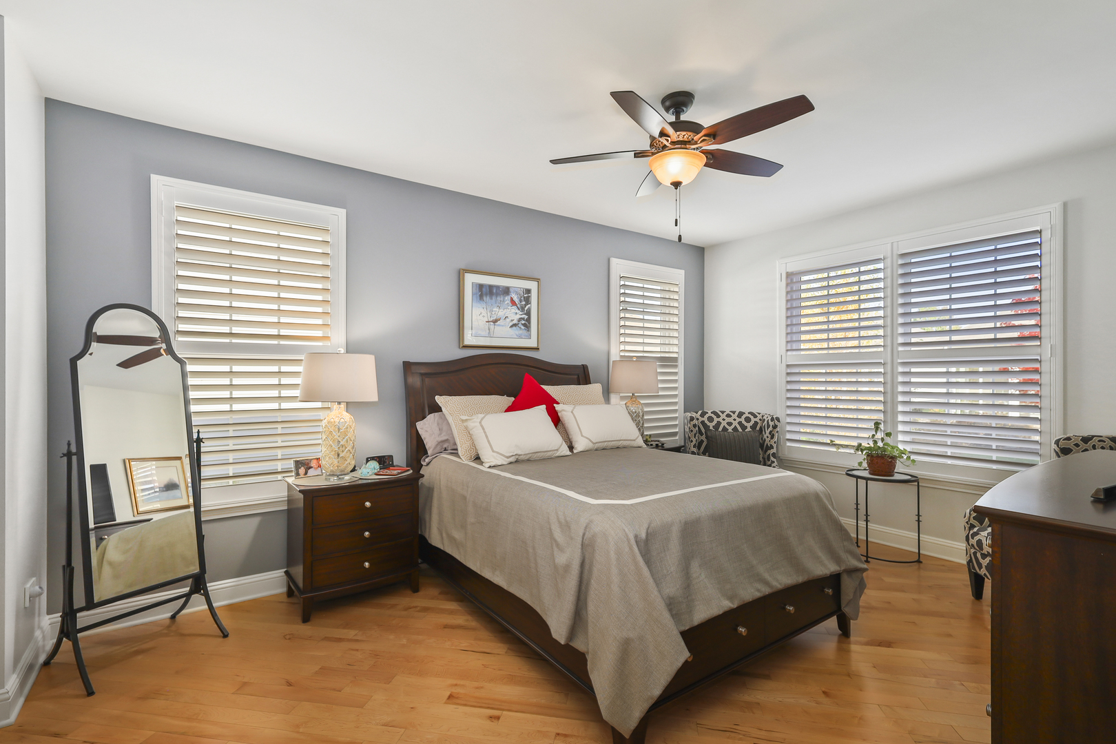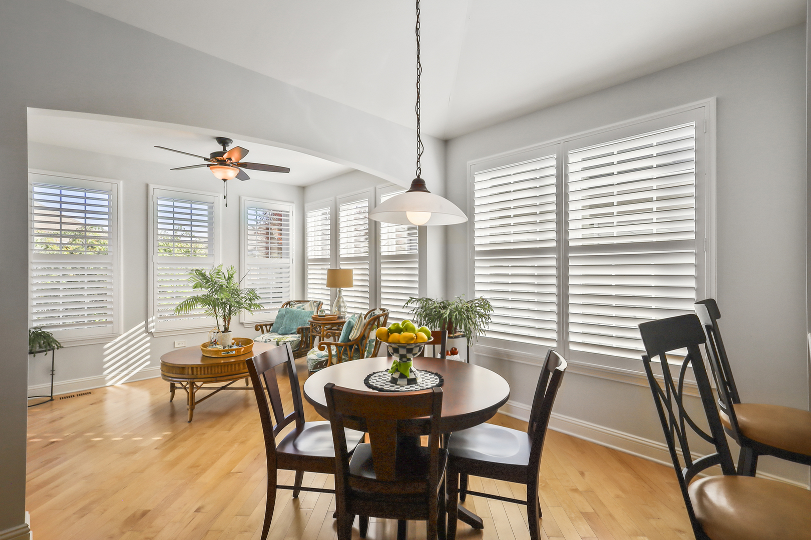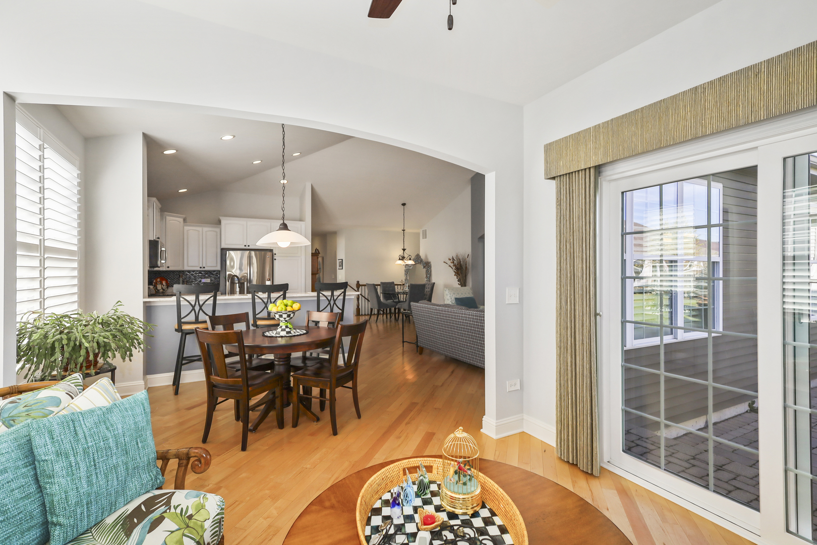 Discover comfort, style, and low-maintenance living in this beautifully maintained 2-bedroom, 2-bath Ranch home nestled in the desirable Carillon Club! This home is the perfect blend of elegance and ease. As you step inside, you are greeted with an open spacious layout along with gleaming Hardwood Flooring throughout the entire main level, creating a warm, seamless flow from room to room. Vaulted ceilings and flooding with natural light. The updated kitchen boasts elegant white cabinetry, Quartz Countertops, SS appliances and Island for additional storage. All the finishes throughout are completed with sleek brushed oil-rubbed bronze, offering both functionality and refined style. Dining and Living room are combined with an open concept. Enjoy your morning coffee or unwind with a book in the sun-drenched sunroom, featuring large windows that fill the space with natural light. Or lounge in leisure in the backyard on your beautiful brick paved patio. Plantation shutters throughout the home provide a timeless look and added privacy. The spacious primary suite includes high ceilings, two generous closets with one being a walk-in and hardwood flooring. Primary bath features dual quartz countertop vanity and standup shower with seating accommodation. The second bedroom and full guest bath offer comfort for visitors or a flexible home office setup. Make your way downstairs to find a full unfinished basement that is the perfect blank canvas-ideal for storage or future living space, along with huge crawl area for additional storage. 2 car garage is finished with appoxy flooring and insulation. This immaculately maintained home is move-in ready and located just minutes from shopping, dining, AMC movie theater, the new Block 59 shopping center, expressways and much more! Welcome home!