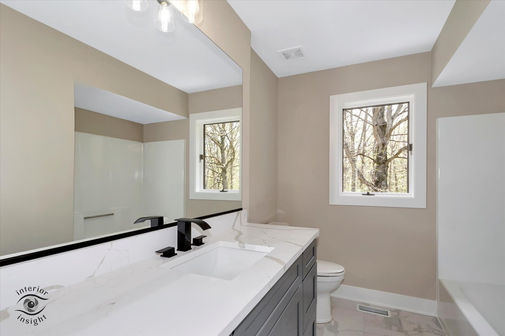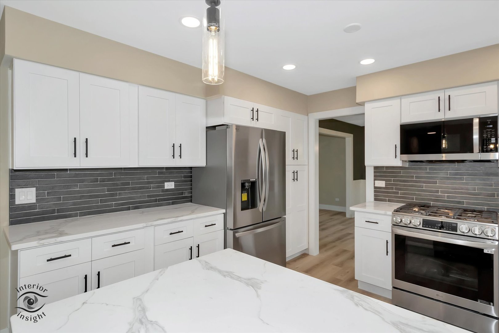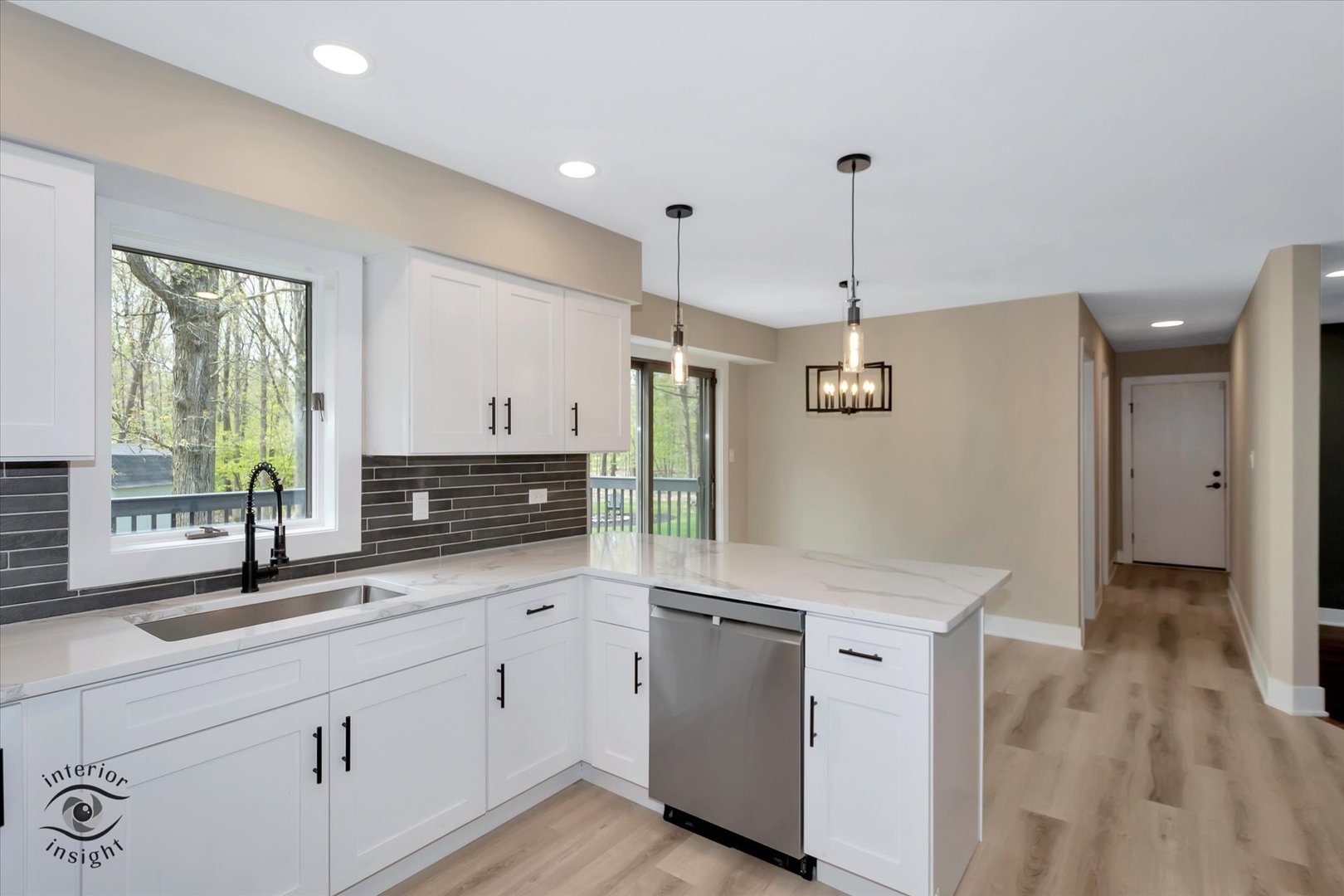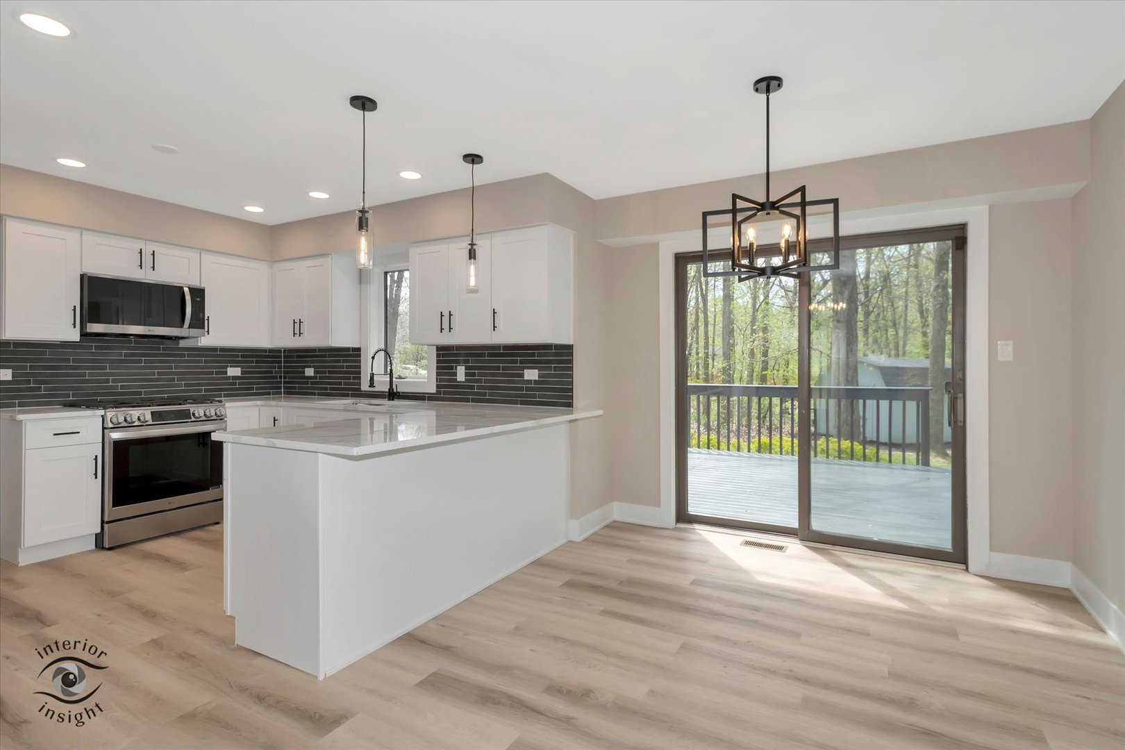Come and take a look at this beautiful brick and cedar home nestled among mature oak trees on almost 3/4 of an acre in desirable Plum Valley. This home has been totally remodeled, updated and revitalized in every way possible! Once you enter through the new Mission Style front door assembly you will be Amazed! The entire house has new cabinets, quartz counters, new vanities, new plumbing, new electrical throughout, new solid Mission style doors & trim. The updated lighting is all LED with new fixtures as well. New vinyl plank flooring along with tile and backsplash throughout and new landscaping on the outside! This is a 3/4 bedroom, 3- bathroom home complete with a finished basement and a 3-car garage! The master bath is impressive with a stone double-sink vanity, an over-sized tiled shower, slate style floors and a walk-in closet; 2-additonal nice sized bedrooms with a full bath complete the 2nd level. A large open formal living room and formal dining room, complete with wainscoting make an impression upon entry, but the family room with vaulted ceilings, a gas floor-to ceiling fireplace, skylights and hardwood floors make this room the heart of the home! A sparkling brand new ‘eat-in’ kitchen awaits you, all with new LG stainless-steel appliances, counter-seating quartz countertops, soft-close white custom cabinetry, additional recessed lighting, pantry. Patio doors off the kitchen lead to the huge deck and a quiet lush private backyard with a variety of wildlife. There is a shed for all your tools and toys, and a firepit to relax and enjoy your surroundings in this hidden pocket of Crete. Complete with a finished basement with an additional recreation room for the kids and an additional bedroom/computer/hobby room with a utility room for storage make this home fun and functional! Main level laundry boasts a Bosch washer and dryer, complete with a sink and plenty of cabinets for storage! The furnace and central air have been replaced within the last year, roof 2023, central vac system, water filtration system, and a High Efficiency air filter. The 3-car attached garage has inside water and a floor drain and is extra deep for storage. This unique home is ready for you to call it your own! Everything is state of the art Energy Efficient! This home has 2×6 exterior walls, a newer 95% efficient furnace along with Anderson windows keep the heating and electric bills very low. This home has been tastefully rehabbed and is like a “Brand New” home among 80+ oak trees!