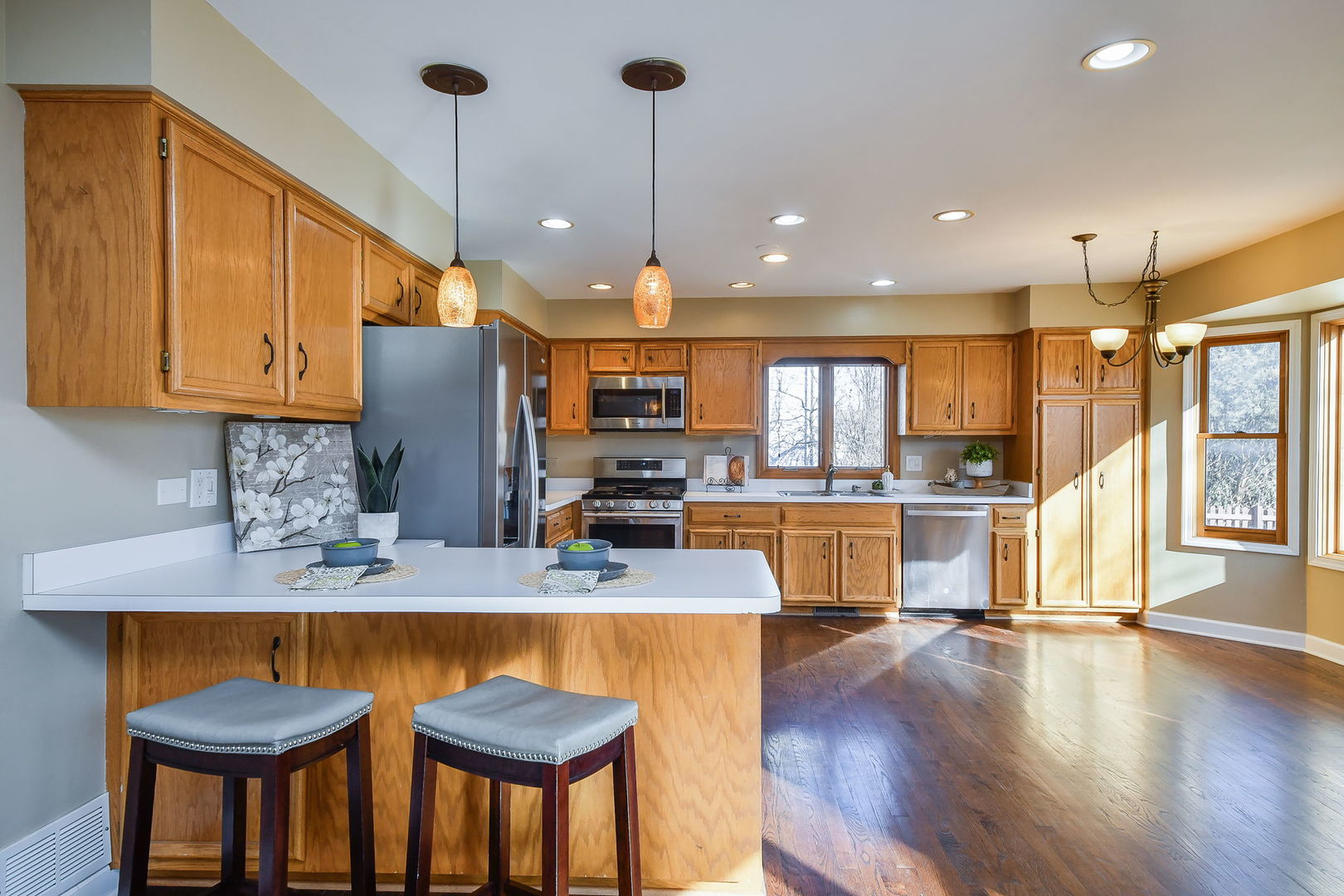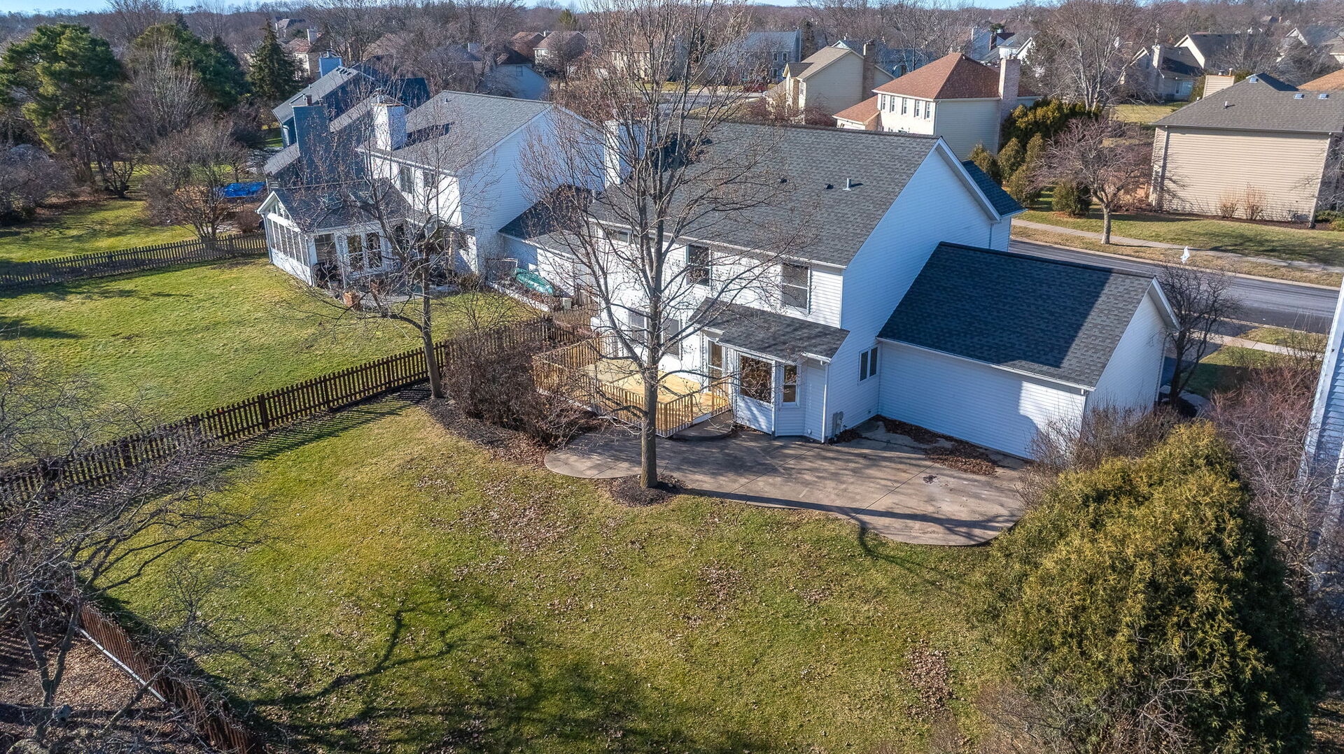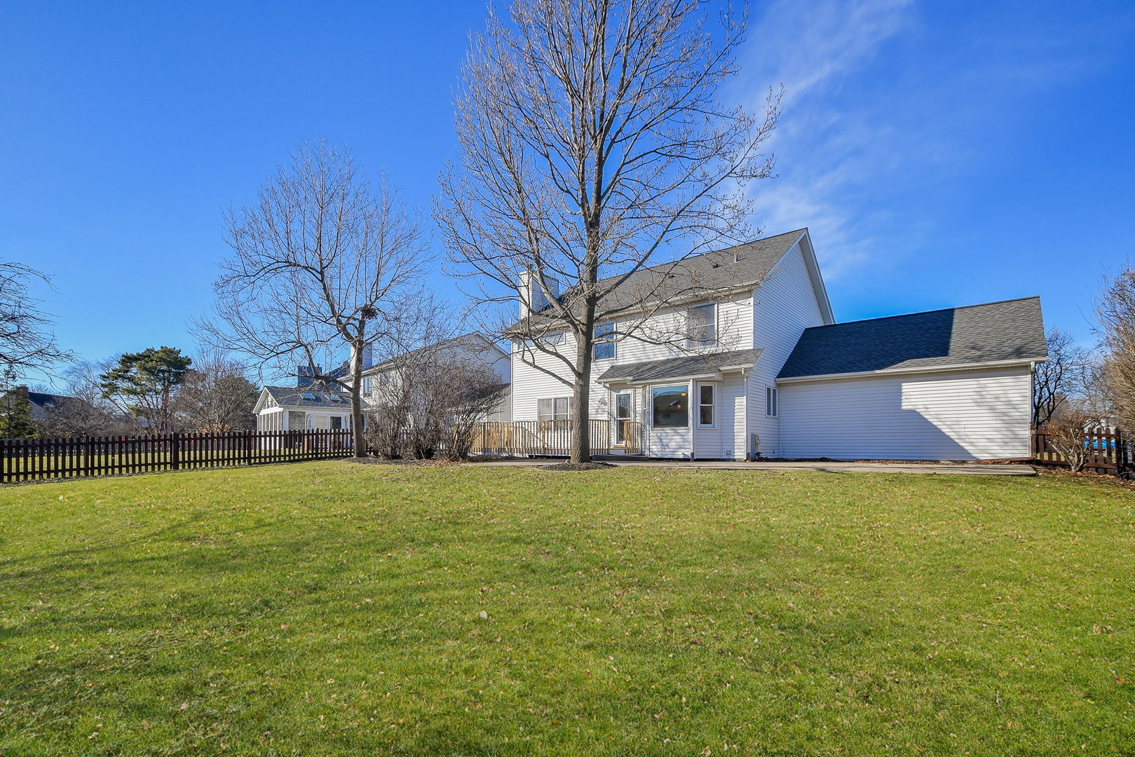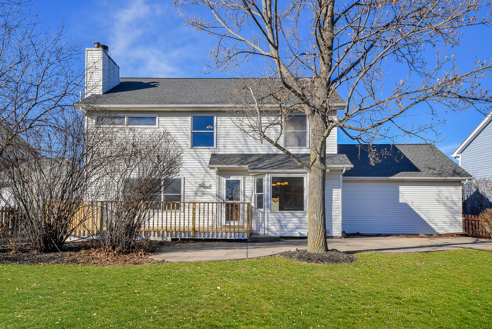 Enjoy all of the incredible amenities that the Oakhurst Subdivision has to offer to it’s residents with this fantastic 4 bedroom home! The adorable covered front porch couldn’t be a more perfect spot to enjoy your morning coffee. Step inside and notice the rich mocha stained hardwood floors that grace the entire 1st level and staircase! This heart of the home kitchen truly lives up to it’s name here, it is the most wide open space, ready to accommodate a large kitchen table, and gatherings at the breakfast bar. Ample cabinet and pantry space is highlighted by the stainless steel appliances. Sunshine streams into the family room making it such a warm space to relax by the fireplace. A formal dining room with bay window makes for a wonderful entertaining space and the separate living room can be turned into an office/playroom/flex space so easily! The powder room has been beautifully remodeled, and the first floor laundry room boasts ample storage and front loader stainless washer and dryer. Wrought iron spindles and hardwood steps highlight the staircase to the 2nd floor. Here you will find a hardwood hallway leading to all 4 bedrooms, that all have just had new carpet installed. The Primary suite is extra large with a big walk in closet. Enjoy the oversized primary bathroom with separate deep soaking tub and shower, and dual sinks on a vanity with tons of storage! All of the additional bedrooms have also just been re carpeted and boast great closet space, and ceiling fans. The linen closet and guest bathroom round out the 2nd level. Bring your dream basement ideas to life in this full basement just waiting for all of your storage needs or finishing ideas! There is no crawlspace so it boasts a perfect opportunity to be creative in a wide open area. If a large yard is on your wish list, look no more! This is such a nice wide and deep lot and it’s fully fenced! Enjoy the ease of entertaining on the maintenance free concrete patio and new deck. The lifestyle in Oakhurst is such a bonus. You will have soccer fields, basketball courts, sand volleyball, pickleball, tennis courts, miles of walking paths just steps outside your front door. Join the pool and clubhouse if you desire, we have award winning swim and water polo teams! If you like endless walking and biking opportunities you will find miles or paved paths around Waubonsie Lake, next to Oakhurst Forest Preserve and to Lake Patterson ( which also boasts a huge sled hill! ). Also walking distance to all 3 schools, Starbucks, Dunkin, Mariano’s grocery and incredible food options! Minutes drive to the Rt. 59 train station, and downtown Naperville. You simply cannot go wrong, Welcome to Oakhurst! You’ll be so happy with the updates you do not have to do! Sellers have updated : 2026 – All NEW carpet in the bedrooms. 2025 – NEW furnace, stainless refrigerator, deck, back up sump pump, and dishwasher. 2017 – NEW water heater, hardwood flooring. 2015 – NEW roof, washer/dryer, new bay windows installed.