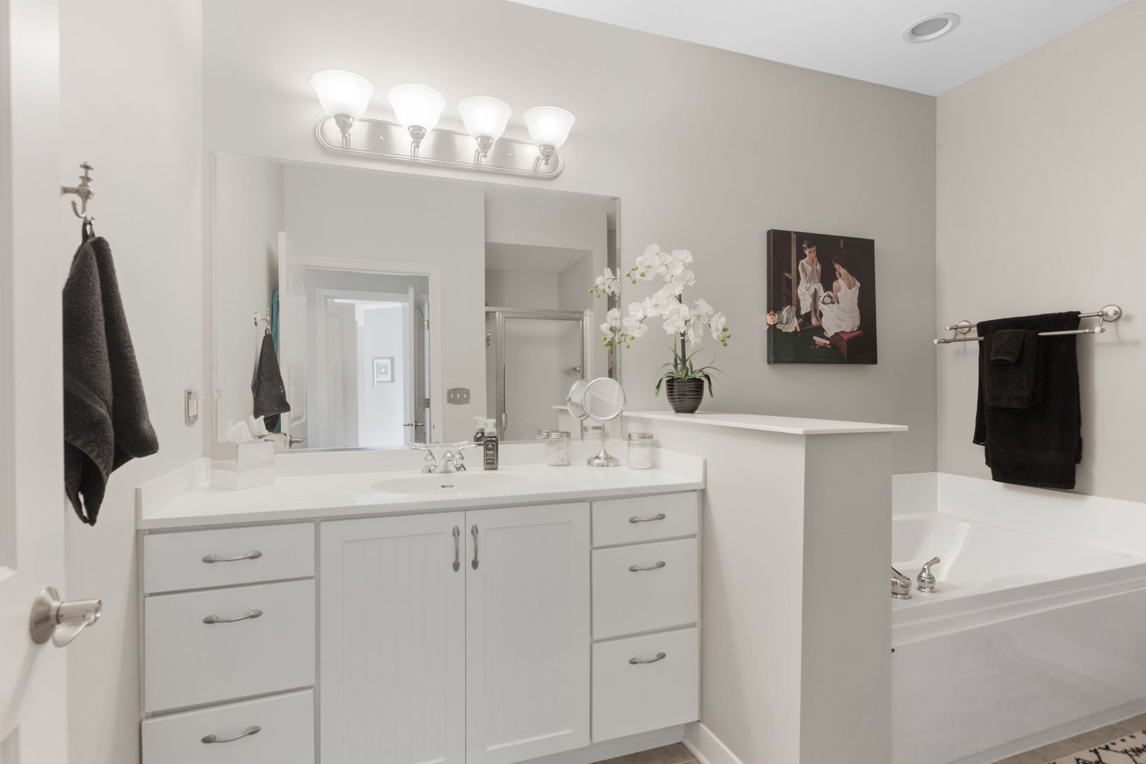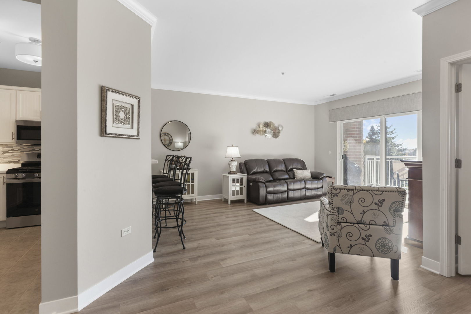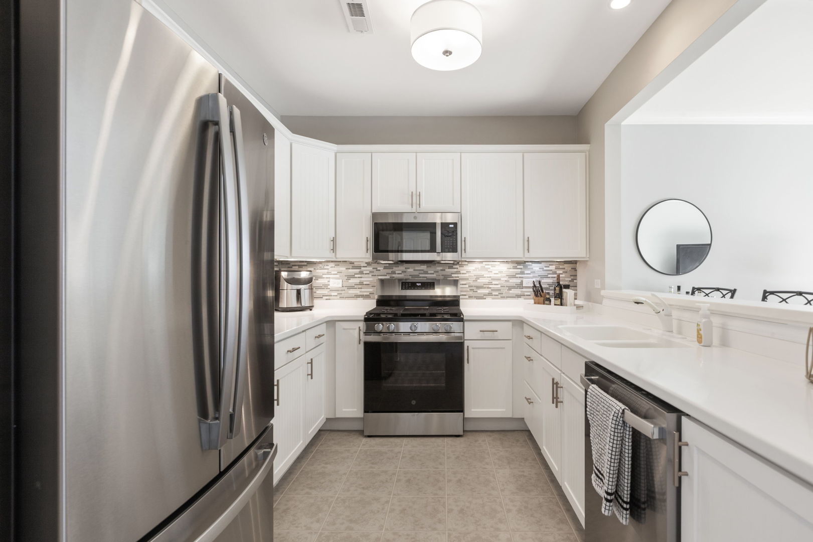 Beautifully maintained 2-bedroom, 2-bath condo in the sought-after 55+ Crossings at Geneva community! This bright and inviting home is filled with amazing natural light and features a stunning kitchen with all brand-new (11/2025) stainless steel appliances including a stove, refrigerator, dishwasher, and microwave, complemented by a stylish backsplash and a pass-through breakfast bar window. Gorgeous 2023 laminate flooring flows seamlessly throughout, and both bedrooms include elegant plantation shutters. The spacious primary suite offers a large bathroom with a soaking tub and separate shower, along with a custom-designed walk-in closet, while the second bedroom features built-in shelving and desk space-perfect as a guest room or home office. Enjoy peaceful, scenic views from your private balcony with no neighboring units behind. Additional highlights include a newer A/C unit (2023), in-unit washer and dryer, secured building entrance, extra storage down the hall, and one heated garage parking space. The Crossings at Geneva provides a true sense of community with a clubhouse for social gatherings, book clubs, coffee hours, holiday parties, and monthly outings, as well as beautifully maintained grounds with a relaxing courtyard. Conveniently located near Northwestern Delnor Hospital, Geneva Commons shopping and dining, and Randall Road. HOA covers water, parking, clubhouse access, exterior maintenance, lawn care, and snow removal. Pet-friendly community-everything about this condo is move-in ready, so don’t wait to make this beautiful home yours today!
