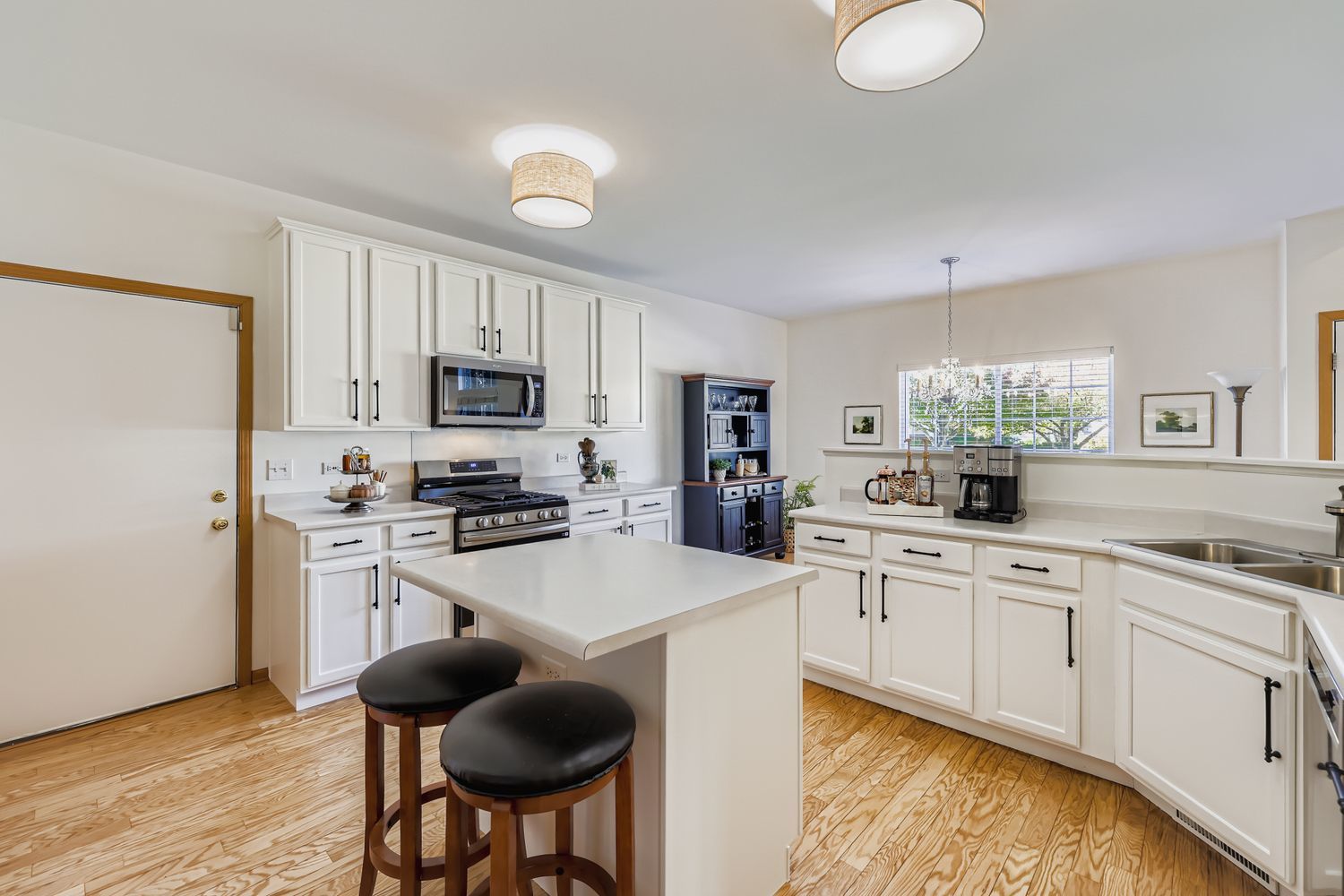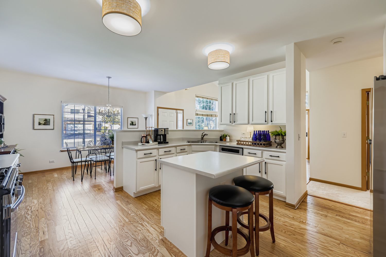 Spectacular end unit ranch, completely move-in ready! With volume ceilings, natural light, and newly refinished hardwood floors in the entry and living room, you will immediately be ready to call this sweet condo home. Spacious kitchen with 42″ dove white cabinets, new hardware, center island with storage, brand new stainless appliances, double bowl stainless sink, plenty of counter prep space, and a dining area for a large table and hutch. Two generous sized bedrooms with a full hall bath and a separate private ensuite bath with both a soaking tub and walk-in shower. Excellent closet space, two car attached garage, convenient laundry access off the kitchen, slider door to a private patio, new carpeting, freshly painted throughout, newer AC, humidifier, hot water heater, lighting, and brand new roof coming 2026. Sought after Thornwood community with pool, club house, tennis, pickle ball, parks, walking trails, sports core, and more! Highly rated D303 school district. Easy access to the Randall Road corridor and I90 for daily shopping and commuting convenience. Please see the features sheet attached for all the brilliant details of this perfect home. Immaculate and ready for new owners to move in with ease.