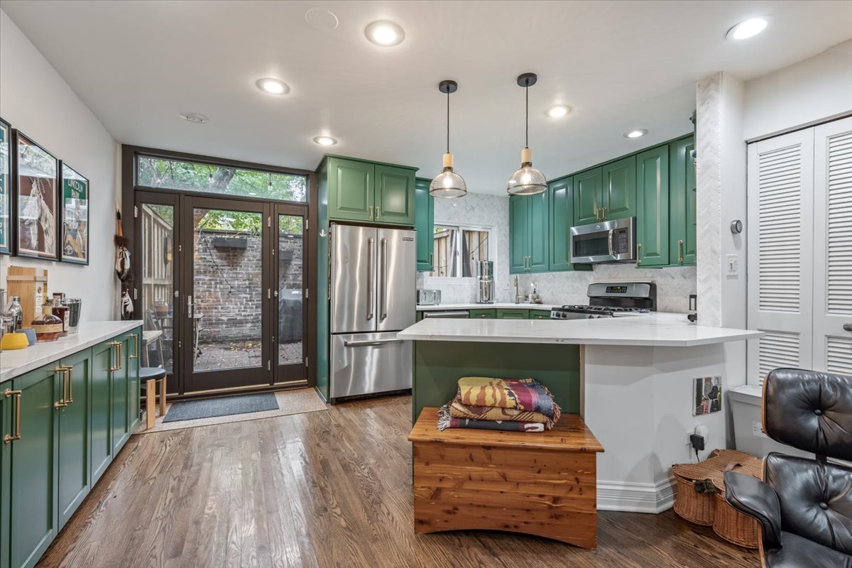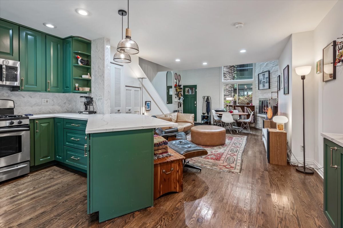 Rarely available 3 bed 2 bath triplex in the heart of Lincoln Park. Bright living room features 20 ft ceilings, floor-to-ceiling natural stone gas fireplace, and hardwood throughout. Open kitchen offers 42″ cabinets, stainless appliances including a 36″ JennAir fridge, Quartz countertops, and a dry bar. Expansive living space opens to a large private patio with newly-installed brick and built-in planters-perfect for entertaining. Home also includes brand new windows, recessed lighting, custom closets, and floor-to-ceiling windows. Second level features a spacious third bedroom with full-wall closets, a loft overlooking the living area, updated bath with tub/shower, and laundry. Third floor includes the bright primary and second bedrooms plus a beautiful bath with Carrera tile, double vanity, skylit walk-in shower, and added storage. Exterior parking included. Prime Lincoln Park location on a quaint tree-lined street, steps to the Brown/Purple Line, dining, nightlife, and everything the neighborhood has to offer.