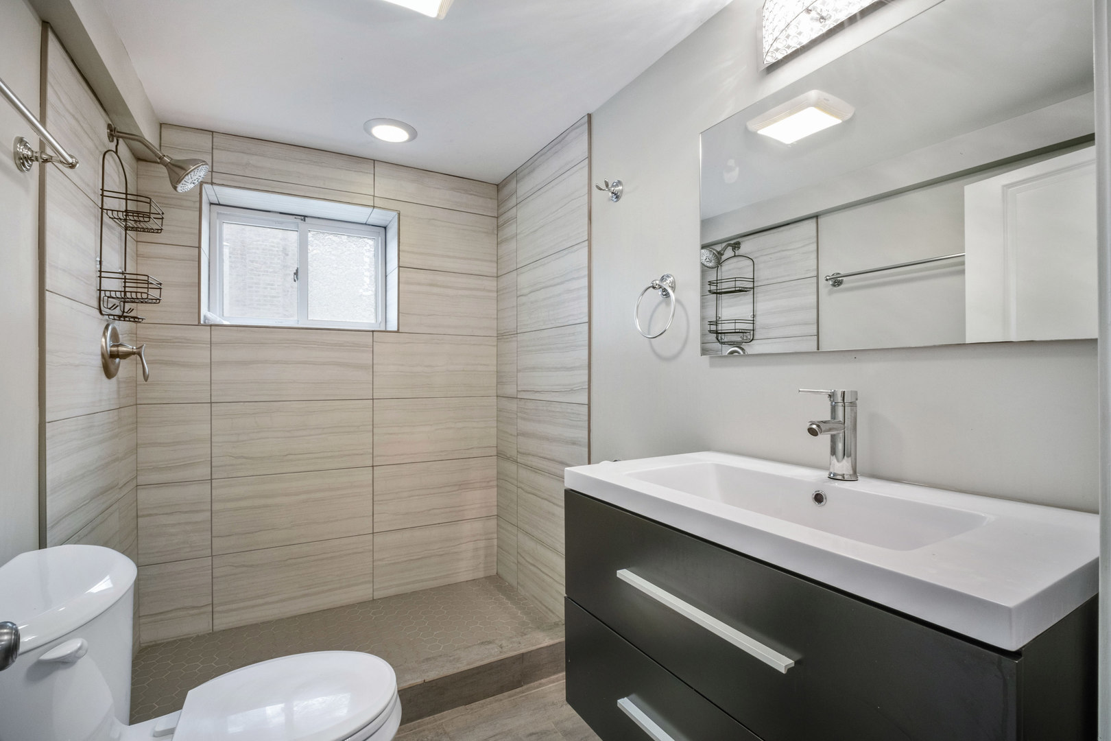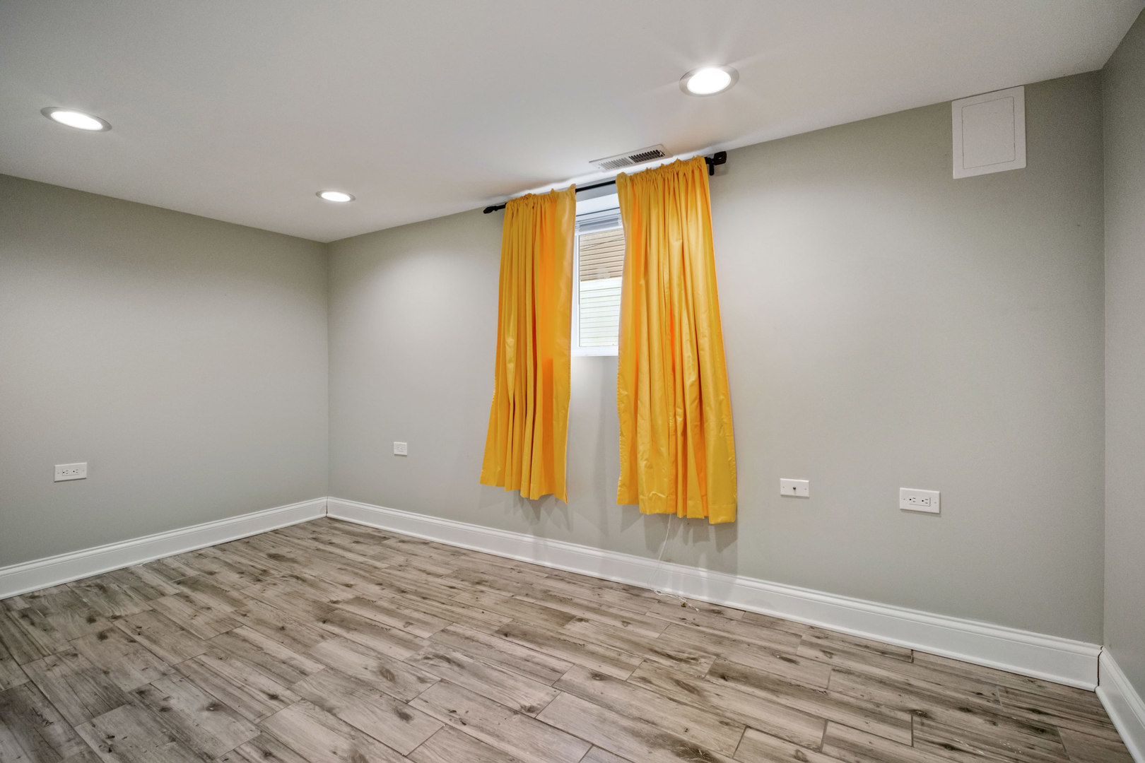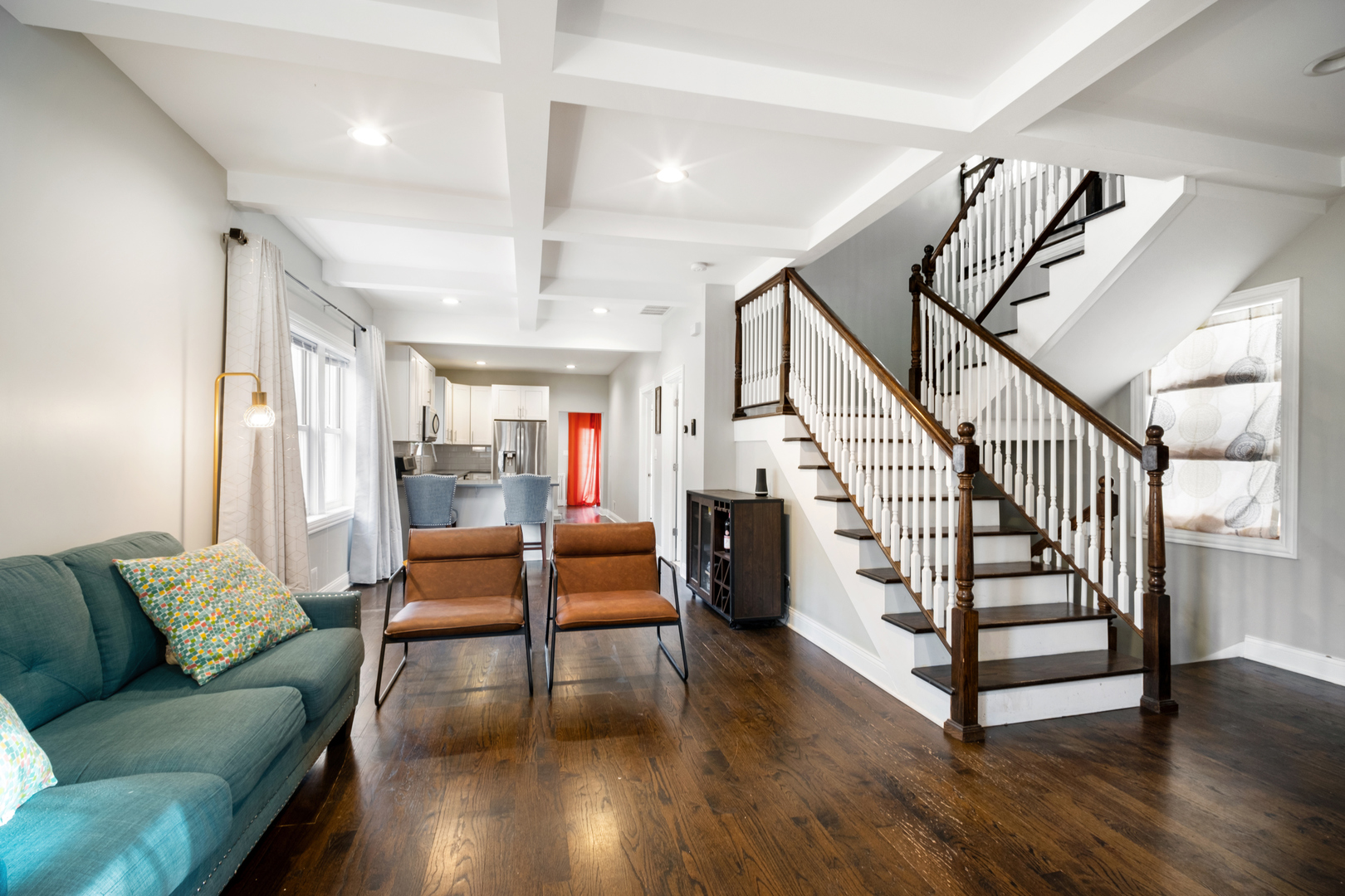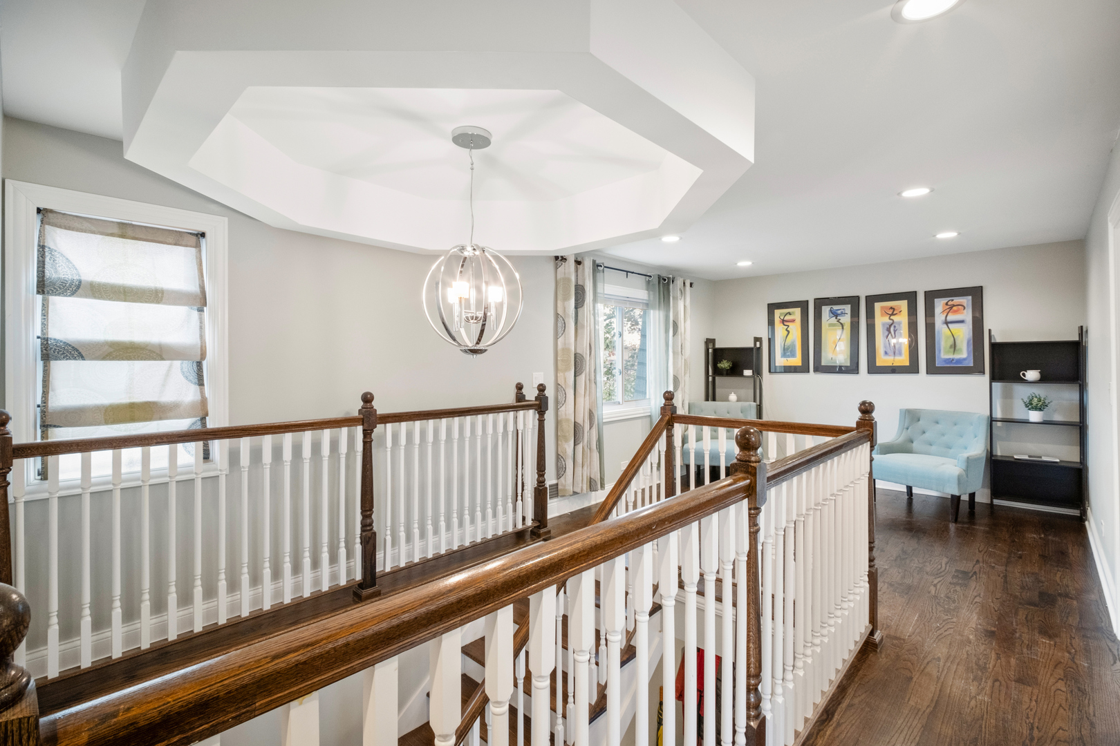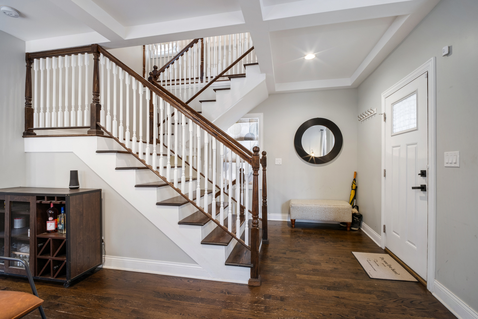 This beautifully updated 5-bedroom, 4-bath home offers approximately 2,032 SF of versatile living space. The main floor features spacious living and dining rooms with striking beam ceilings, a bright kitchen with shaker cabinets, gray quartz countertops, and stainless steel appliances, plus two flexible rooms for a home office or playroom. Upstairs, enjoy three bedrooms, including a serene master suite with a walk-in closet and spa-inspired bath, alongside a cozy family room and additional full bath. The finished lower level provides extra living space, a rec room, and more. Set on an oversized lot, this home features a fenced backyard with a vinyl fence (2020), a deck for entertaining, and a 2-car garage. Major updates include a new roof (2021), making this home move-in ready. Perfectly blending modern style and functionality, this gem is ready to welcome you home!