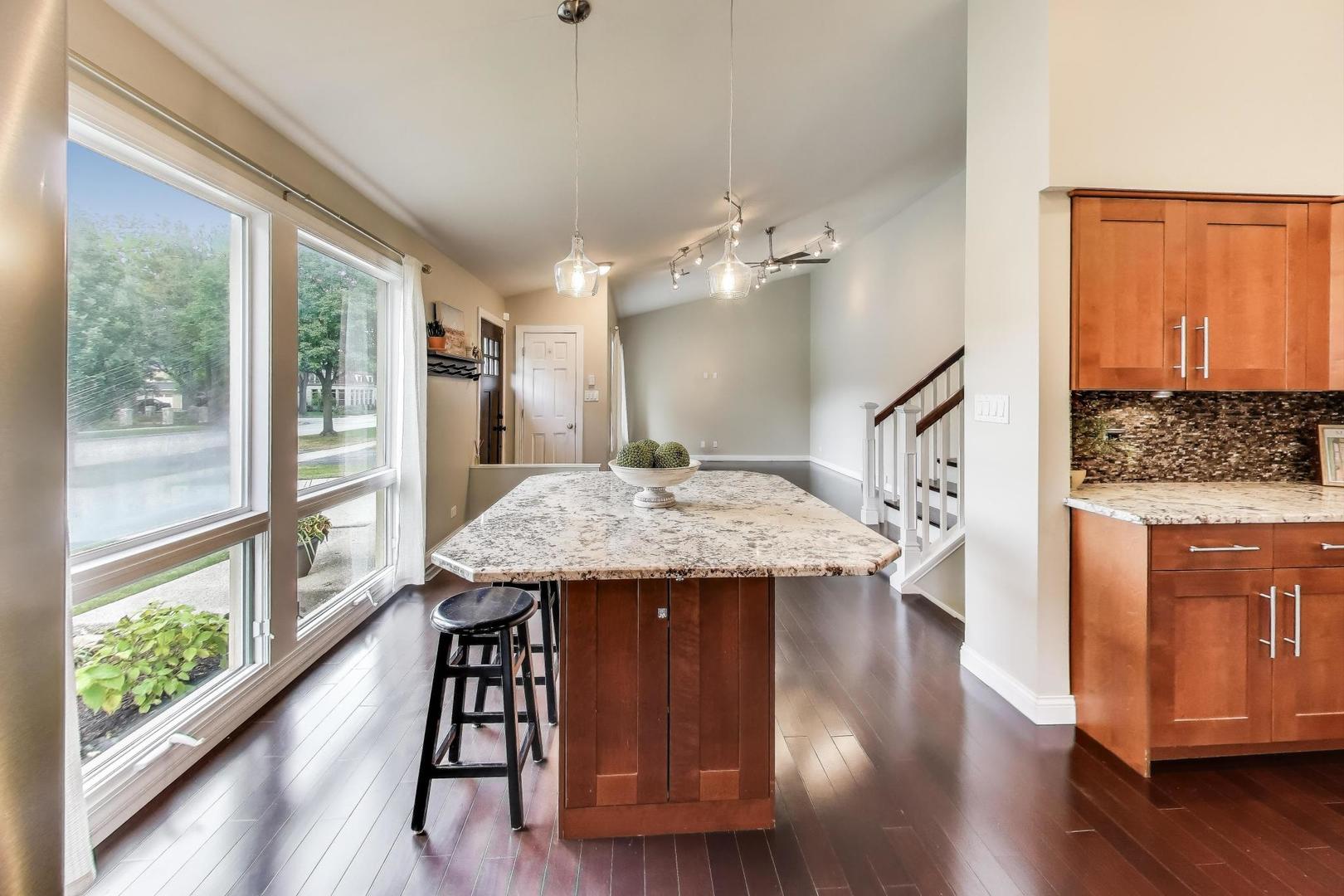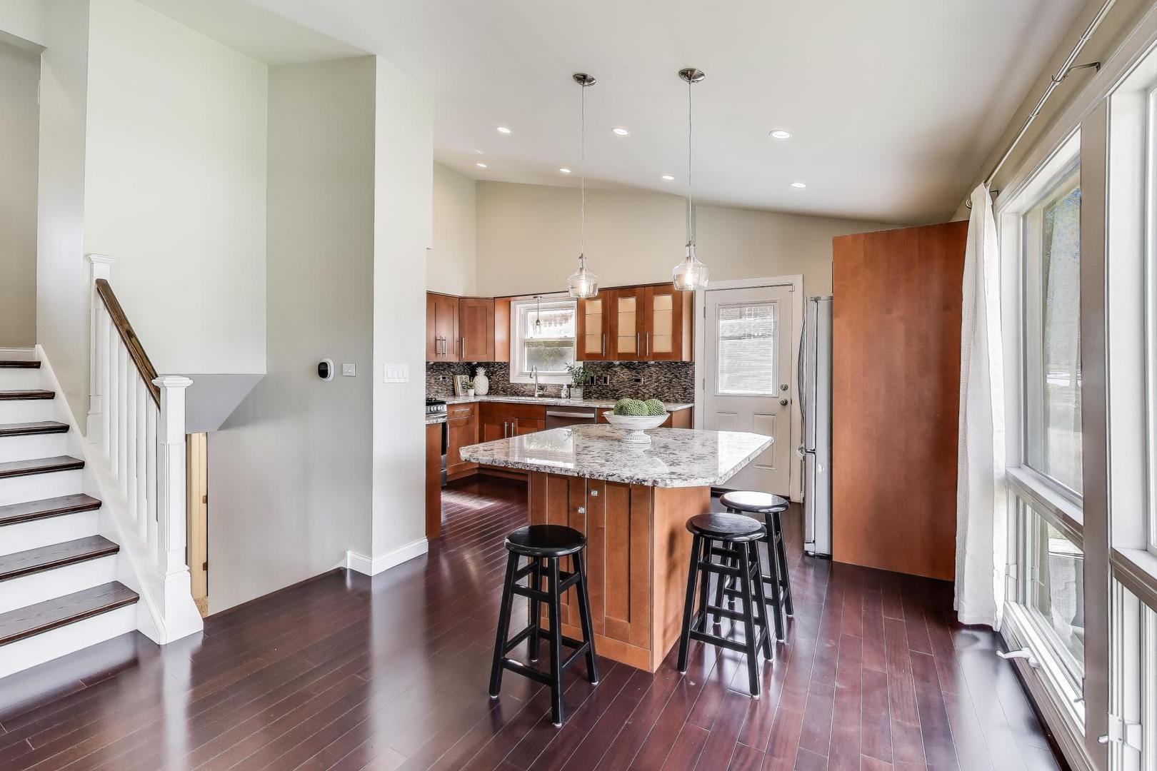 Charming and move-in ready, this beautifully renovated home offers a fresh, classic design in a highly sought-after “in-town” location. The main level was just painted and showcases rich dark hardwood floors and dramatic vaulted ceilings that flow seamlessly into the kitchen. Flooded with natural light from oversized picture and bay windows, the open-concept living and kitchen area is a showstopper! Shaker cabinetry, granite countertops, under-cabinet and display lighting, glass tile backsplash, stainless steel appliances, and a large center island-both functional and perfect for entertaining. Upstairs you’ll find three comfortable bedrooms with custom closets and a beautifully updated full bath. The lower level expands your living space with a spacious rec room flooded with natural light from daylight windows and another fully renovated bath. Step outside to a surprisingly large private backyard, complete with a full-width patio and plenty of space to design the outdoor retreat of your dreams. This one won’t last – schedule your showing today!