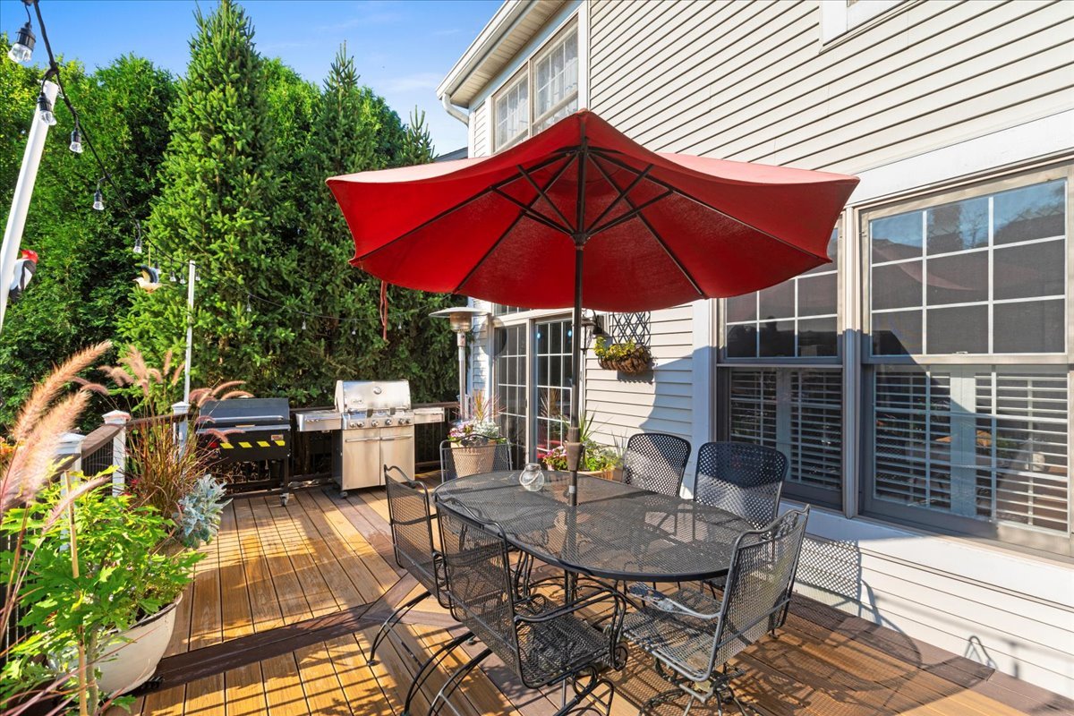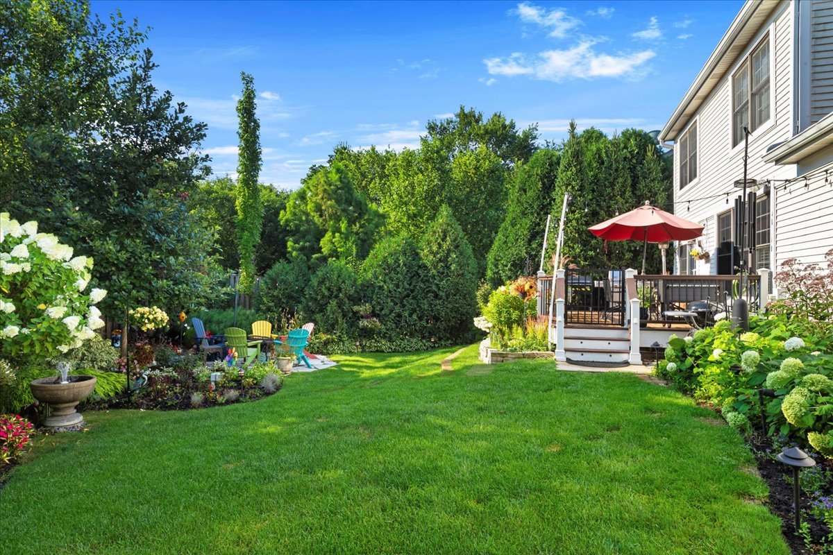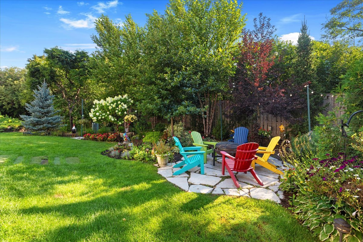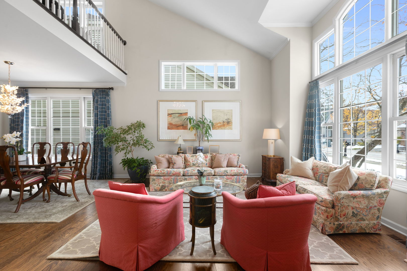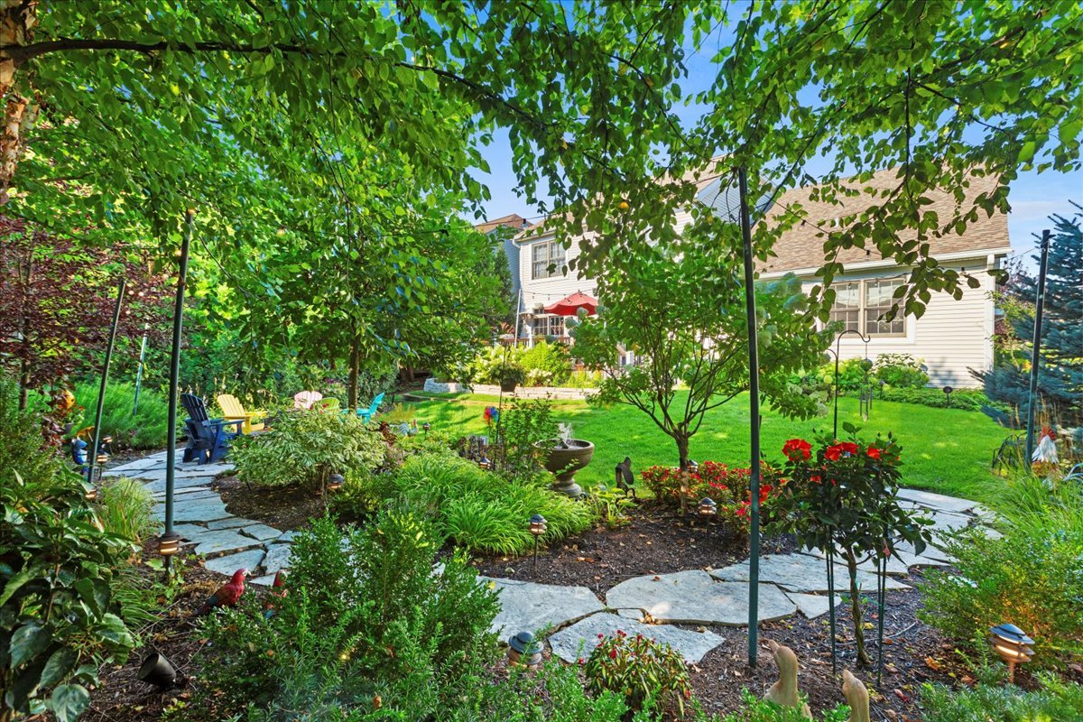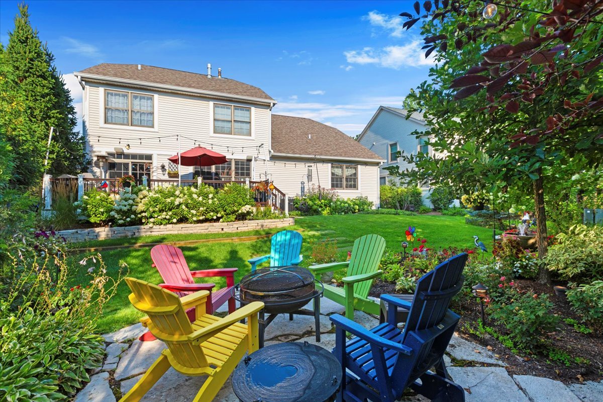 The best of both worlds! Experience maintenance-free living paired with the comfort of a first-floor primary suite and a beautifully landscaped private backyard. This elegant brick home welcomes you with timeless curb appeal, a charming front porch, and a grand two-story foyer featuring hardwood floors and a striking palladium window. The vaulted-ceiling living room is filled with natural light from large windows and seamlessly flows into a formal dining room accented by a graceful chandelier-perfect for entertaining. At the heart of the home, the open-concept kitchen is a chef’s dream. Rich custom cabinetry (including glass-front displays), quartzite countertops, and premium appliances elevate the space-featuring a Sub-Zero refrigerator, Thermador 5-burner cooktop, KitchenAid double ovens and dishwasher, and a Subzero beverage refrigerator. A sliding door leads from the kitchen to an expansive all-Trex deck, overlooking the lush, maturely landscaped backyard and a firepit with Lannon stone surround and path-ideal for gatherings year-round. Beautiful garden with custom low voltage lighting system. The inviting family room includes recessed lighting, plantation shutters, and a cozy gas fireplace, creating a warm atmosphere for everyday living. The first-floor primary suite offers comfort and sophistication with rich crown molding, two custom walk-in closets, and a luxurious en-suite bath featuring limestone tile, five shower heads including body sprays and rainhead plus a bench, whirlpool tub, double vanity, abundant storage, and window with plantation shutters for privacy. A stylish powder room with mosaic marble tile flooring and walls, and a convenient mud/laundry room with updated cabinetry and countertops with extra deep Kohler laundry sink complete the main level. Upstairs, a spacious loft with hardwood floors provides versatile living space, along with two generous bedrooms (one with a walk-in closet), an office, and a full bath with a walk-in shower. The lower level offers excellent storage and the potential to be finished for additional living or recreation space. Enjoy the perfect blend of luxury, function, and ease-all in a beautifully maintained home designed for comfortable living and entertaining.