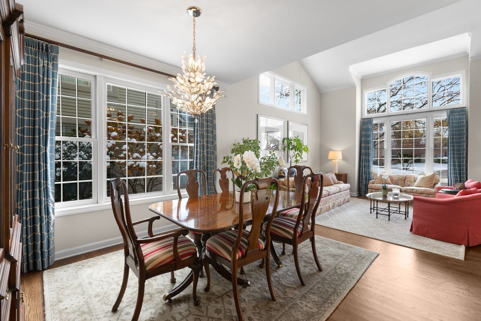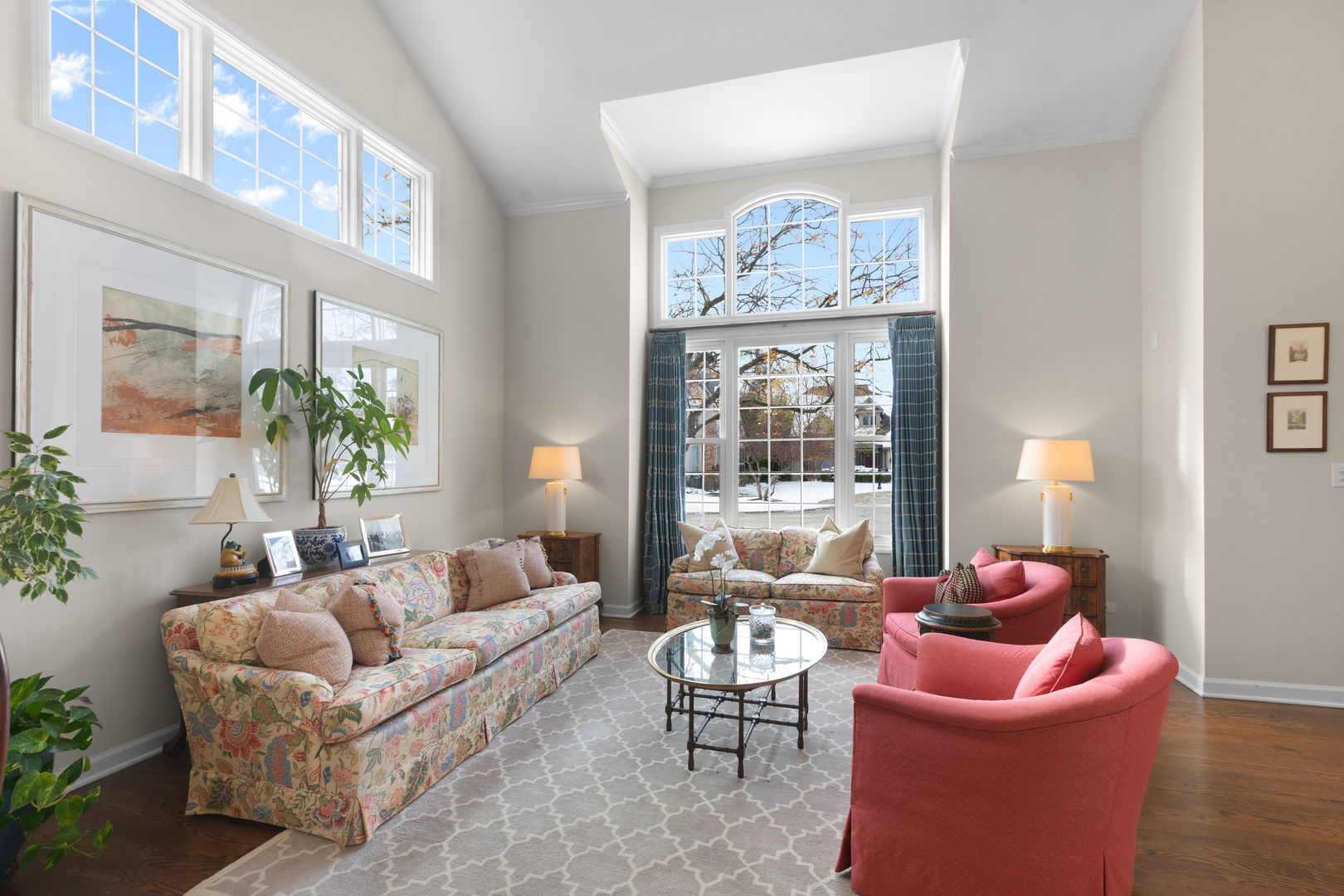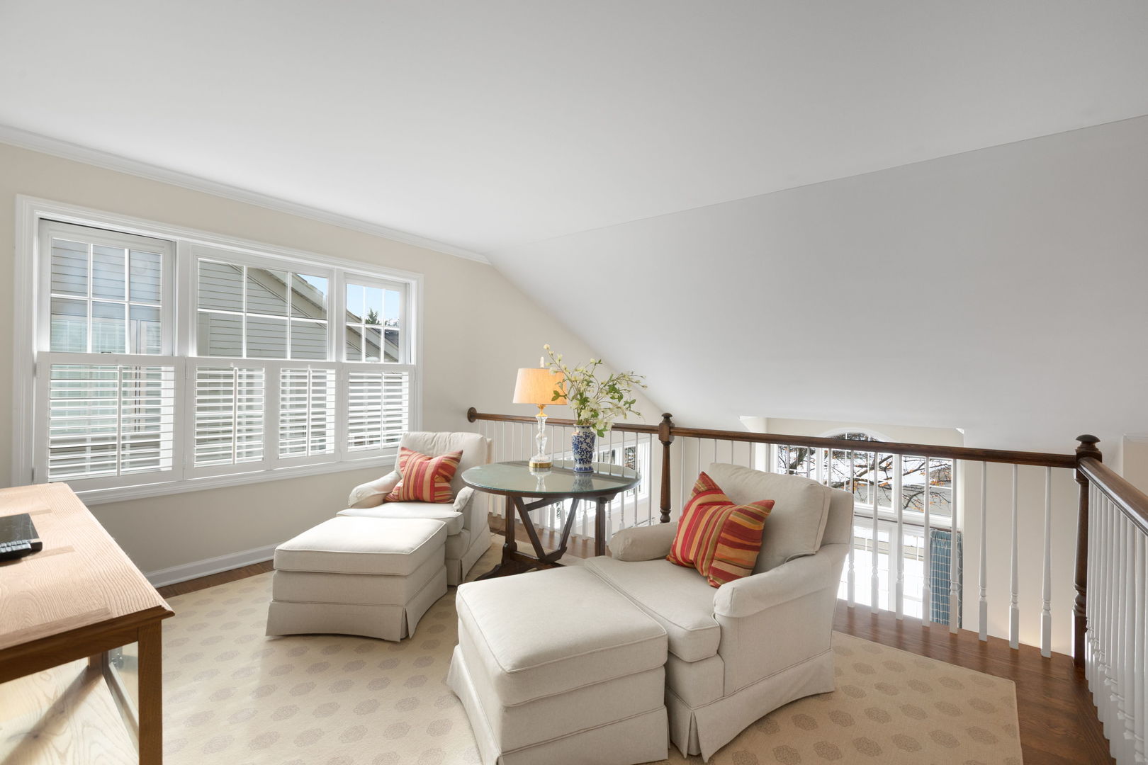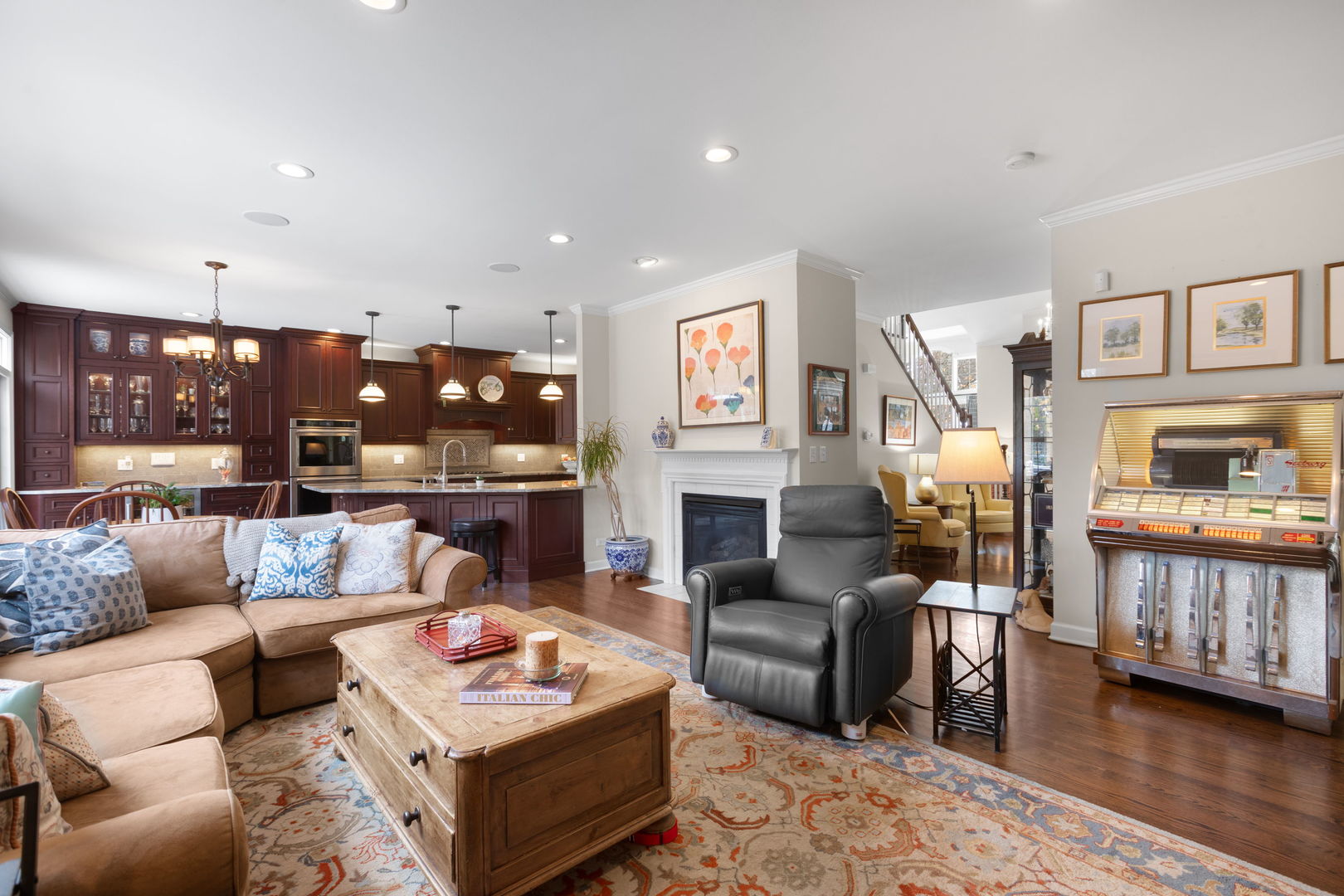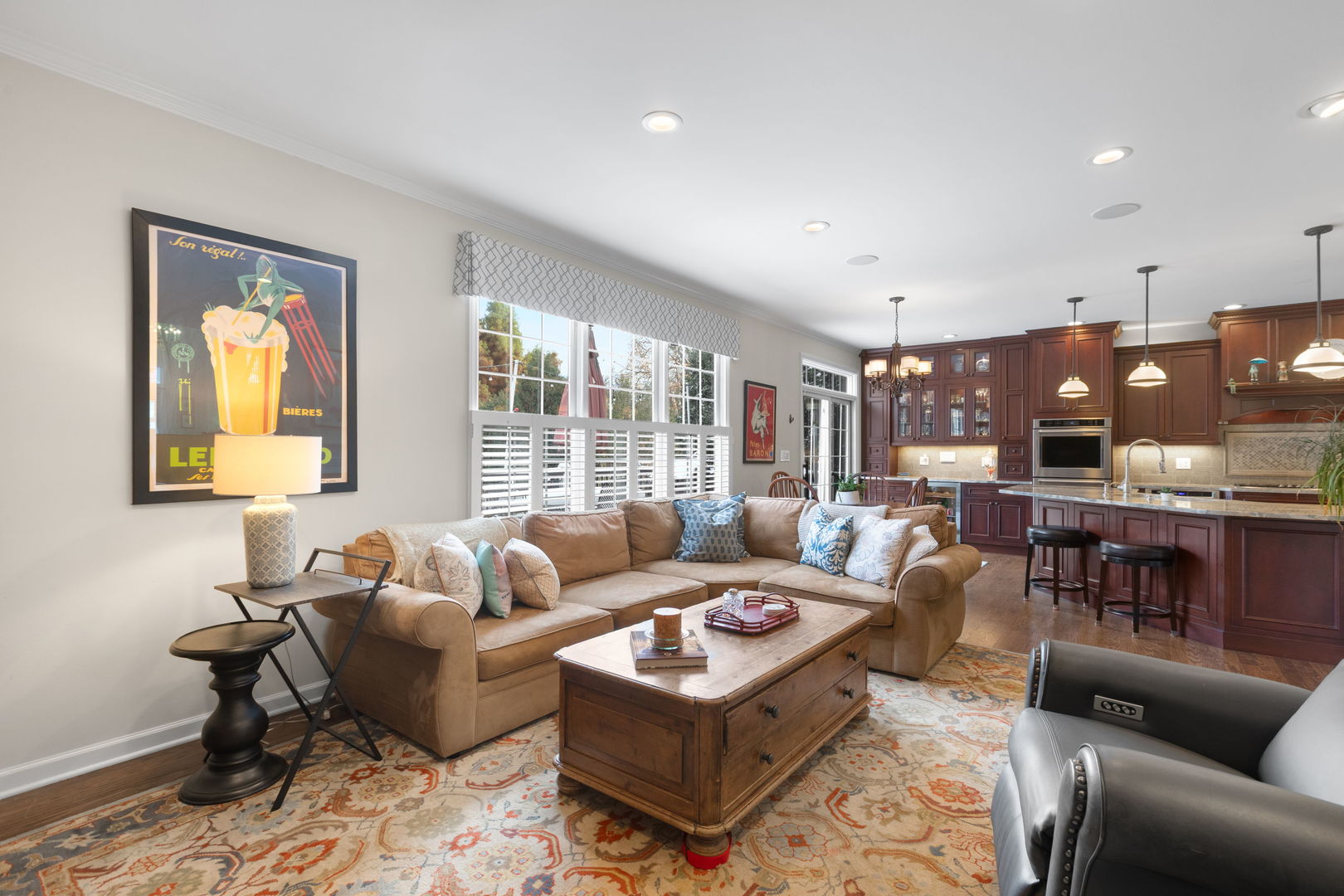 The best of both worlds! Experience maintenance-free living paired with the comfort of a first-floor primary suite and a beautifully landscaped private backyard. This elegant brick home welcomes you with timeless curb appeal, a charming front porch, and a grand two-story foyer featuring hardwood floors and a striking palladium window. The vaulted-ceiling living room is filled with natural light from large windows and seamlessly flows into a formal dining room accented by a graceful chandelier-perfect for entertaining. At the heart of the home, the open-concept kitchen is a chef’s dream. Rich custom cabinetry (including glass-front displays), quartzite countertops, and premium appliances elevate the space-featuring a Sub-Zero refrigerator, Thermador 5-burner cooktop, KitchenAid double ovens and dishwasher, and a Subzero beverage refrigerator. A sliding door leads from the kitchen to an expansive all-Trex deck, overlooking the lush, maturely landscaped backyard and a firepit with Lannon stone surround and path-ideal for gatherings year-round. Beautiful garden with custom low voltage lighting system. The inviting family room includes recessed lighting, plantation shutters, and a cozy gas fireplace, creating a warm atmosphere for everyday living. The first-floor primary suite offers comfort and sophistication with rich crown molding, two custom walk-in closets, and a luxurious en-suite bath featuring limestone tile, five shower heads including body sprays and rainhead plus a bench, whirlpool tub, double vanity, abundant storage, and window with plantation shutters for privacy. A stylish powder room with mosaic marble tile flooring and walls, and a convenient mud/laundry room with updated cabinetry and countertops with extra deep Kohler laundry sink complete the main level. Upstairs, a spacious loft with hardwood floors provides versatile living space, along with two generous bedrooms (one with a walk-in closet), an office, and a full bath with a walk-in shower. The lower level offers excellent storage and the potential to be finished for additional living or recreation space. Enjoy the perfect blend of luxury, function, and ease-all in a beautifully maintained home designed for comfortable living and entertaining.