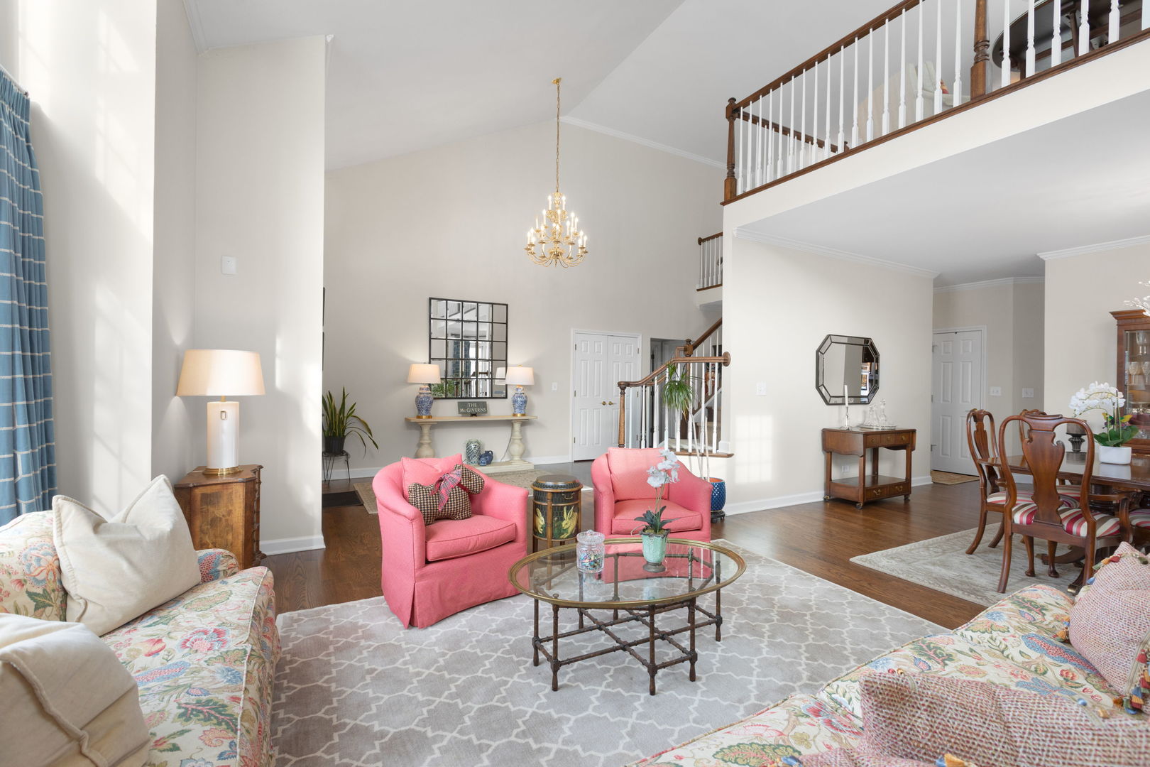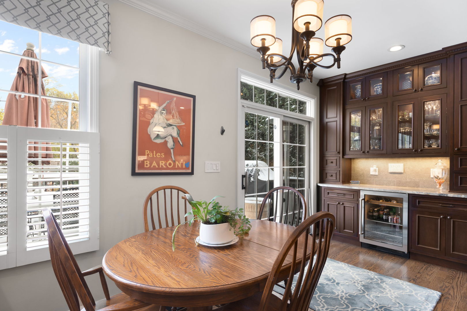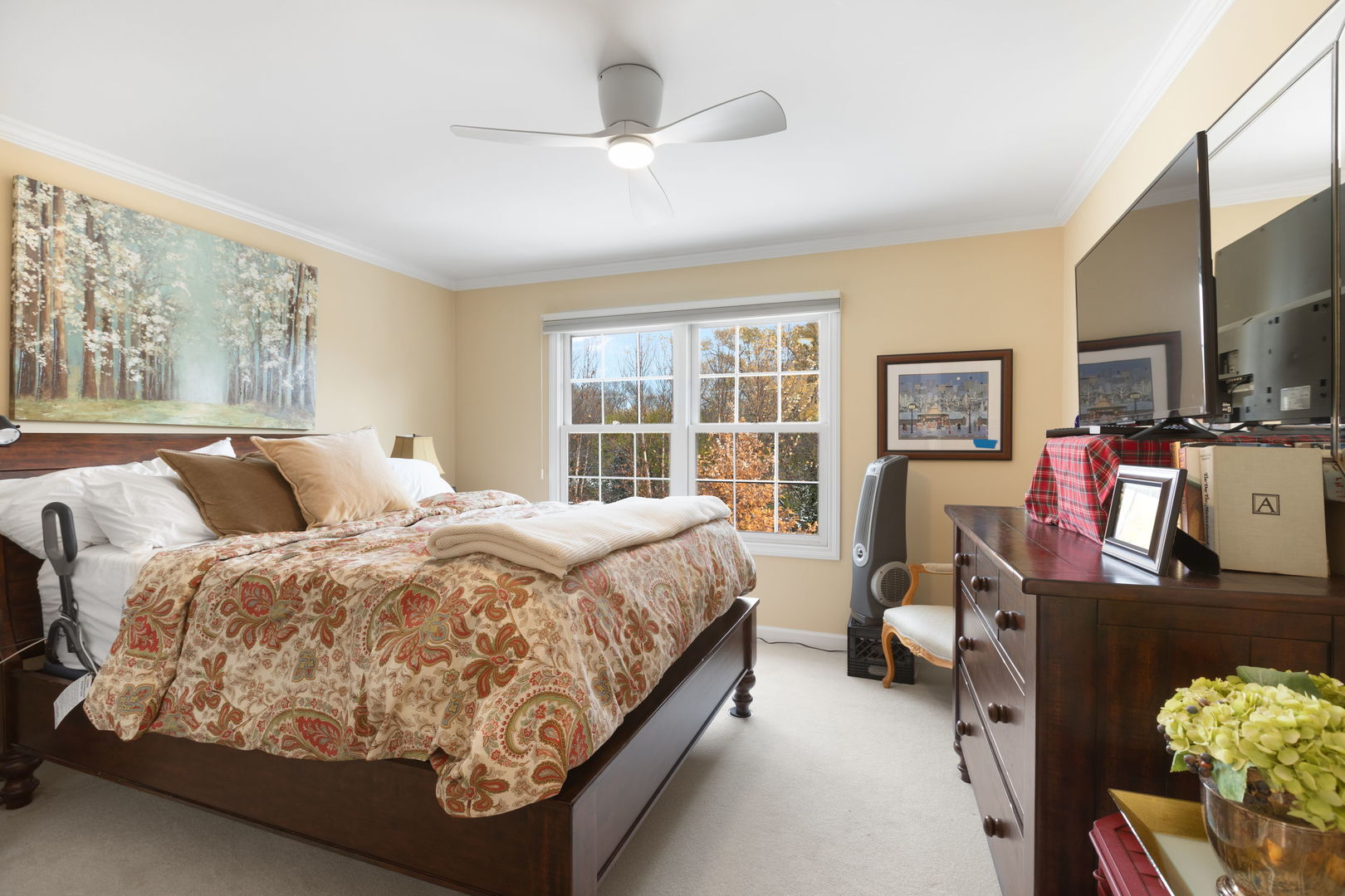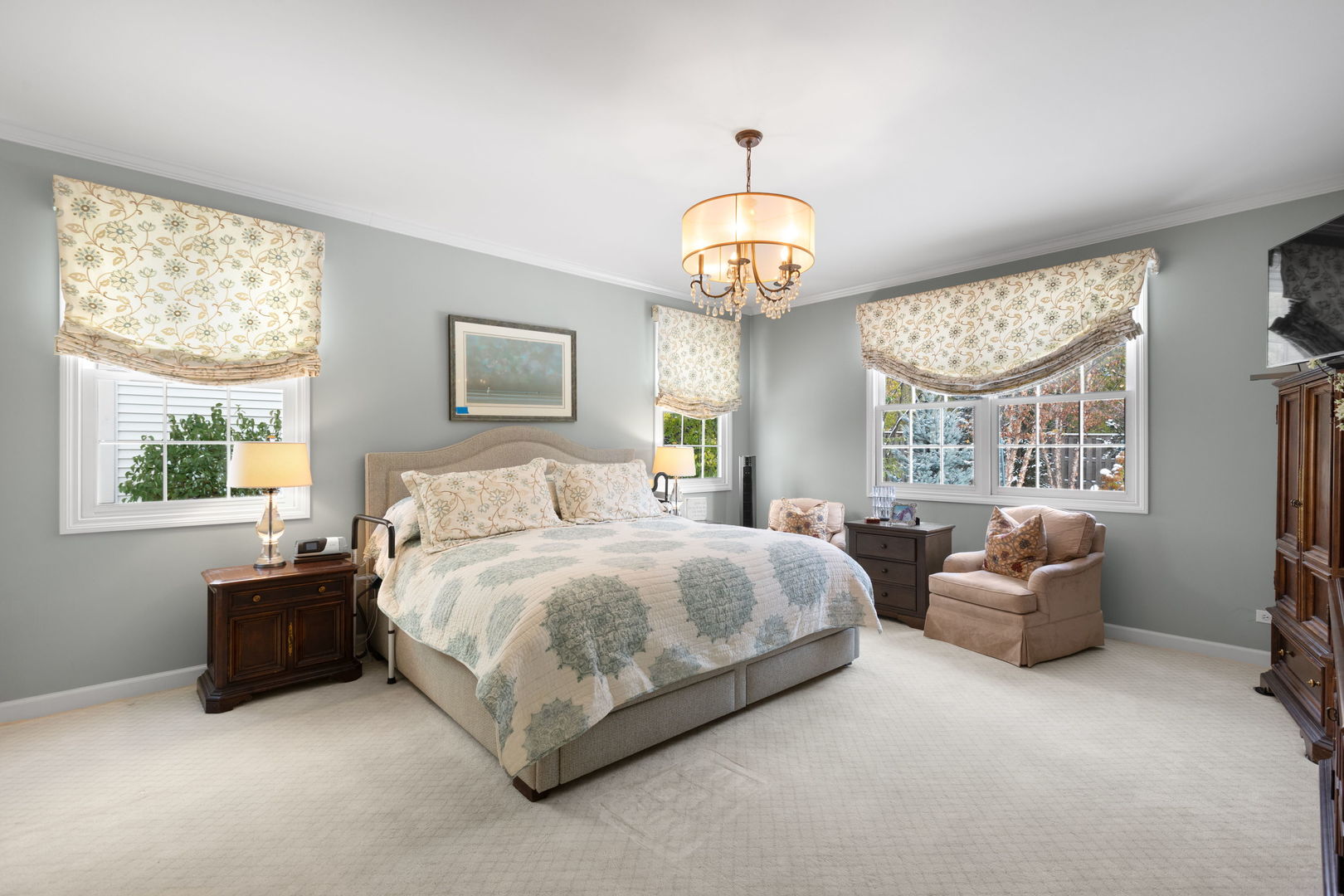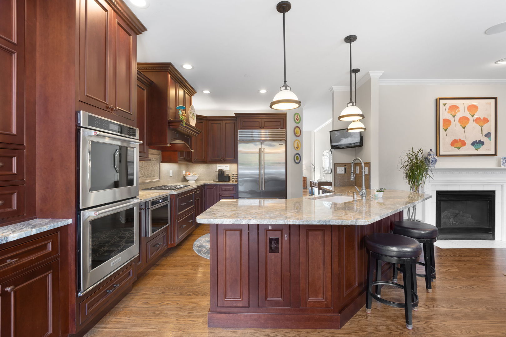 The best of both worlds! Experience maintenance-free living paired with the comfort of a first-floor primary suite and a beautifully landscaped private backyard. This elegant brick home welcomes you with timeless curb appeal, a charming front porch, and a grand two-story foyer featuring hardwood floors and a striking palladium window. The vaulted-ceiling living room is filled with natural light from large windows and seamlessly flows into a formal dining room accented by a graceful chandelier-perfect for entertaining. At the heart of the home, the open-concept kitchen is a chef’s dream. Rich custom cabinetry (including glass-front displays), quartzite countertops, and premium appliances elevate the space-featuring a Sub-Zero refrigerator, Thermador 5-burner cooktop, KitchenAid double ovens and dishwasher, and a Subzero beverage refrigerator. A sliding door leads from the kitchen to an expansive all-Trex deck, overlooking the lush, maturely landscaped backyard and a firepit with Lannon stone surround and path-ideal for gatherings year-round. Beautiful garden with custom low voltage lighting system. The inviting family room includes recessed lighting, plantation shutters, and a cozy gas fireplace, creating a warm atmosphere for everyday living. The first-floor primary suite offers comfort and sophistication with rich crown molding, two custom walk-in closets, and a luxurious en-suite bath featuring limestone tile, five shower heads including body sprays and rainhead plus a bench, whirlpool tub, double vanity, abundant storage, and window with plantation shutters for privacy. A stylish powder room with mosaic marble tile flooring and walls, and a convenient mud/laundry room with updated cabinetry and countertops with extra deep Kohler laundry sink complete the main level. Upstairs, a spacious loft with hardwood floors provides versatile living space, along with two generous bedrooms (one with a walk-in closet), an office, and a full bath with a walk-in shower. The lower level offers excellent storage and the potential to be finished for additional living or recreation space. Enjoy the perfect blend of luxury, function, and ease-all in a beautifully maintained home designed for comfortable living and entertaining.