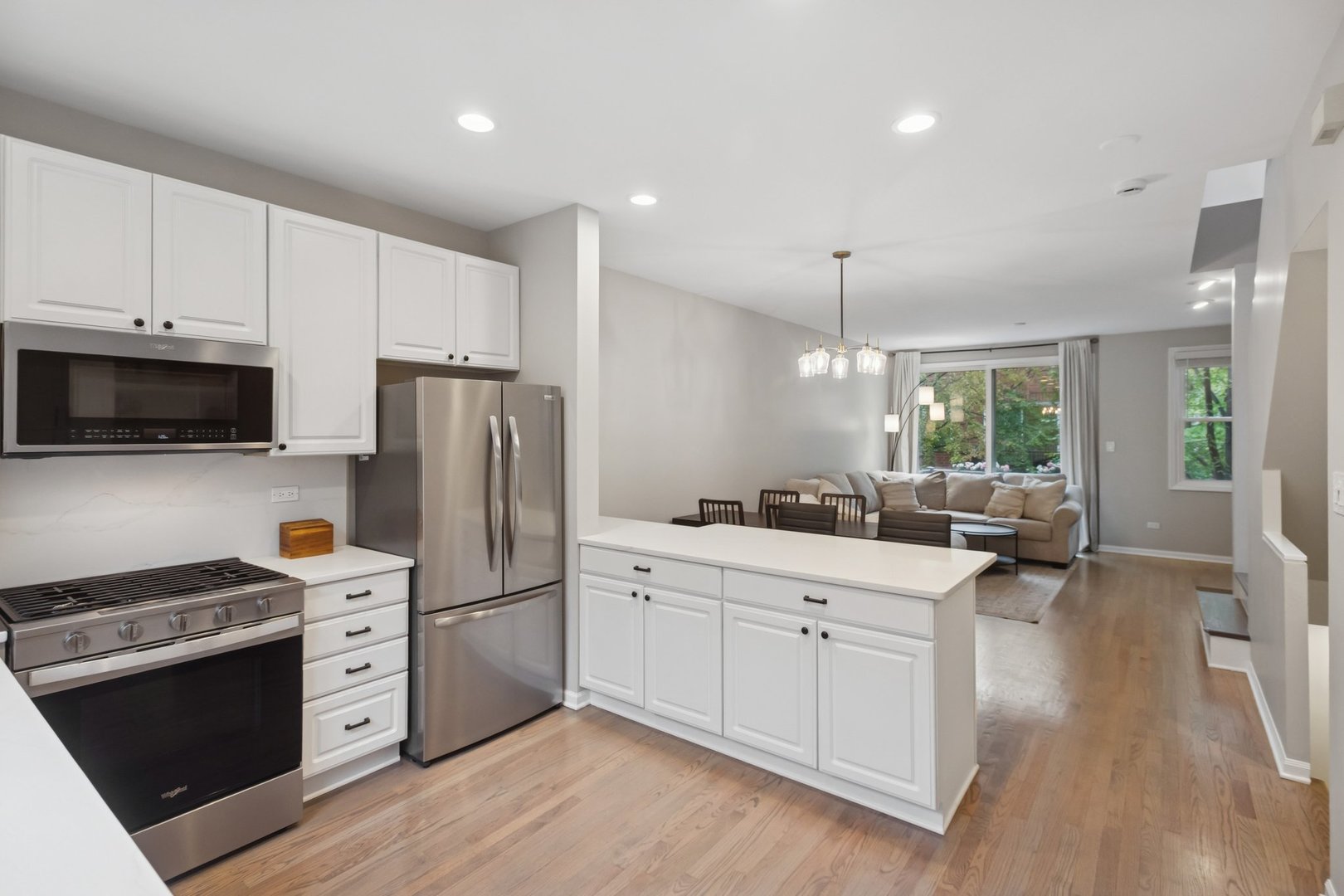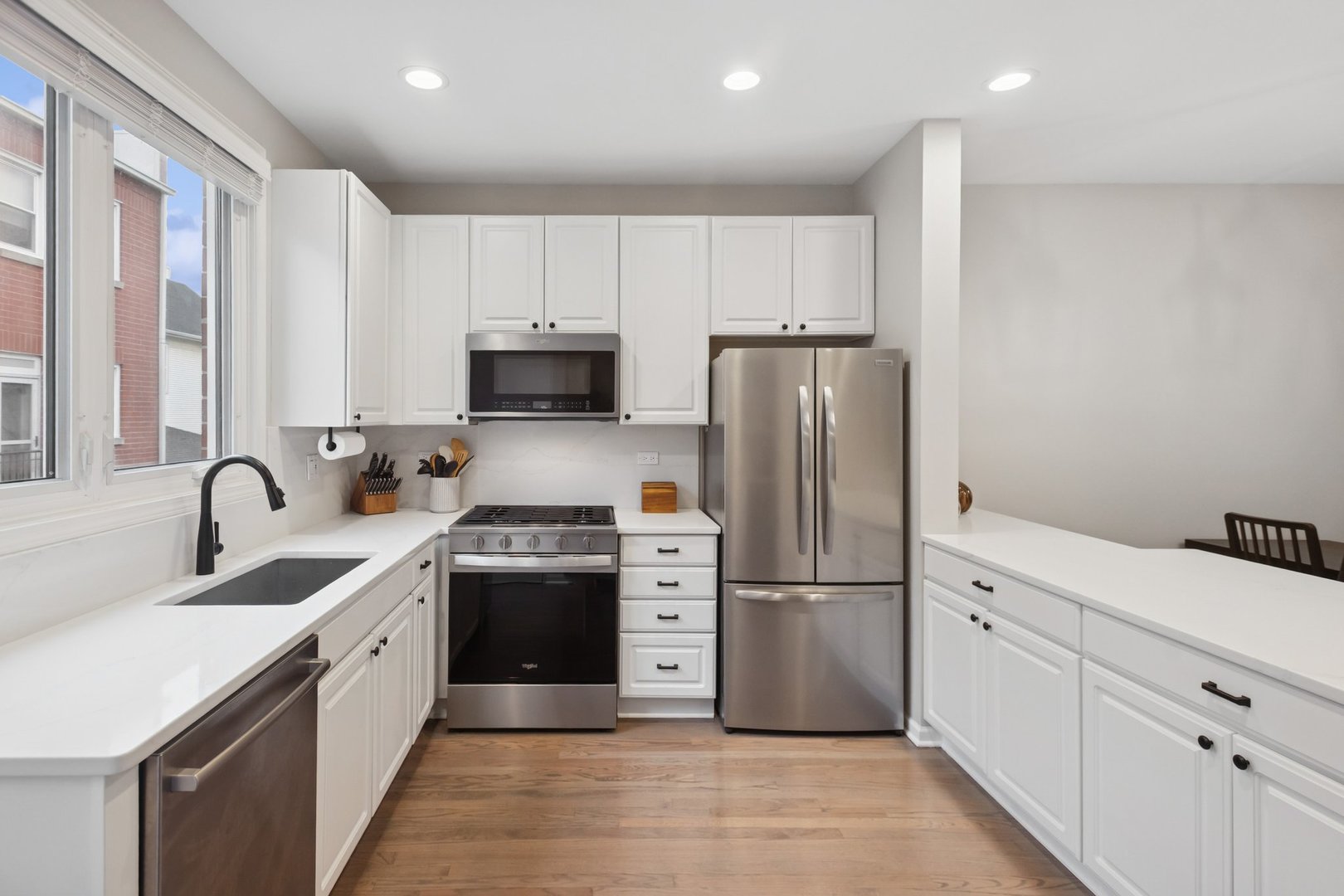 Welcome home to your RENOVATED TOWNHOME in West Lakeview/ Roscoe Village. Here’s your chance to live in one of Chicago’s most revered GATED communities – Landmark Village. This stylish, UPDATED townhome offers three full levels of flexible living space designed for modern life, LIVING LIKE A SINGLE-FAMILY HOME. On the open-concept main floor, you’ll love the NATURAL LIGHT pouring through glass sliding doors that open to a private balcony-perfect for morning coffee or winding down after work. The hardwood floors and fireplace add warmth, while the refreshed kitchen shines with NEW stainless-steel appliances, NEW Quartz countertops/backsplash, white shaker cabinetry, and a newly installed beverage/coffee center with additional storage. Upstairs, two LARGE sunny bedrooms offer custom closets, an updated full bath, linen closet, and a SKYLIGHT over the staircase brings in even more natural sun light. Downstairs features an en-suite bath and a third bedroom room that also works beautifully as a home office, cozy den, or gym. Enjoy another one of your TWO OUTDOOR SPACES, right out the sliding door. The patio leads to the lovely courtyard withe even more space for your own garden or to have pets or children run and play! Conveniently, you can also access your own ATTACHED GARAGE with plenty of room for storage. There is also enough space for another exterior parking spot. This stunning home is ready for you to move right in! UPDATES galore, 2025: kitchen counters, custom coffee bar/storage, refrigerator, stove & oven. Freshly updated bathrooms. NEW light fixtures throughout. NEW paint throughout. 2024: blinds & window treatments. Primary closet built-out & ALL NEW interior doors. 2022: NEW hardwood flooring, & more! Monthly assessment includes: cable & internet, and covers the exterior of the home including roof, siding, deck, windows, and common are maintenance. Not only will you be in the wonderful tight-knit community, you’ll be just steps from parks, public transportation, shopping, and all the best restaurants, boutiques, and that this neighborhood has to offer. Come see this perfect home today!