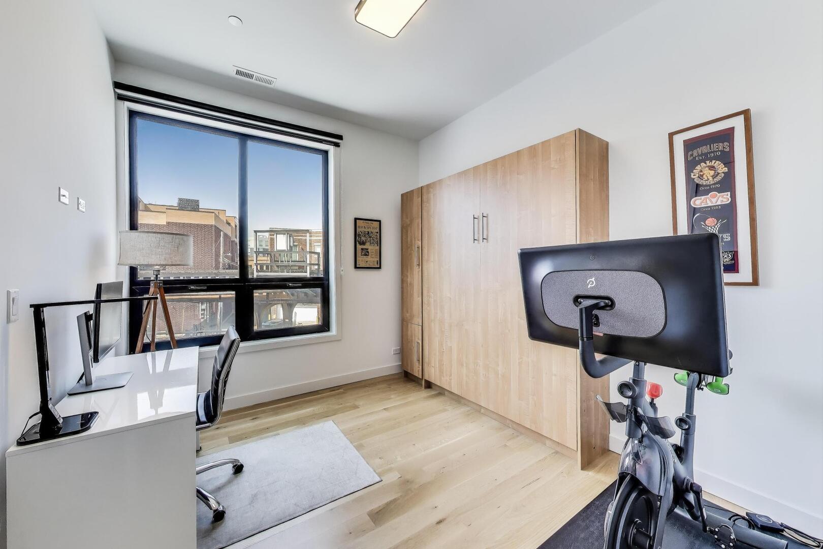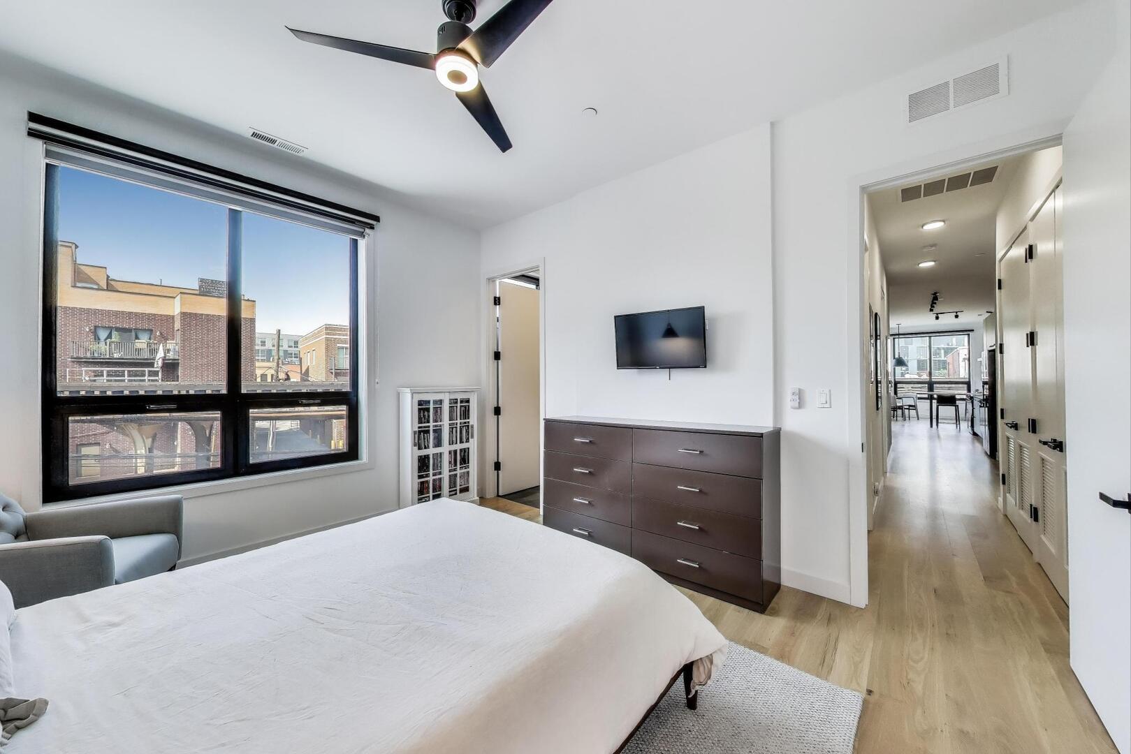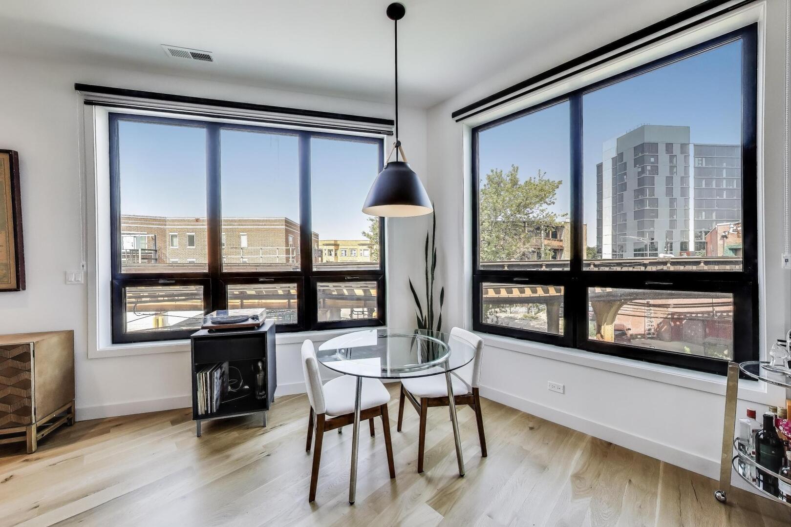 Luxury Modern Living in Prime Logan Square | 2023 New Construction Corner Unit Steps from the Blue Line. Welcome to this stunning 2-bed, 2-bath corner-unit condo, ideally located in the heart of Logan Square-just a 2-minute walk to the California Blue Line. Built in 2023, this newer construction home boasts designer finishes, a smart open-concept layout, and sun-drenched living spaces thanks to expansive windows in every room. Step inside to find wide plank white oak flooring flowing throughout the main living areas, complemented by soaring ceilings and abundant natural light. The chef’s kitchen is a showstopper, featuring custom cabinetry with sleek black hardware, a dramatic full-wall brick backsplash, quartz countertops, a large eat-in island, and high-end Samsung black stainless steel appliances-perfect for entertaining or quiet mornings at home. The spacious primary suite is a true retreat, complete with a large walk-in closet, custom lighting, a floating double vanity, and a luxurious walk-in shower with a rainfall showerhead and floor-to-ceiling porcelain tile. The second bedroom is fully outfitted with a custom Murphy bed, making it ideal as a home office, guest room, or both. The second bath includes a deep soaking tub, a custom glass door, and elegant tile finishes. Enjoy indoor-outdoor living with a covered balcony featuring a gas hookup, outlet, and finished in low-maintenance Trex decking, perfect for savoring coffee at sunrise or cocktails at sunset. Additional highlights include triple-pane windows for superior soundproofing, a full-size Samsung washer/dryer, and heated garage parking with an EV charger hook-up and additional outlet included in the price.