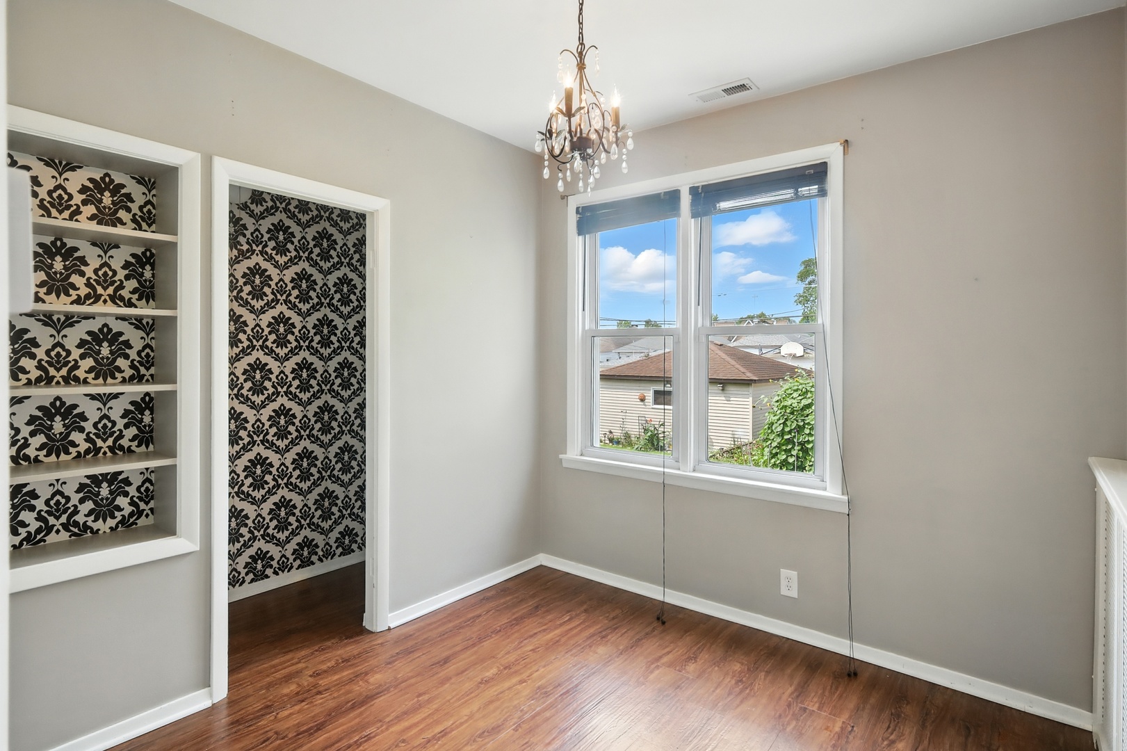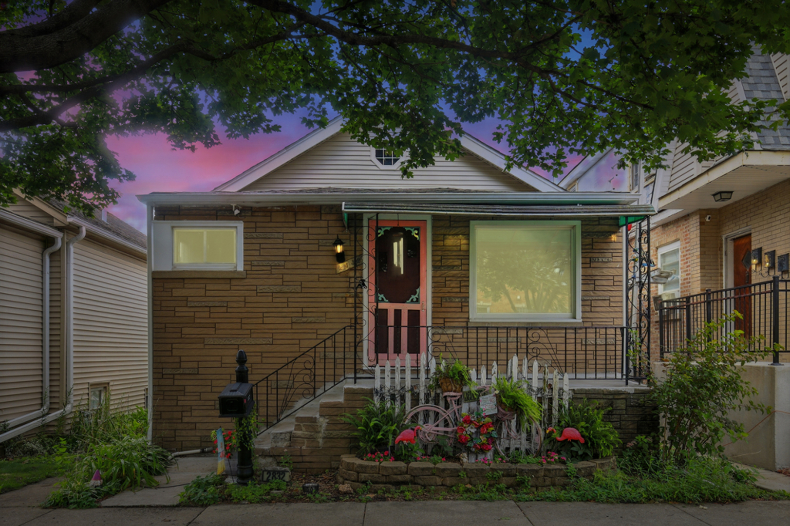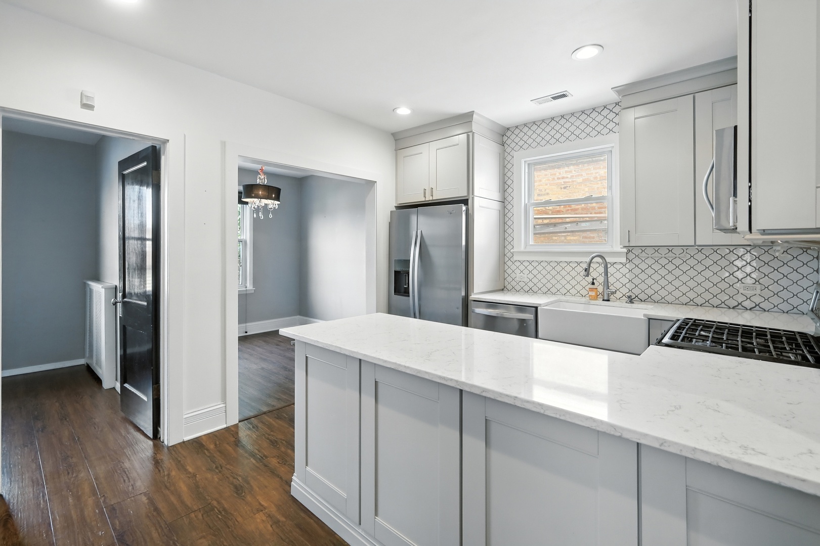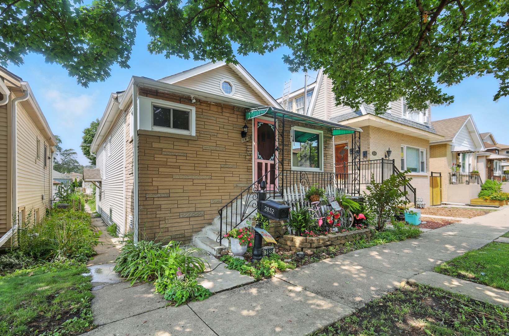 Elmwood Park 3 bedroom has gleaming hardwood floors throughout. Living room has crown molding. Newer, modern kitchen has granite countertops, stainless steel appliances, canned lights, farm style sink and 42″ cabinets. Full bath recently redone with ceramic tile floor, ceramic tile shower surround and large glass block window for plenty of natural light. Elegant dining room overlooks spacious mature yard with new gutters around the house, brick paver patio and two car garage with electronic opener. Finished basement area has newer plank flooring and multiple windows for abundant sunlight. Walk to award winning grammar school! Pride of ownership! Come see for yourself!! Hurry!!!