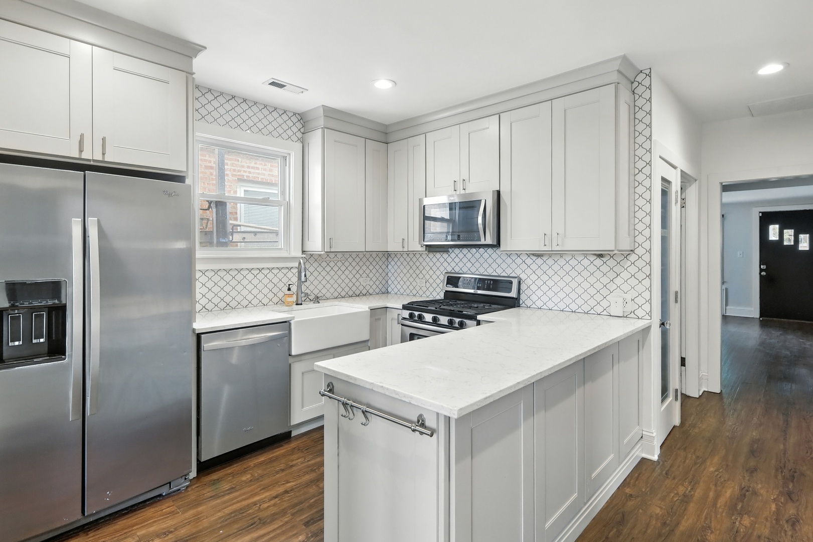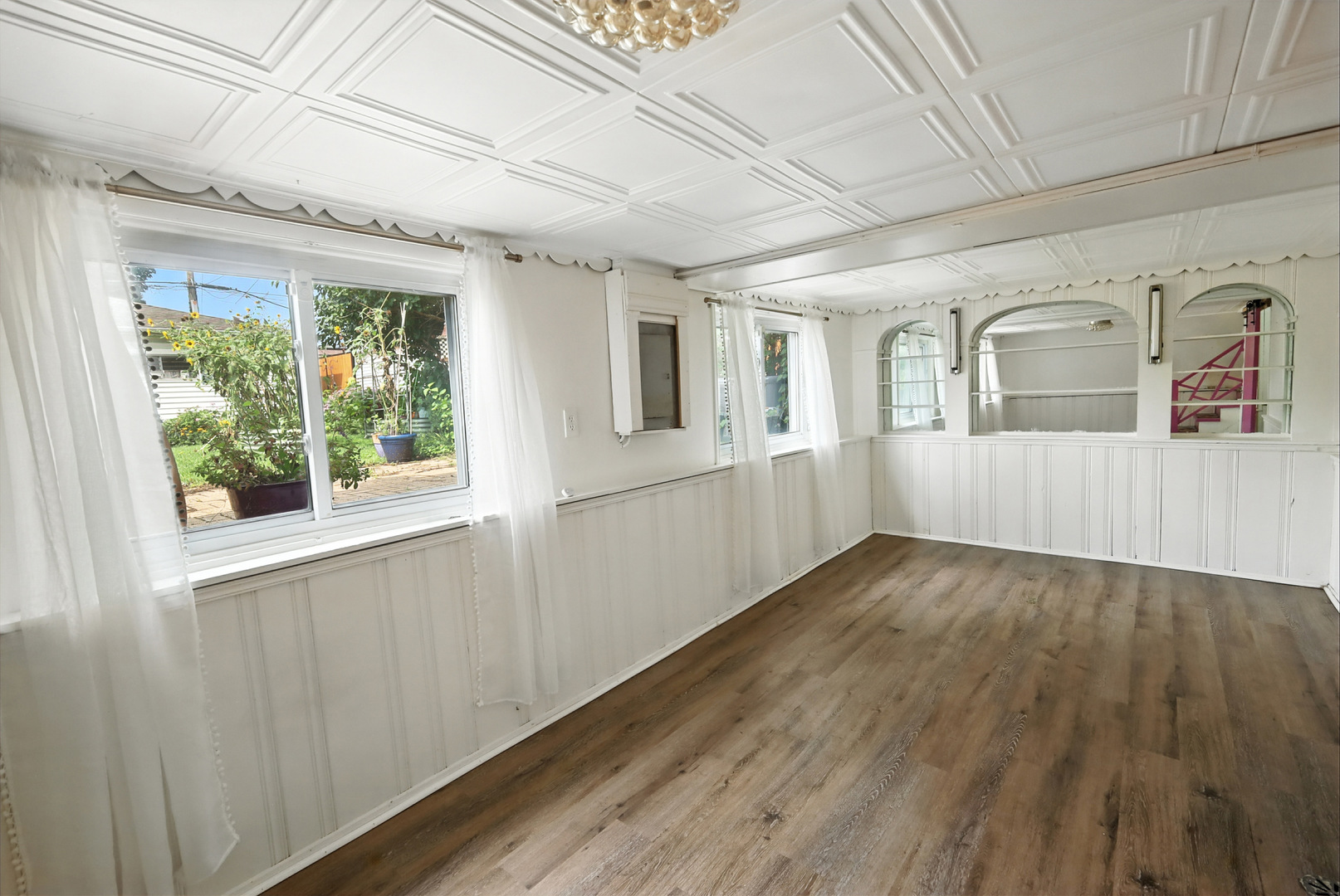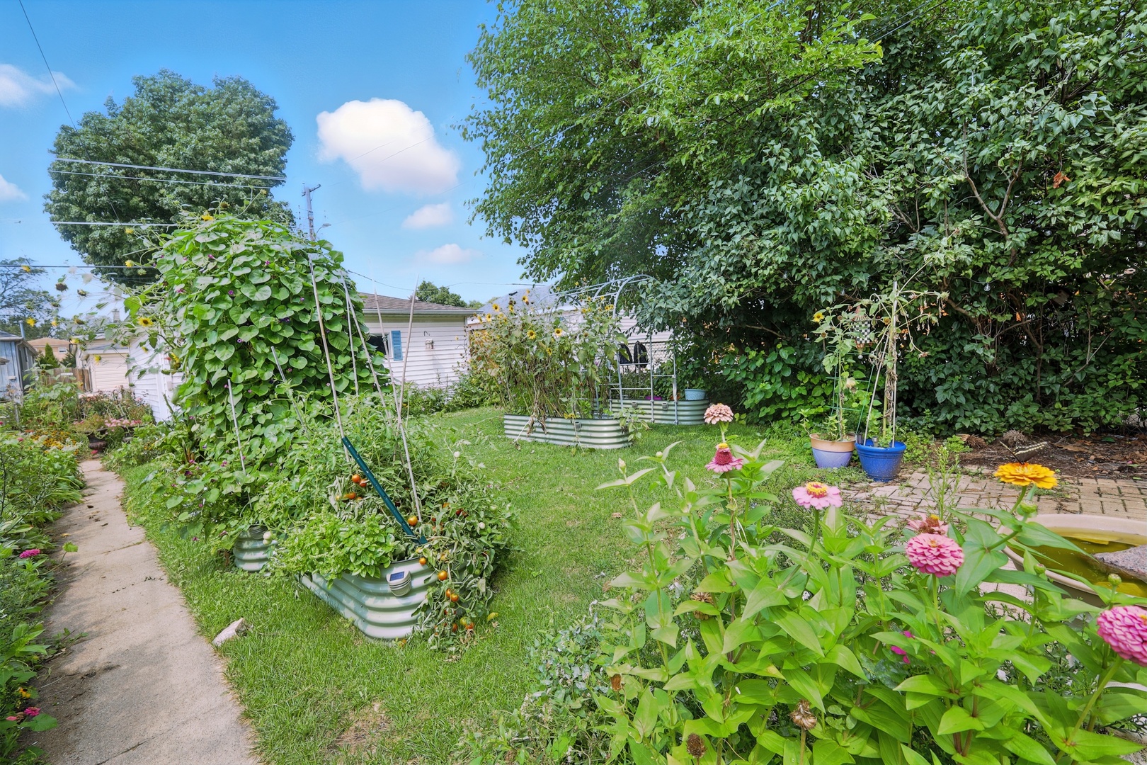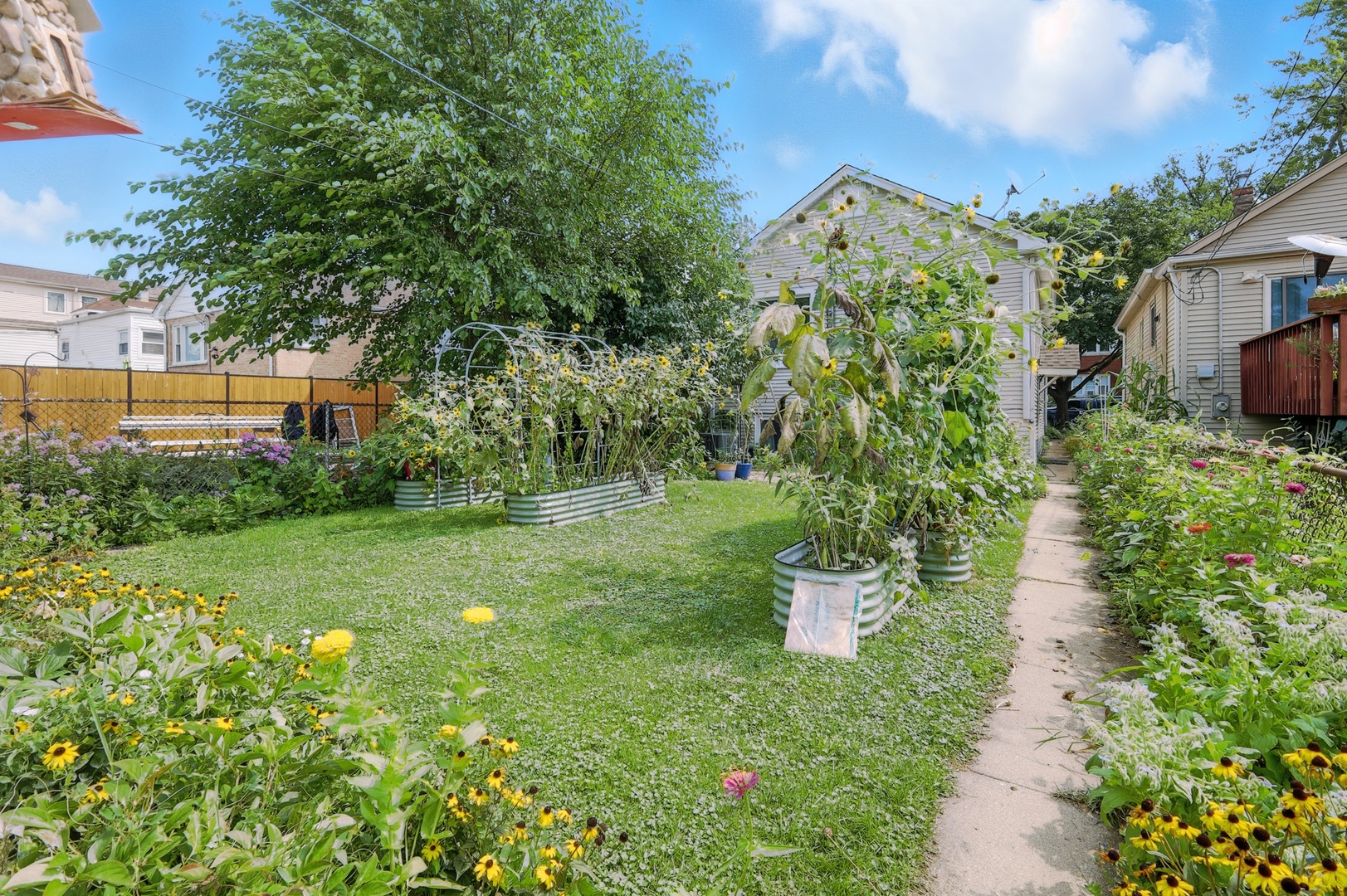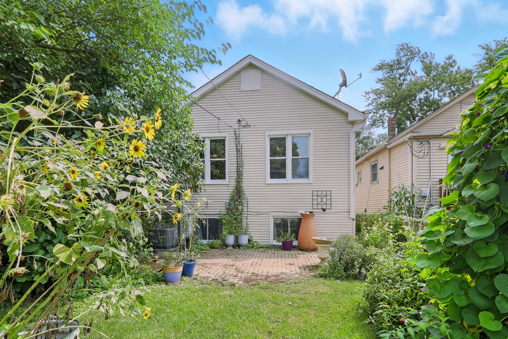 Elmwood Park 3 bedroom has gleaming hardwood floors throughout. Living room has crown molding. Newer, modern kitchen has granite countertops, stainless steel appliances, canned lights, farm style sink and 42″ cabinets. Full bath recently redone with ceramic tile floor, ceramic tile shower surround and large glass block window for plenty of natural light. Elegant dining room overlooks spacious mature yard with new gutters around the house, brick paver patio and two car garage with electronic opener. Finished basement area has newer plank flooring and multiple windows for abundant sunlight. Walk to award winning grammar school! Pride of ownership! Come see for yourself!! Hurry!!!