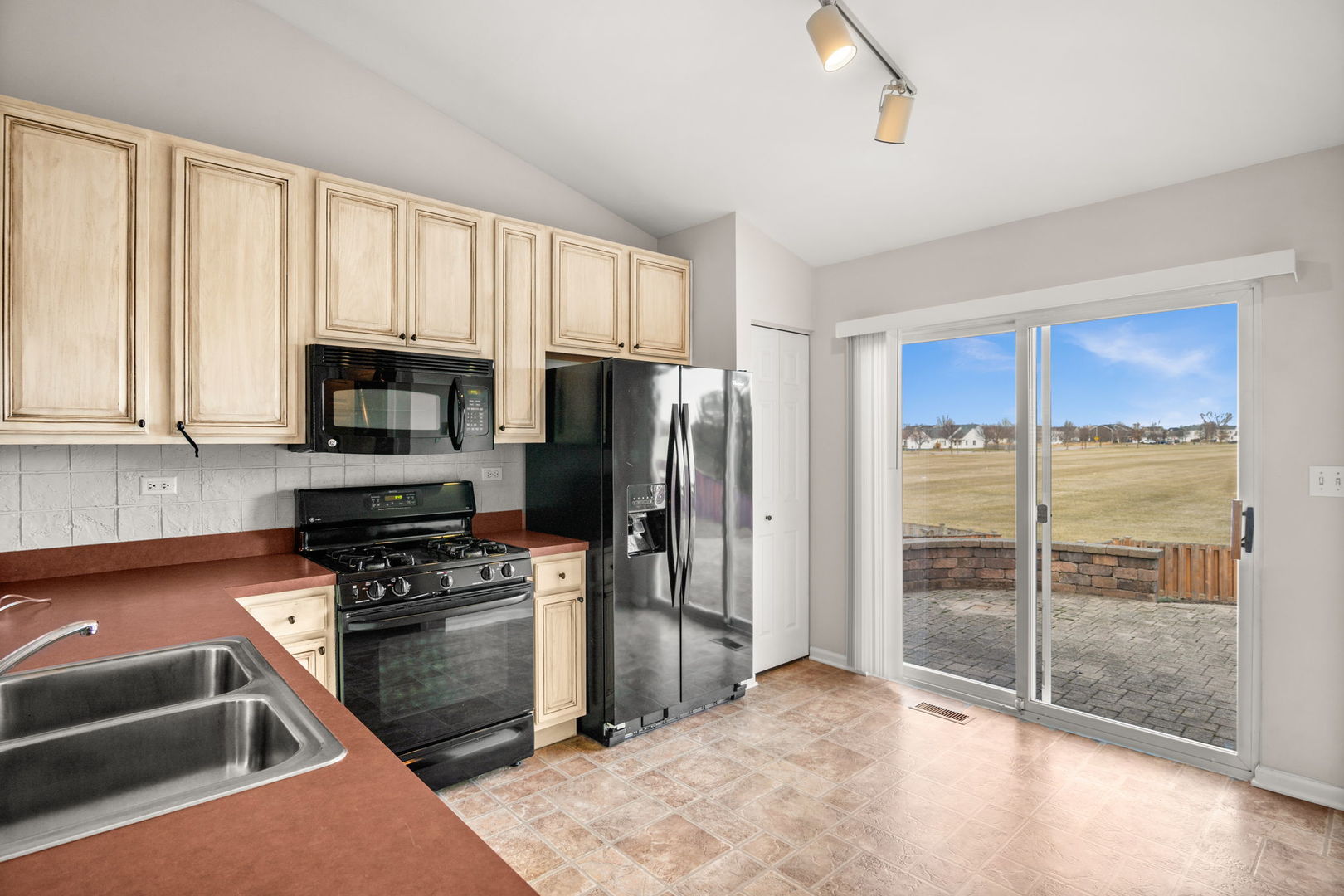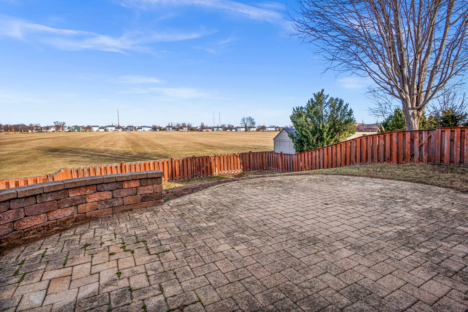 This inviting one story half duplex in Montgomery Crossings offers easy living with thoughtful features inside and out. Set on a fenced and landscaped lot, the home includes a covered front porch, a spacious paver patio, and a peaceful backyard that backs to open space and the elementary school, making it easy to enjoy daily walks, nearby parks, and the network of bike and walking paths. Inside, modern neutral decor pairs beautifully with a vaulted living room that flows into the dining area, creating a bright and open feel. The eat in kitchen features 42 inch custom cabinetry and a sliding door that leads right out to the patio, perfect for everyday meals or entertaining. The primary bedroom includes a walk in closet and private bath with walk-in shower, while the second bedroom sits just steps from a full hall bathroom with tub/shower combo. A two car tandem garage offers pull down stairs to floored attic and built-in custom cabinetry for additional storage, and with no HOA fees, this home delivers flexibility and value. Enjoy summer evenings watching the Fourth of July fireworks from your own patio, with pricing that reflects the age of the roof for added opportunity.