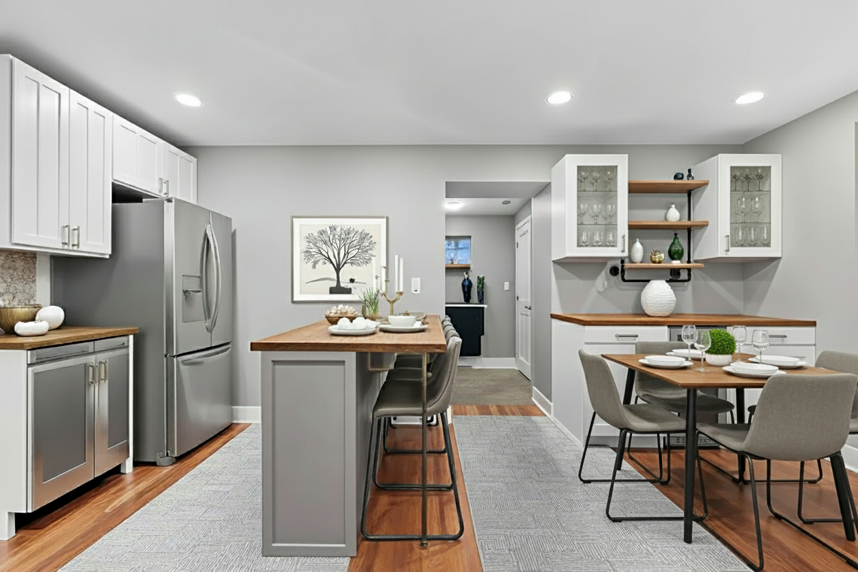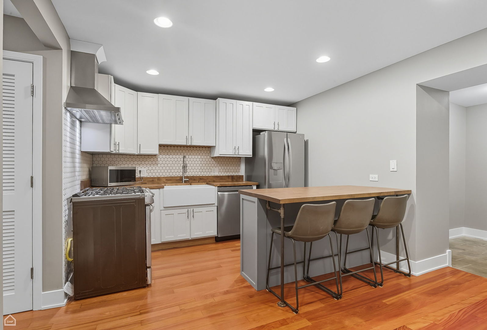 Bright and spacious 2 bed/2 bath garden-level condo in a charming brick 8-unit building on a quiet, tree-lined street. This home features an updated kitchen with new cabinets, stainless steel appliances, a brand-new island topped with butcher block countertops, a built-in dry bar with wine refrigerator, and generous storage space, all with room for a full dining table. The primary bath offers natural stone finishes and a whirlpool tub, while the second full bath has been tastefully updated with a walk-in shower and a modern vanity. Freshly painted and move-in ready, the condo boasts newly refinished hardwood floors, high ceilings, central air, and gas-forced heat. A versatile mudroom provides additional storage and doubles as an ideal home office or creative workspace. Step outside to your private outdoor deck, perfect for entertaining, relaxing, or gardening. Secure gated parking is included, along with the convenience of in-unit laundry. Just 2.5 blocks from Logan Boulevard and four blocks from the Blue Line, with quick access to I-90/94, this home is within easy walking distance of shops, restaurants, farmers markets, and green spaces that make Avondale and Logan Square such sought-after neighborhoods.