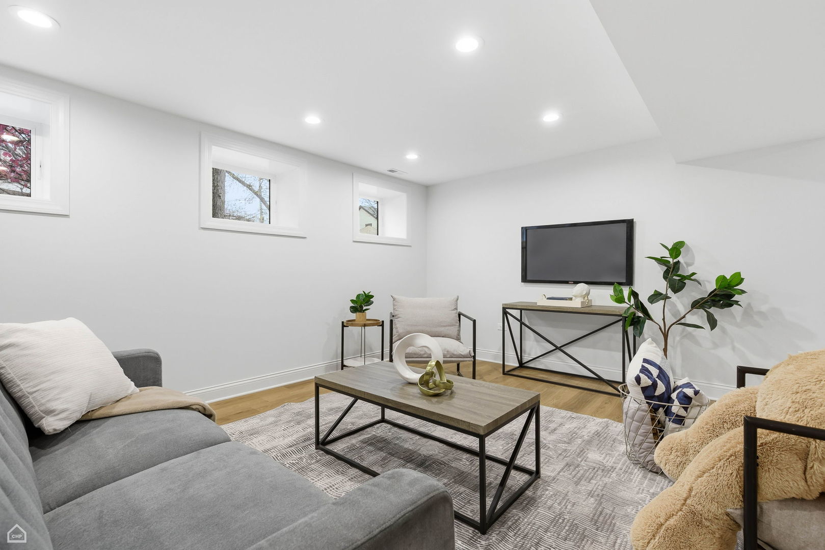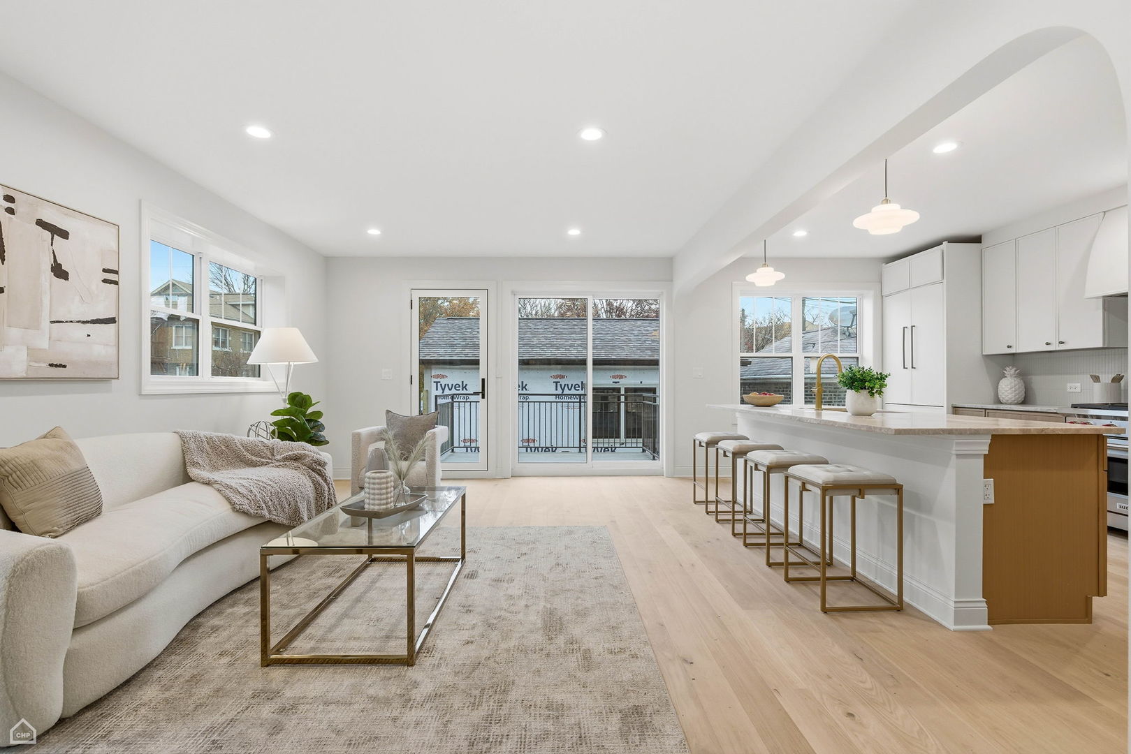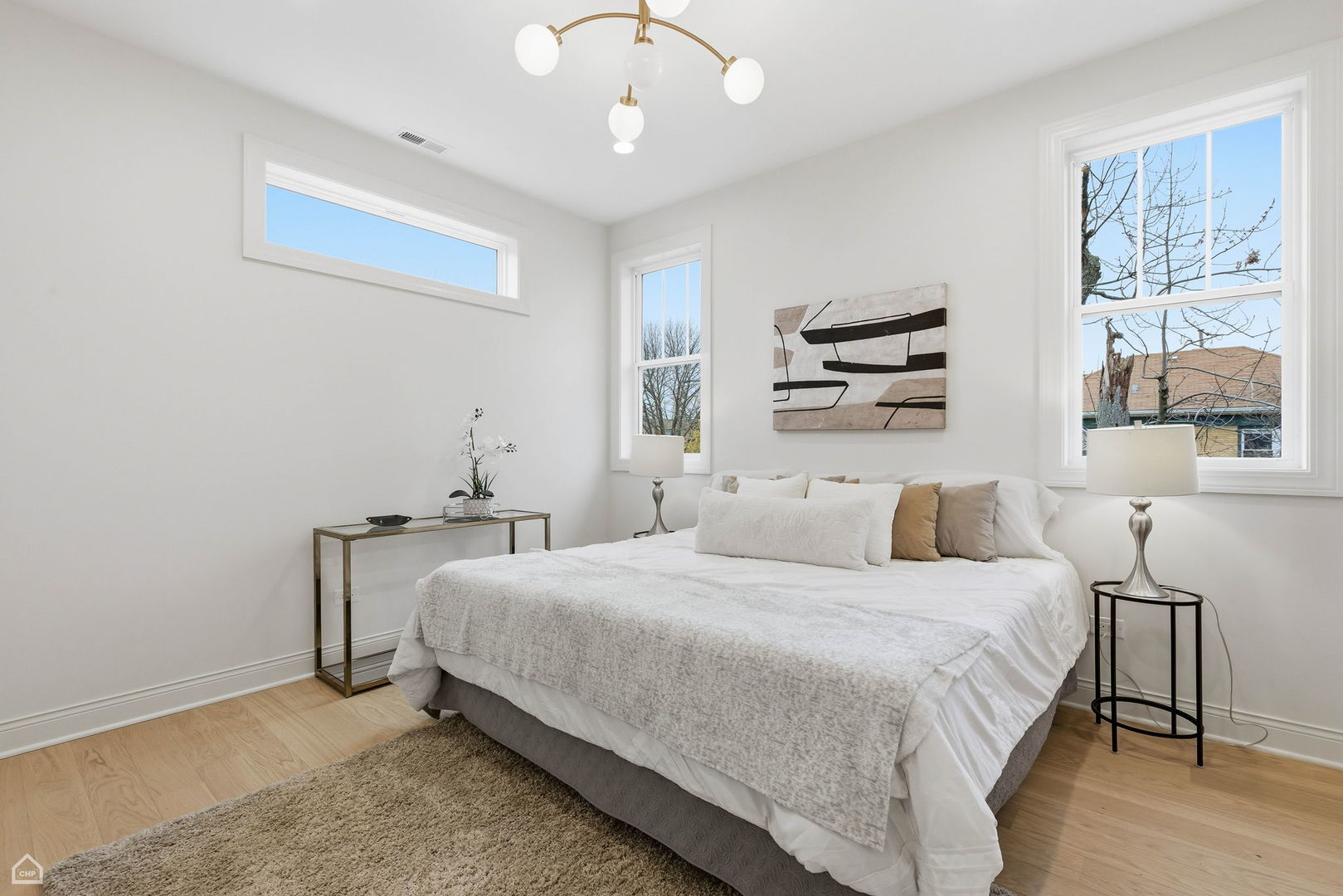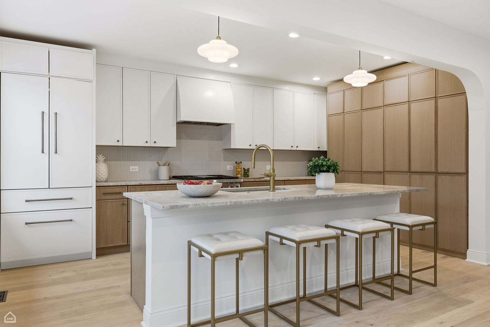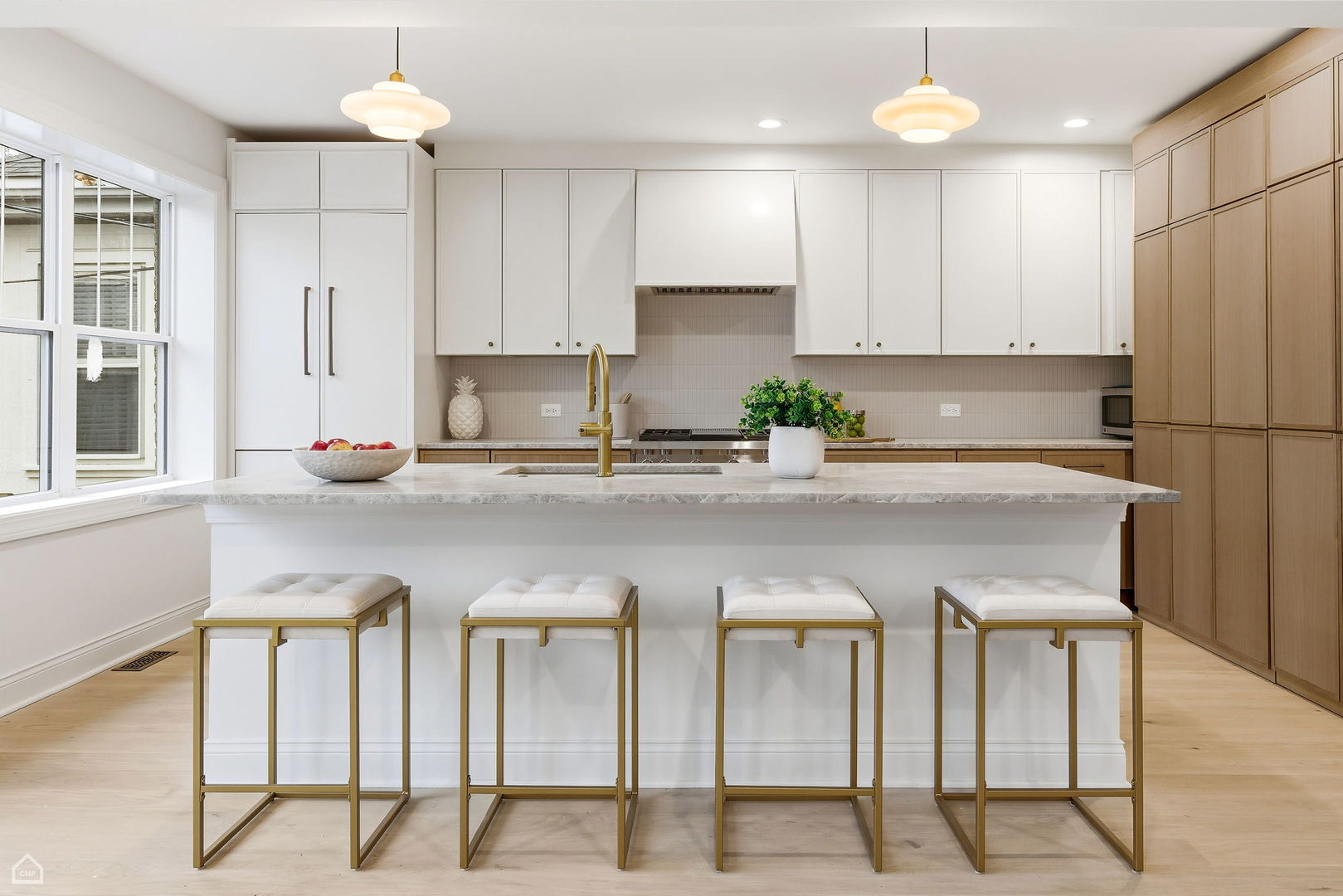 Located in the heart of the prestigious Ravenswood Manor, this fully remodeled corner bungalow is a true masterpiece of design and elegance. Spanning an impressive 3,500 square feet, this home exudes sophistication with its six bedrooms and four beautifully appointed bathrooms. Upon entry, the sun-drenched foyer welcomes you into a seamless flow of living spaces, including an inviting living area, formal dining room, and family room, all perfect for both everyday living and effortless entertaining. The designer kitchen is a culinary enthusiast’s dream, featuring custom cabinetry, a Monogram fridge, Wolf stove, Bosch dishwasher, and exquisite Taj Mahal Quartzite countertops, complemented by a unique “speakeasy” pantry that adds a touch of intrigue. The main level also includes a versatile bedroom that can serve as a quiet office or welcoming guest room, alongside a convenient full bath. A new Trex deck off the kitchen extends the living space outdoors, offering the perfect spot for grilling and gathering. Ascend to the impressive second-floor addition, where a luxurious primary suite awaits, complete with a full bathroom and a generous walk-in closet. Each additional bedroom on this level is thoughtfully designed with its own walk-in closet, and a second full bathroom adds convenience. The second-floor laundry room enhances everyday efficiency. The fully finished lower level, adorned with durable Duralux flooring, offers an expansive family room with a wet bar, providing a perfect complement to main-level entertaining. This level also features two additional bedrooms, a full bathroom, and a second laundry room, ideal for accommodating guests or extended family. Outside, the yard provides a serene oasis for relaxation, seamlessly connecting to a detached two-car garage. A prime location steps away from a vibrant community park and the Brown Line Francisco EL stop, this home combines elegance, comfort, and convenience in one of Chicago’s most coveted neighborhoods. Experience the exceptional lifestyle that awaits in this remarkable Ravenswood Manor bungalow.