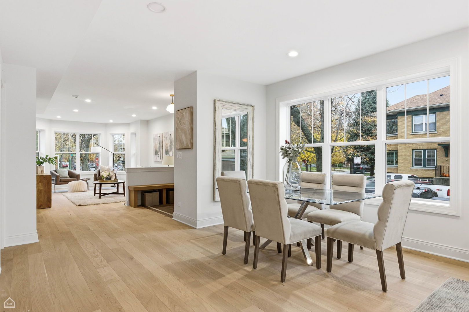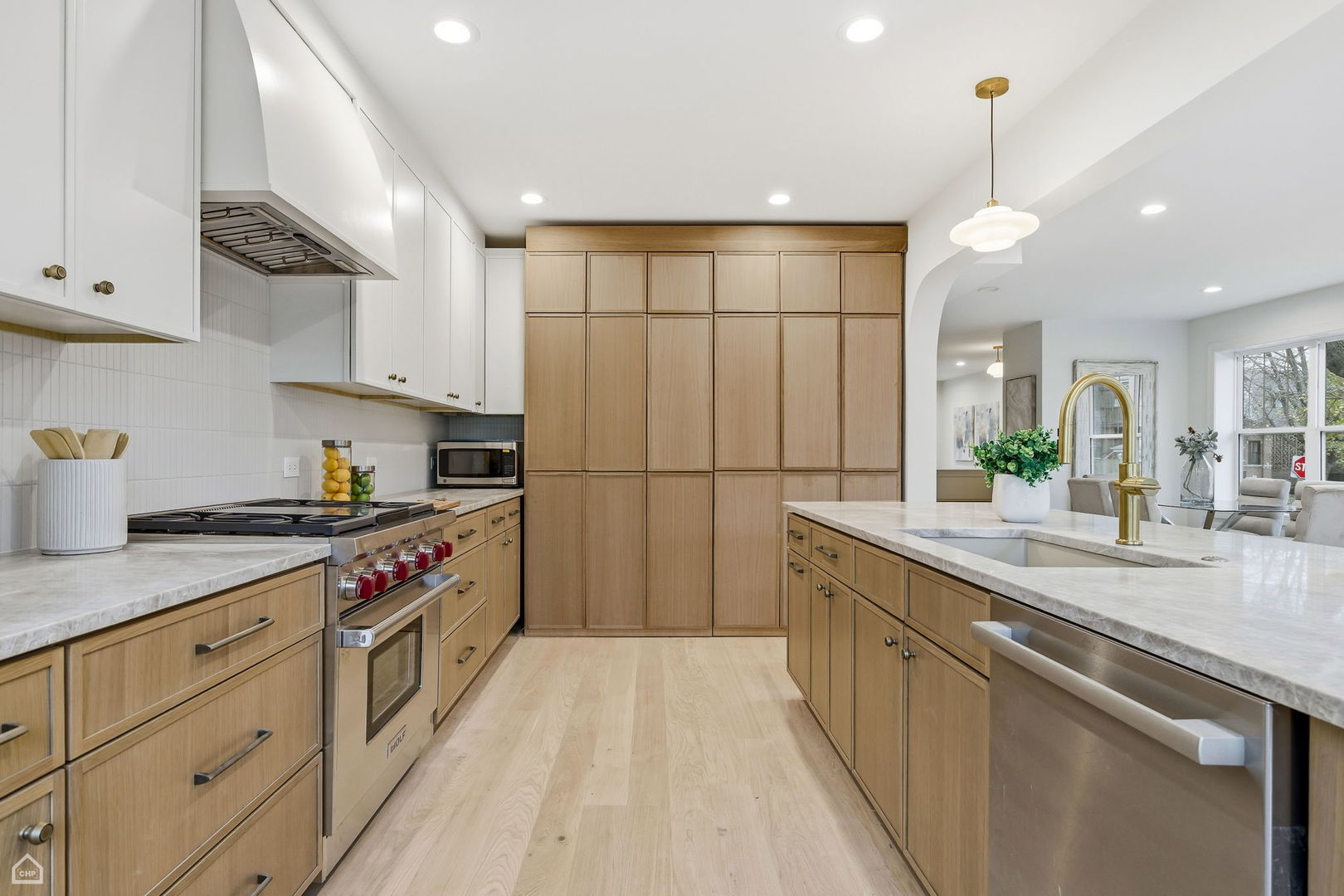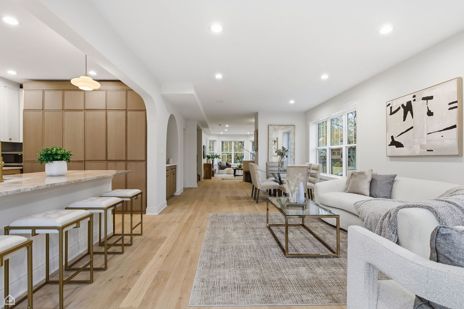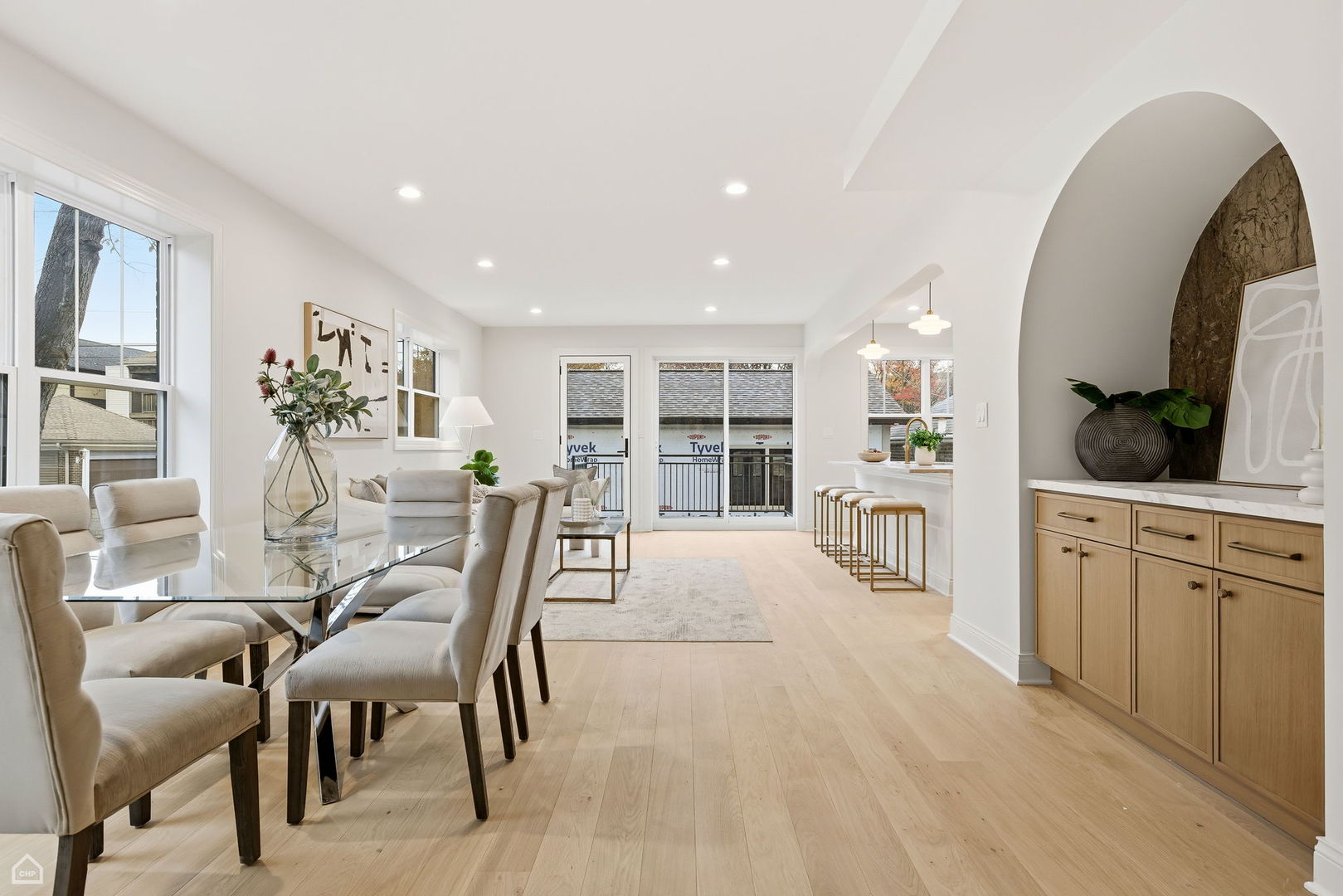 Located in the heart of the prestigious Ravenswood Manor, this fully remodeled corner bungalow is a true masterpiece of design and elegance. Spanning an impressive 3,500 square feet, this home exudes sophistication with its six bedrooms and four beautifully appointed bathrooms. Upon entry, the sun-drenched foyer welcomes you into a seamless flow of living spaces, including an inviting living area, formal dining room, and family room, all perfect for both everyday living and effortless entertaining. The designer kitchen is a culinary enthusiast’s dream, featuring custom cabinetry, a Monogram fridge, Wolf stove, Bosch dishwasher, and exquisite Taj Mahal Quartzite countertops, complemented by a unique “speakeasy” pantry that adds a touch of intrigue. The main level also includes a versatile bedroom that can serve as a quiet office or welcoming guest room, alongside a convenient full bath. A new Trex deck off the kitchen extends the living space outdoors, offering the perfect spot for grilling and gathering. Ascend to the impressive second-floor addition, where a luxurious primary suite awaits, complete with a full bathroom and a generous walk-in closet. Each additional bedroom on this level is thoughtfully designed with its own walk-in closet, and a second full bathroom adds convenience. The second-floor laundry room enhances everyday efficiency. The fully finished lower level, adorned with durable Duralux flooring, offers an expansive family room with a wet bar, providing a perfect complement to main-level entertaining. This level also features two additional bedrooms, a full bathroom, and a second laundry room, ideal for accommodating guests or extended family. Outside, the yard provides a serene oasis for relaxation, seamlessly connecting to a detached two-car garage. A prime location steps away from a vibrant community park and the Brown Line Francisco EL stop, this home combines elegance, comfort, and convenience in one of Chicago’s most coveted neighborhoods. Experience the exceptional lifestyle that awaits in this remarkable Ravenswood Manor bungalow.