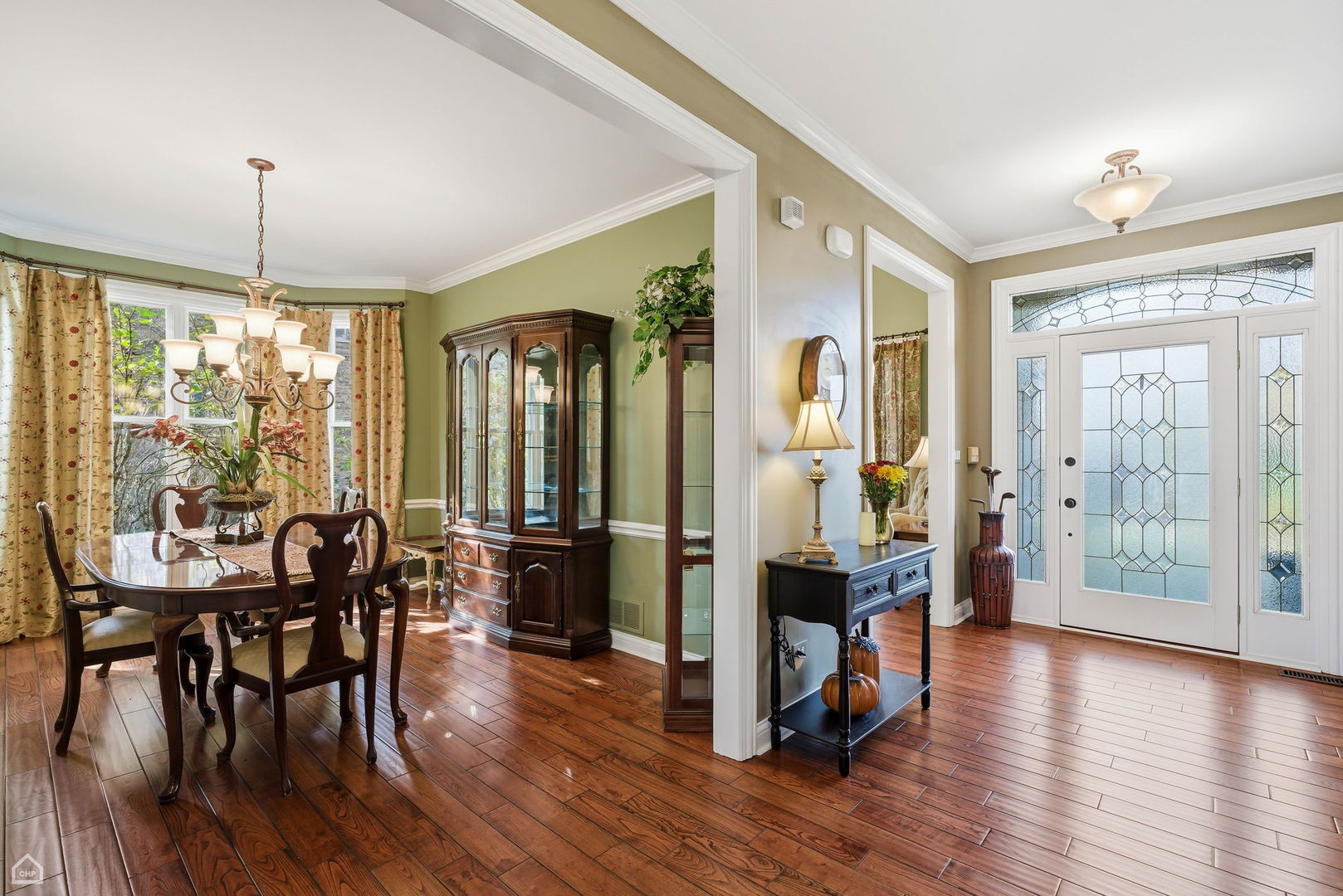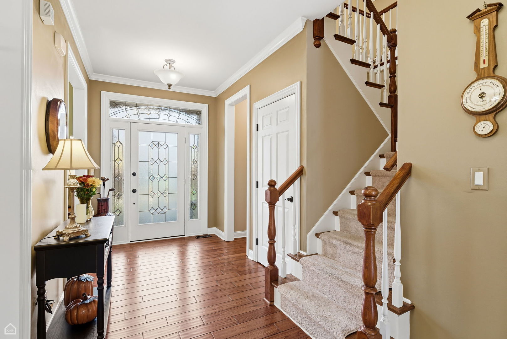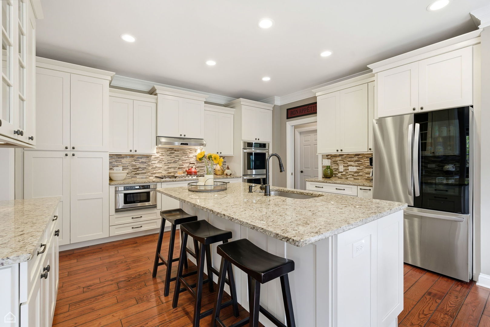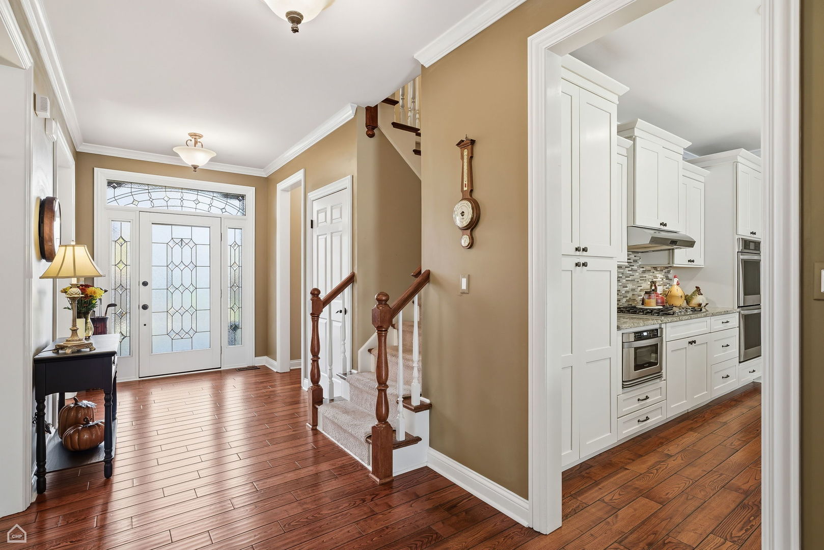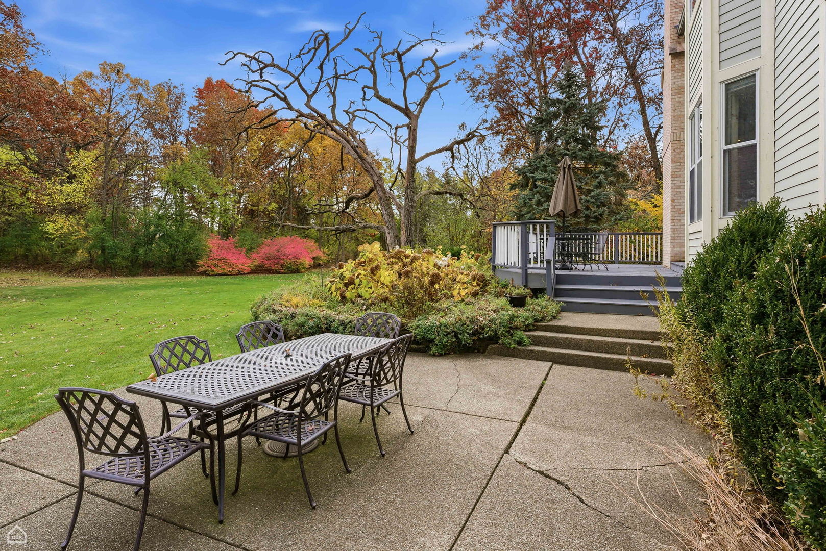 This absolutely gorgeous home offers a rare blend of stunning condition, functional utility, and private location. Boasting one of the largest sized lots in the entire subdivision, this .8 acre yard backs to a forested area of the golf course offering exceptional serene views from the rear deck and concrete patio with a highly durable James Hardie board siding. This home’s interior is designed just perfectly, with attention to detail flowing seamlessly throughout including updated light fixtures, hardwood floors, crown molding/trim, custom curtains and Hunter Douglas shades. Elegant quality and style are evident the moment one steps foot inside through the lovely seeded glass front door with matching transom/sidelight windows. The formal spaces are well appointed to serve their roles: the living room’s vaulted ceiling and chandelier make it a proper place to welcome guests and the dining room’s bay window provides room for adding one more extra leaf in the dinner table while hosting unforgettable gatherings with family and friends. While guests will enjoy themselves here, the real pleasure is reserved for the hosts/chefs who will be cooking in this incredible remodeled kitchen boasting flawless inset cabinetry with 42″ uppers, center island with breakfast bar stools, built-in pantry, built-in double ovens, windowed LG InstaView door-in-door refrigerator, granite countertops, and mosaic tile backsplash. The main floor 2nd bedroom suite with full bathroom are great for a temporary guest room or a permanent suite for those who don’t care to climb up stairs. Enjoy quiet solitude in the informal spaces: breakfasts are bright and sunny at this kitchen table with southern rear views of the woods from the bay windows and cozy up around the family room’s brick fireplace in the evening. Heading upstairs, a formal office provides space for productivity away from any noise. After work and play are done for the day, what better place to retire than in this amazing master suite with trey ceiling in the bedroom, huge walk-in closet, and an impeccable bathroom with frameless glass shower and pedestal tub. The 3rd/4th bedrooms (one featuring an additional bonus room) share a wonderfully remodeled Jack and Jill bathroom. In addition to 3,400 SQFT of above-ground living area, the finished English basement provides an additional 1,582 SQFT and continues with the combination of thoughtful design and functionality: a naturally lit recreation room for play (surround sound speakers and ping pong table are included), a wet bar and mini fridge for refreshments, a utility room for tinkering, a storage room, and a 5th bedroom (with proper egress escape window) which is adjacent to yet another full bathroom. Outdoor sprinkler irrigation, radon mitigation system, high efficiency furnace, and a 75 gallon water heater which was replaced in 2023. Ivanhoe Estates provides peace of mind with secure guard-gated entrances. Priced well under market value, let the sellers’ motivation to sell quickly be your gift to yourself this holiday season!