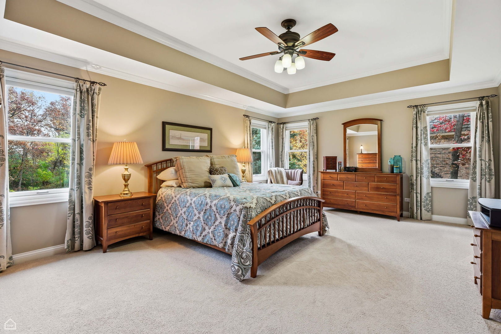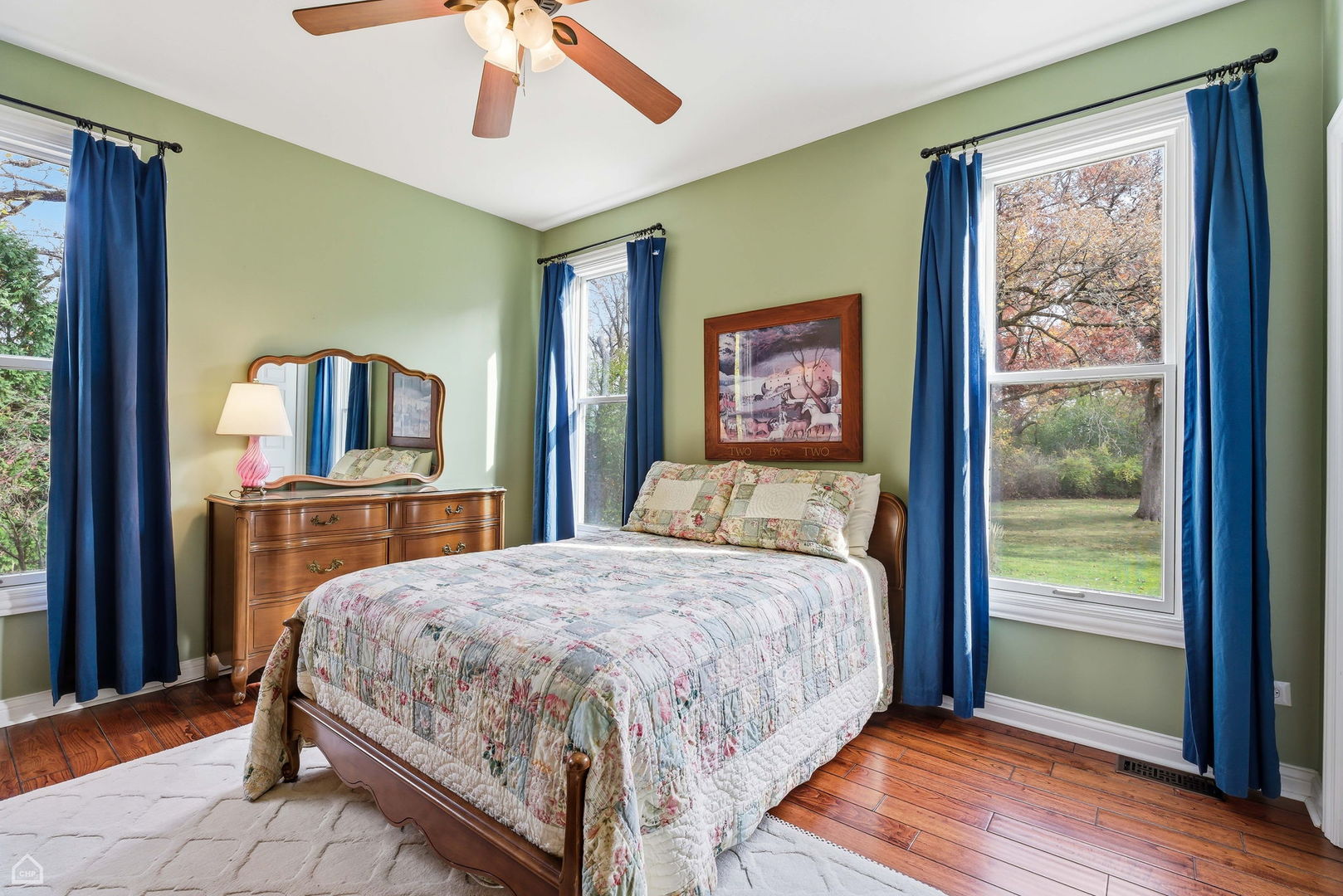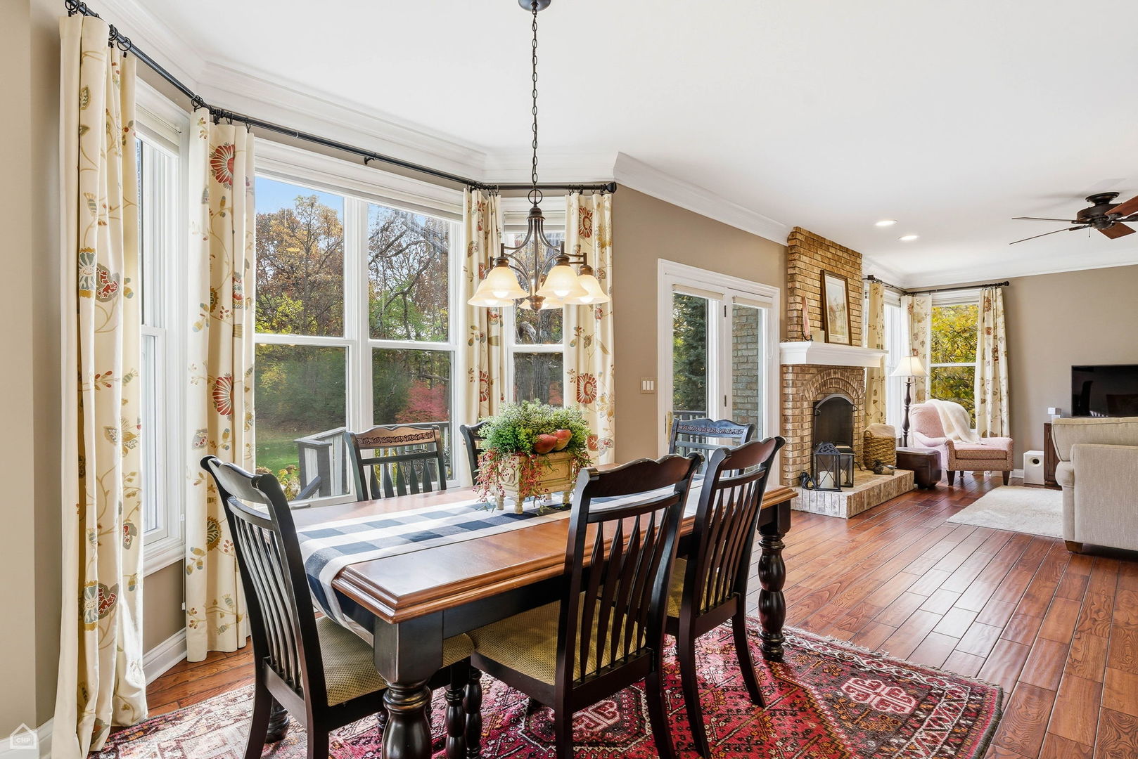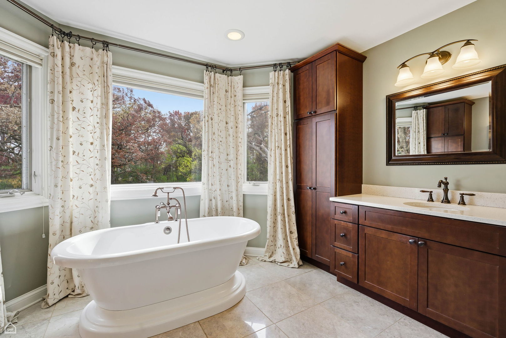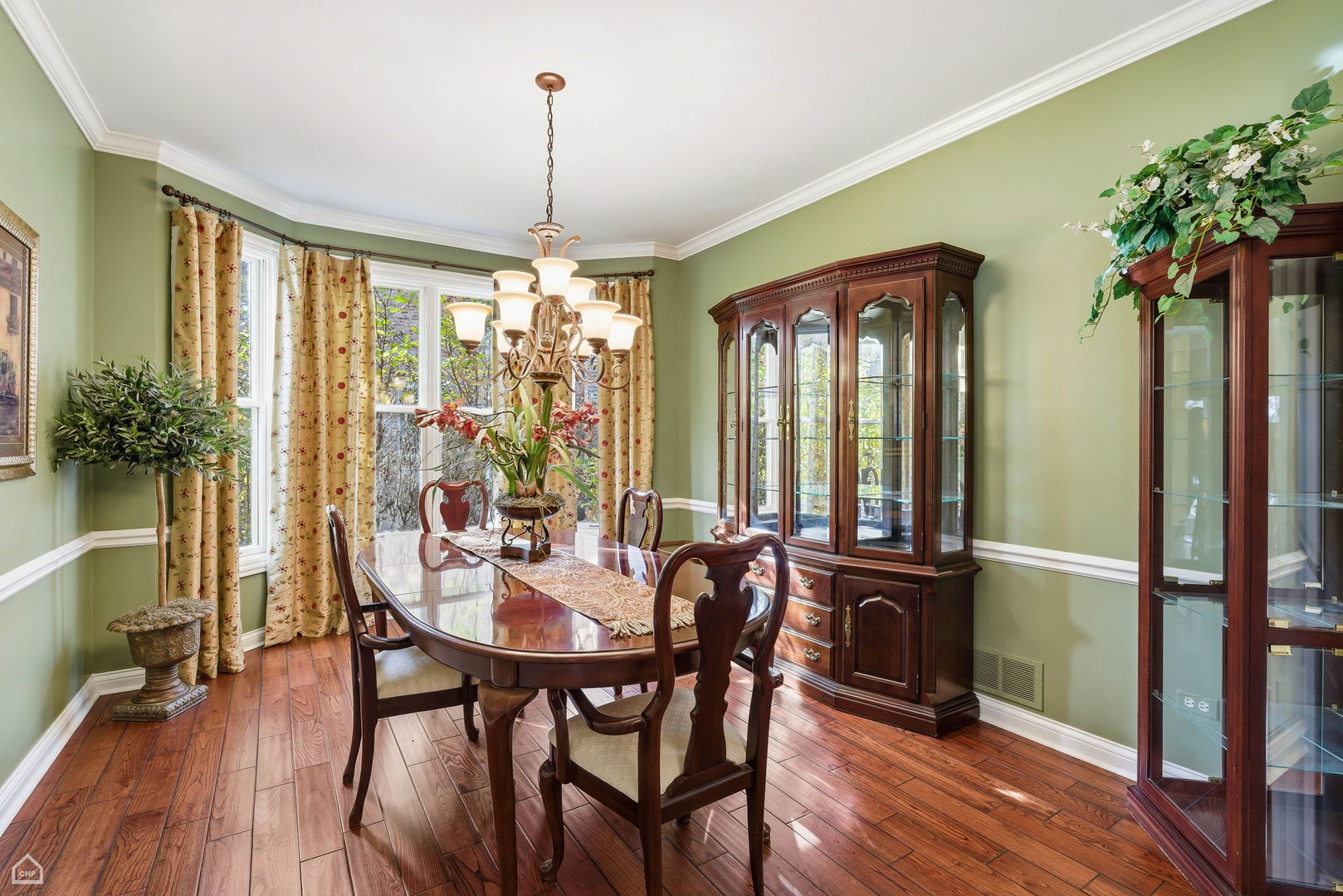 This absolutely gorgeous home offers a rare blend of stunning condition, functional utility, and private location. Boasting one of the largest sized lots in the entire subdivision, this .8 acre yard backs to a forested area of the golf course offering exceptional serene views from the rear deck and concrete patio with a highly durable James Hardie board siding. This home’s interior is designed just perfectly, with attention to detail flowing seamlessly throughout including updated light fixtures, hardwood floors, crown molding/trim, custom curtains and Hunter Douglas shades. Elegant quality and style are evident the moment one steps foot inside through the lovely seeded glass front door with matching transom/sidelight windows. The formal spaces are well appointed to serve their roles: the living room’s vaulted ceiling and chandelier make it a proper place to welcome guests and the dining room’s bay window provides room for adding one more extra leaf in the dinner table while hosting unforgettable gatherings with family and friends. While guests will enjoy themselves here, the real pleasure is reserved for the hosts/chefs who will be cooking in this incredible remodeled kitchen boasting flawless inset cabinetry with 42″ uppers, center island with breakfast bar stools, built-in pantry, built-in double ovens, windowed LG InstaView door-in-door refrigerator, granite countertops, and mosaic tile backsplash. The main floor 2nd bedroom suite with full bathroom are great for a temporary guest room or a permanent suite for those who don’t care to climb up stairs. Enjoy quiet solitude in the informal spaces: breakfasts are bright and sunny at this kitchen table with southern rear views of the woods from the bay windows and cozy up around the family room’s brick fireplace in the evening. Heading upstairs, a formal office provides space for productivity away from any noise. After work and play are done for the day, what better place to retire than in this amazing master suite with trey ceiling in the bedroom, huge walk-in closet, and an impeccable bathroom with frameless glass shower and pedestal tub. The 3rd/4th bedrooms (one featuring an additional bonus room) share a wonderfully remodeled Jack and Jill bathroom. In addition to 3,400 SQFT of above-ground living area, the finished English basement provides an additional 1,582 SQFT and continues with the combination of thoughtful design and functionality: a naturally lit recreation room for play (surround sound speakers and ping pong table are included), a wet bar and mini fridge for refreshments, a utility room for tinkering, a storage room, and a 5th bedroom (with proper egress escape window) which is adjacent to yet another full bathroom. Outdoor sprinkler irrigation, radon mitigation system, high efficiency furnace, and a 75 gallon water heater which was replaced in 2023. Ivanhoe Estates provides peace of mind with secure guard-gated entrances. Priced well under market value, let the sellers’ motivation to sell quickly be your gift to yourself this holiday season!