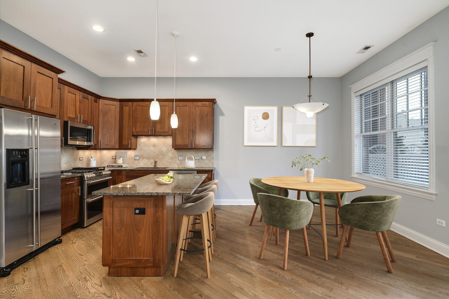 Boutique elevator building in the heart of the best Lakeview location! This two bed two bath home features an ideal floorplan with ten-foot ceilings throughout, and beautiful hardwood floors. The kitchen is a wonderful space with stainless steel appliances, walnut cabinetry, granite counters, a large center island, and perfect dining space. Entertain effortlessly in the light-filled living area which offers a gas fireplace and good space. The oversized terrace offers additional entertaining space directly off the living and kitchen. The expansive primary suite is a true retreat with a large walk-in closet and a perfectly finished en-suite bathroom, with heated marble floors, a double vanity, and a walk-in shower with body sprays. The home includes an in-unit W/D, heated garage parking, and storage. Prime location in the sought-after Alcott Elementary district, and a close walk to the best neighborhood shopping and dining as well as the Halsted (8) bus, El train, and more!