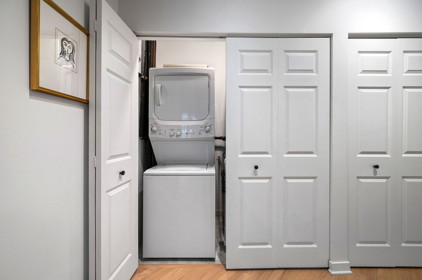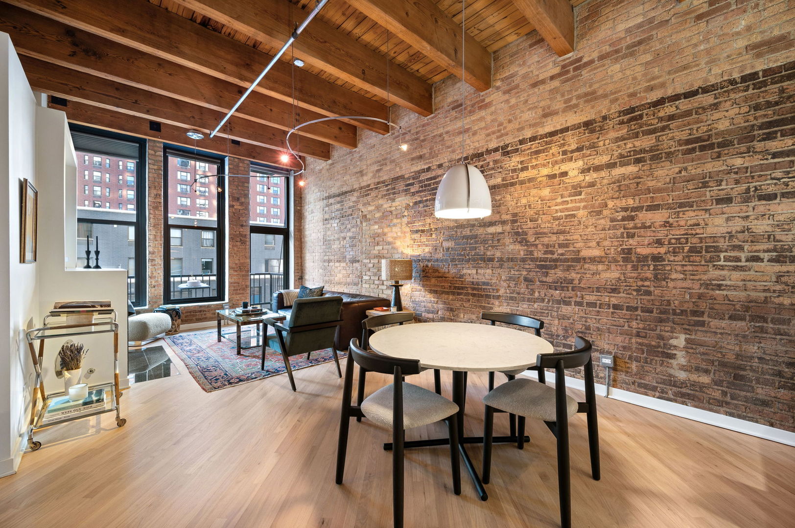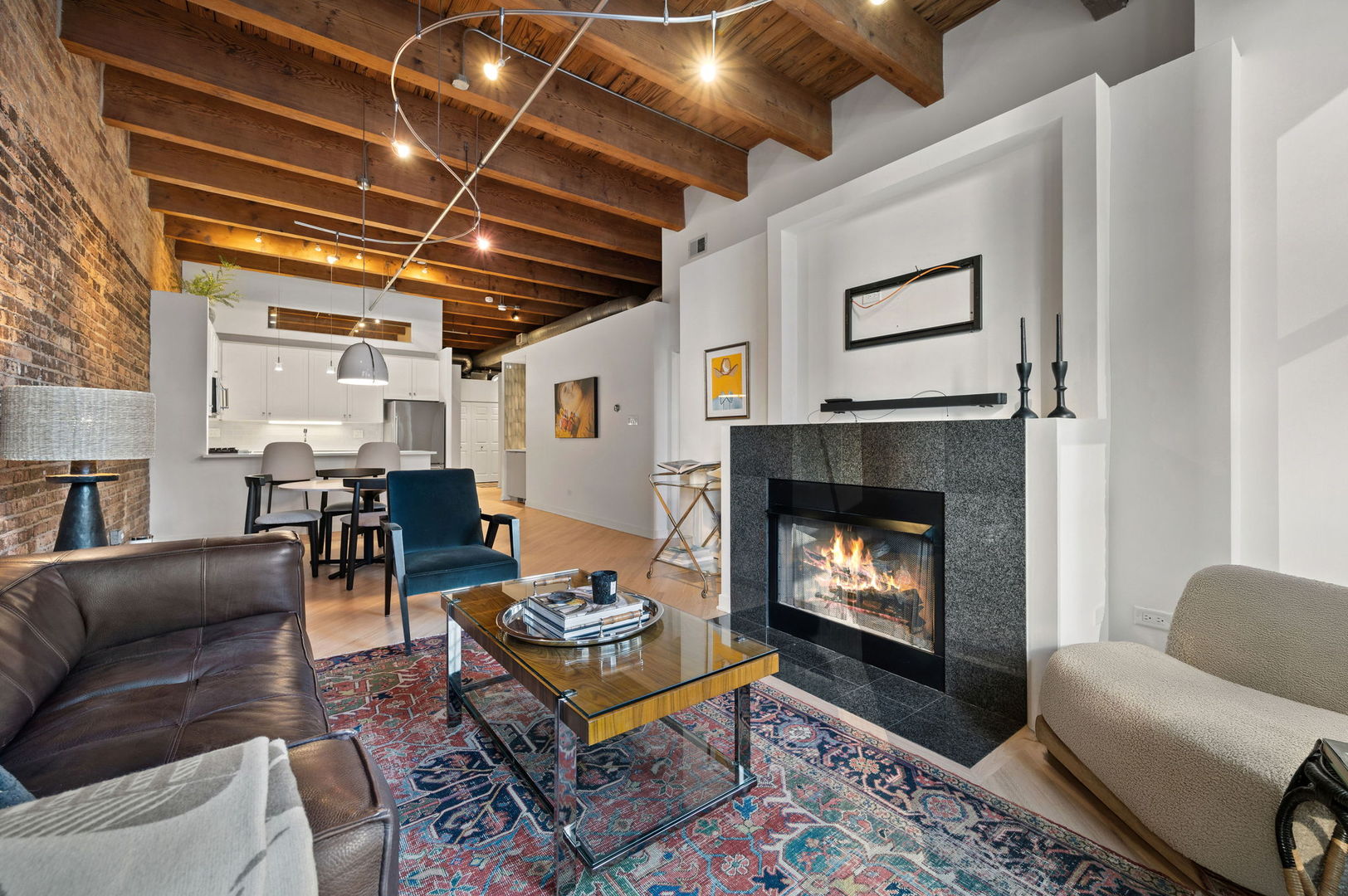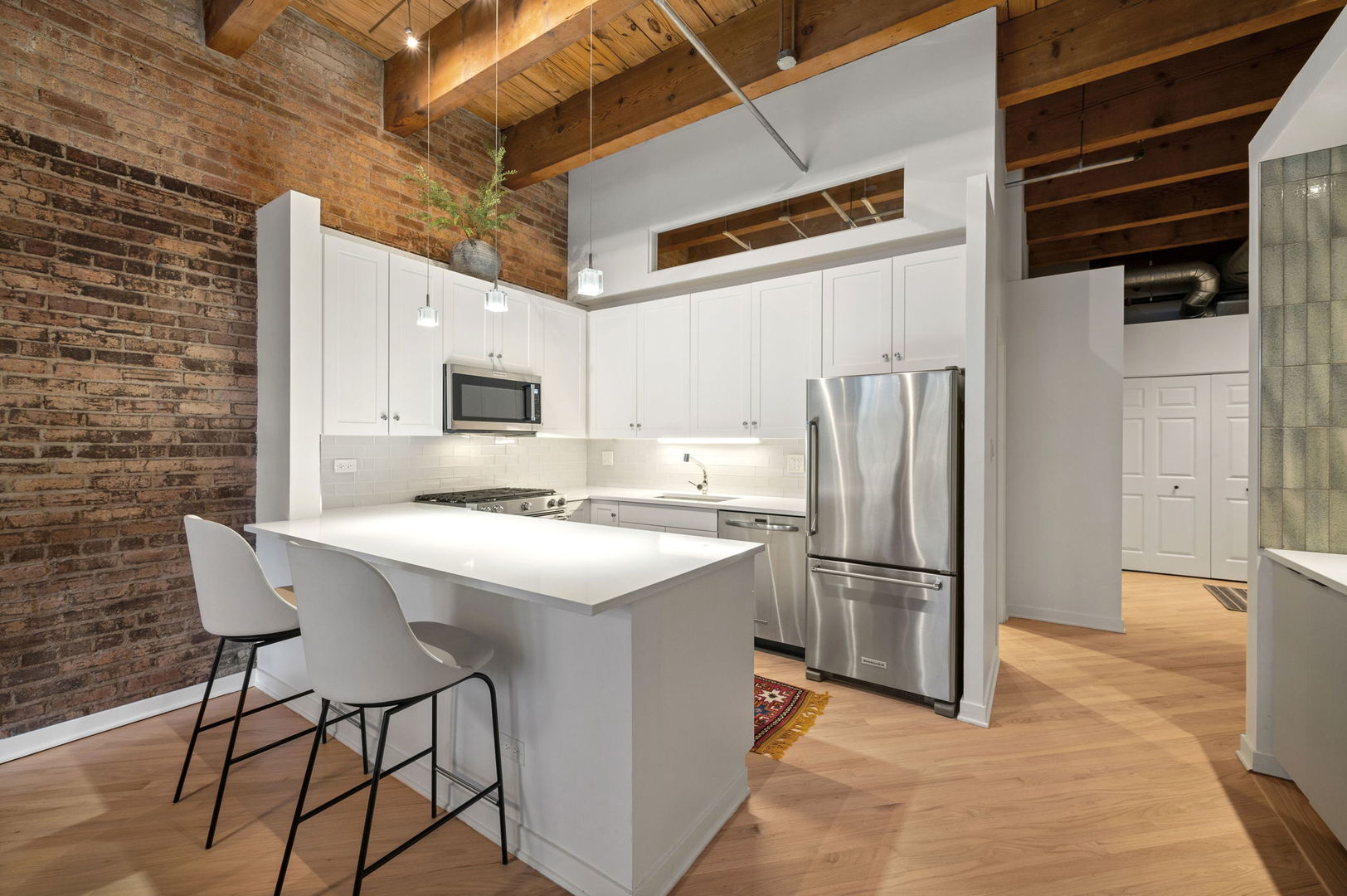 Enjoy this beautiful brick and timber 2 bed /2 bath loft unit in River North. With super sunny south-facing exposure, this end unit fills with light from floor to ceiling windows and features soaring thick-beamed ceilings and exposed brick in every room with two fully enclosed bedrooms. Remodeled in 2021, the kitchen features 42″ Edgecomb Gray cabinets, all stainless steel Kitchen-Aid appliances, Artic White quartz counters, translucent glass backsplash, extra deep under-mount sink, faucet with sprayer, and under-cabinet lighting, plus a beautiful new bar area with beverage storage. Hardwood floors have been newly refinished throughout in a natural matte oak finish while the living/dining rooms are open and ideal for entertaining with a new composite decking balcony off the living room. A gas start fireplace is included and perfect for cozy-ups in winter. This split floor plan is ideal for a work-from-home office while still allowing for a complete guest suite. The primary bedroom is large enough for a king-sized bed and the entire unit has been freshly painted with tons of organized closets. A new Bryant 2.5 ton air conditioner was installed in July 2020 plus brand new Lenox furnace in 2025 including a convenient remote control Nest thermostat. Deeded garage parking an additional $15,000 located next door. A walk-in storage room is also included. Building also has a brand new common roof deck. Location is ideal convenient to plenty of restaurants, bars, transportation and East Bank Club. A loft lovers dream in River North.