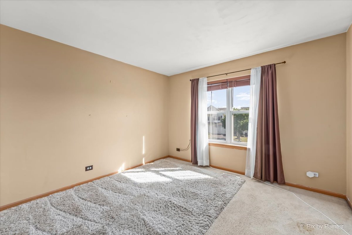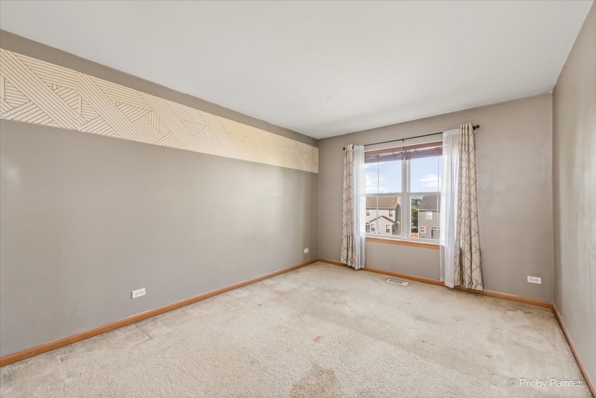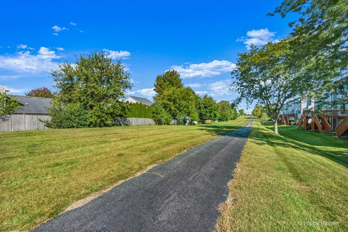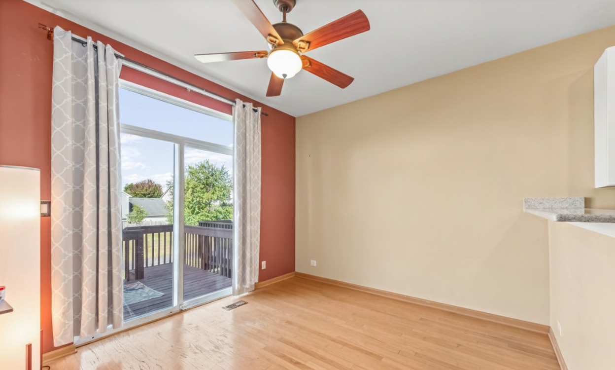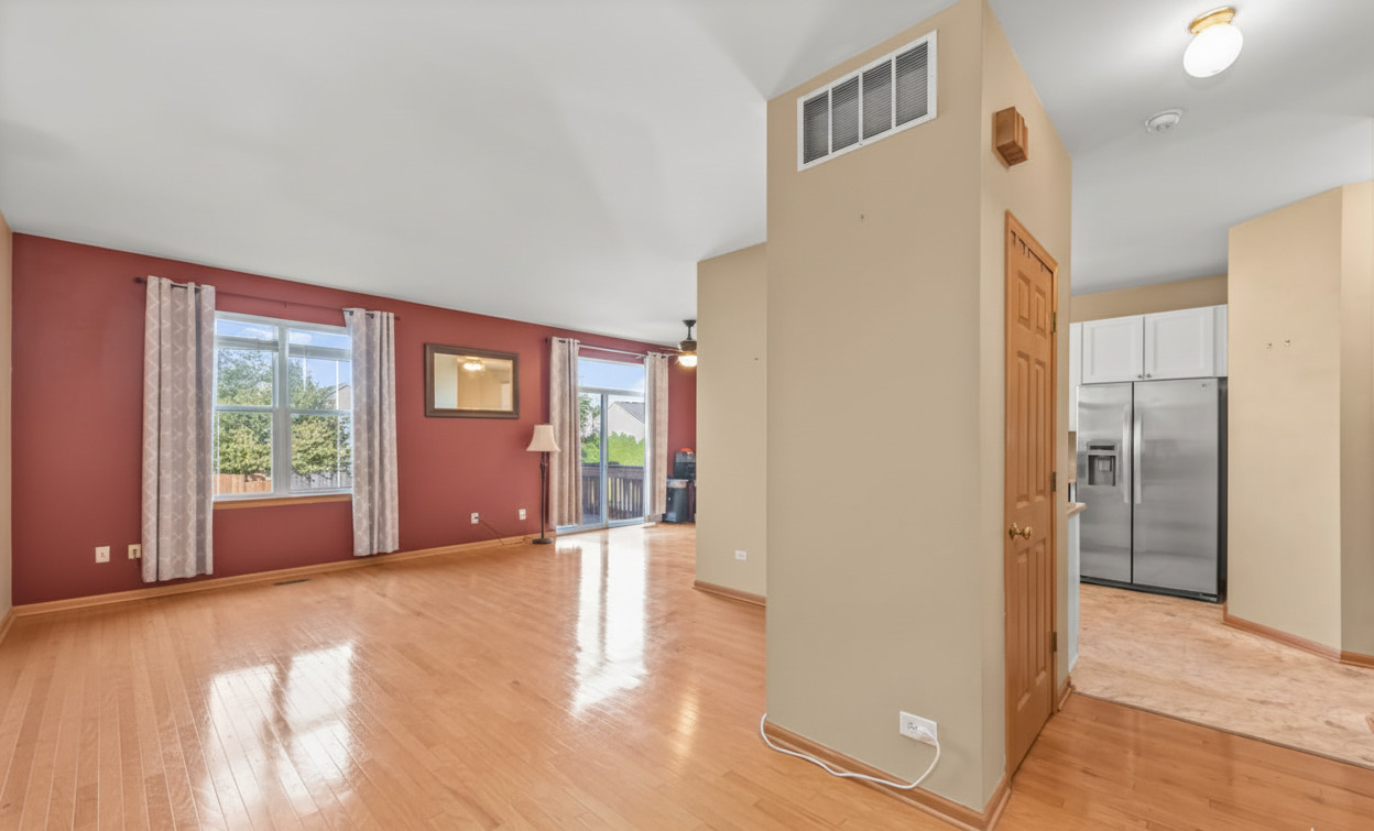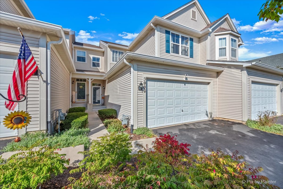 2-story townhome with 3 bedrooms, 2.1 bathrooms, updated kitchen and open green space in the Harvest Hills subdivision. Step through the private entrance into the foyer with adjacent living room featuring tons of natural light and lovely hardwood flooring that flows through the dining area with ceiling fan and glass sliders that lead to the private deck. Updated kitchen with ample white cabinets, quartz counters and stainless steel appliances. A laundry room and powder room complete the main level. Head upstairs to the master suite with volume ceiling and ensuite bath with extended vanity and shower over tub combo. 2 additional bedrooms with sizable closets, full hall bath and loft space round out the 2nd level. Full deep pour walk-out basement is waiting for your finishing touches. Relax on the deck or play in the abundant green space that backs up to walking paths that lead right to Harvest Hills Park with a playground and tennis courts. Nearby endless shopping and dining options. Value-added features: (2023) Deck refinished, hardwood floor in hall/loft/stairs, washer, dryer; (2022) Roof, kitchen renovated, oven, dishwasher, garbage disposal, microwave, flooring in kitchen/laundry/powder room, window blinds; (2018) Water heater; (2016) AC.