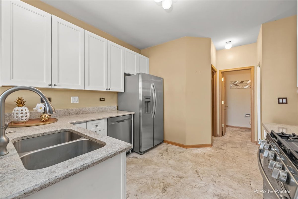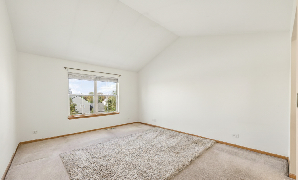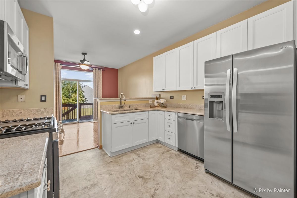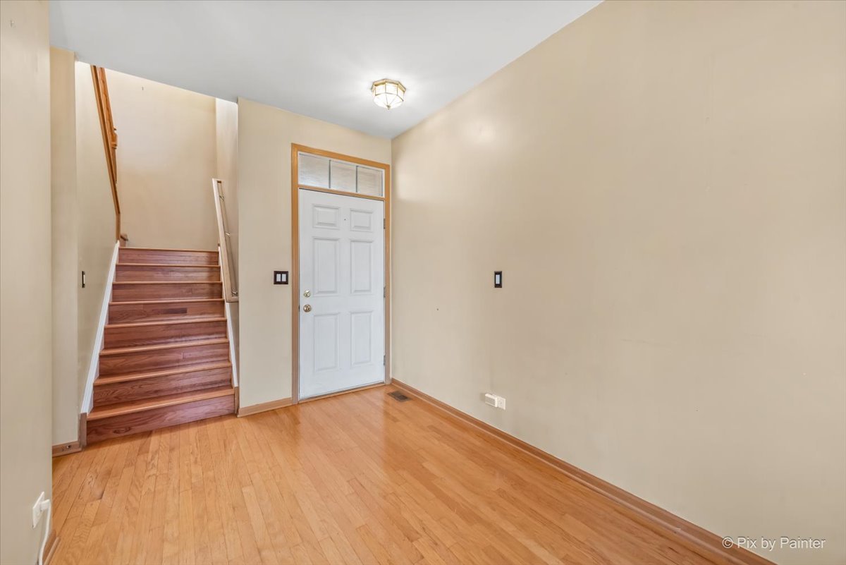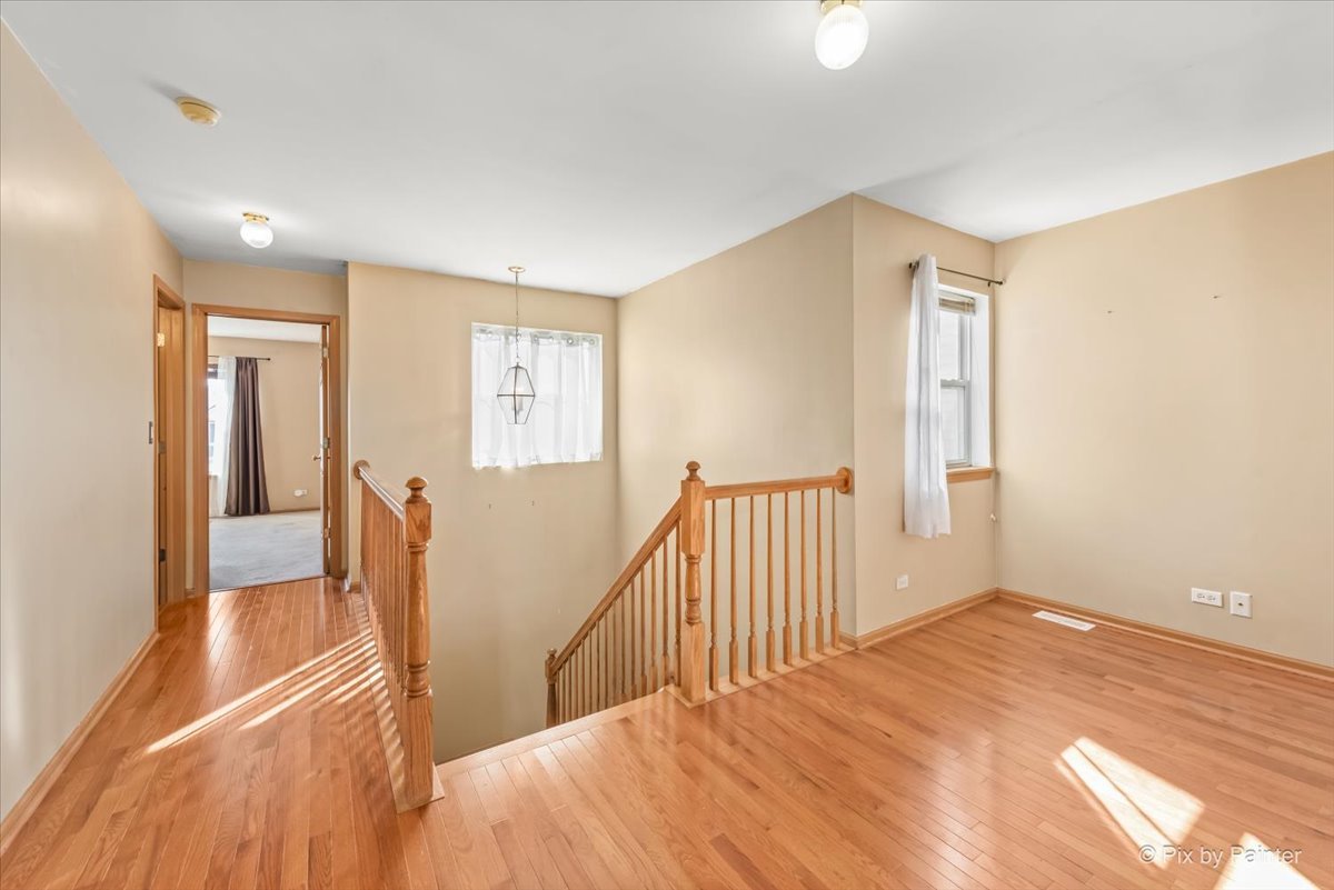 2-story townhome with 3 bedrooms, 2.1 bathrooms, updated kitchen and open green space in the Harvest Hills subdivision. Step through the private entrance into the foyer with adjacent living room featuring tons of natural light and lovely hardwood flooring that flows through the dining area with ceiling fan and glass sliders that lead to the private deck. Updated kitchen with ample white cabinets, quartz counters and stainless steel appliances. A laundry room and powder room complete the main level. Head upstairs to the master suite with volume ceiling and ensuite bath with extended vanity and shower over tub combo. 2 additional bedrooms with sizable closets, full hall bath and loft space round out the 2nd level. Full deep pour walk-out basement is waiting for your finishing touches. Relax on the deck or play in the abundant green space that backs up to walking paths that lead right to Harvest Hills Park with a playground and tennis courts. Nearby endless shopping and dining options. Value-added features: (2023) Deck refinished, hardwood floor in hall/loft/stairs, washer, dryer; (2022) Roof, kitchen renovated, oven, dishwasher, garbage disposal, microwave, flooring in kitchen/laundry/powder room, window blinds; (2018) Water heater; (2016) AC.