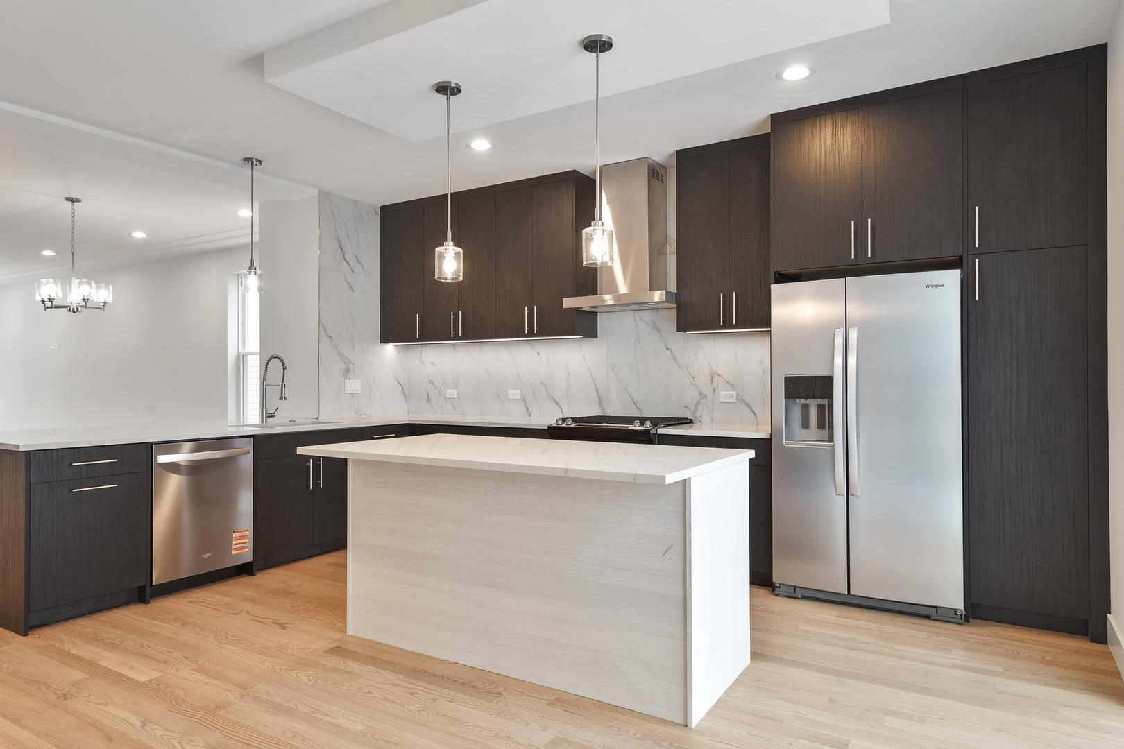 Modern new construction single-family home by top developer on an oversized 30′ lot! Sharp facade with brick accents. Extra wide, open concept floor plan. Sun filled main-level features spacious living/dining area with large front windows and hardwood flooring throughout. Adjoining eat-in kitchen with stainless steel Whirlpool appliance package, flat panel cabinetry, quartz counters, island and peninsula with breakfast bar seating, pantry, and patio door to rear deck. Bright and spacious primary bedroom with good storage and private bath featuring a frameless glass shower, vanity with dual sinks, and heated flooring. Two additional bedrooms, full guest bath with tub, and laundry complete the upper-level. Finished lower-level with recreation room featuring wet bar, 4th bedroom, full bath, utilities, and luxury vinyl plank flooring. Nice ceiling heights throughout. Finished closets. On trend design features and tons of natural light! Enclosed backyard with deck and detached two-car garage. Conveniently located near shopping, groceries, restaurants, parks, and more!