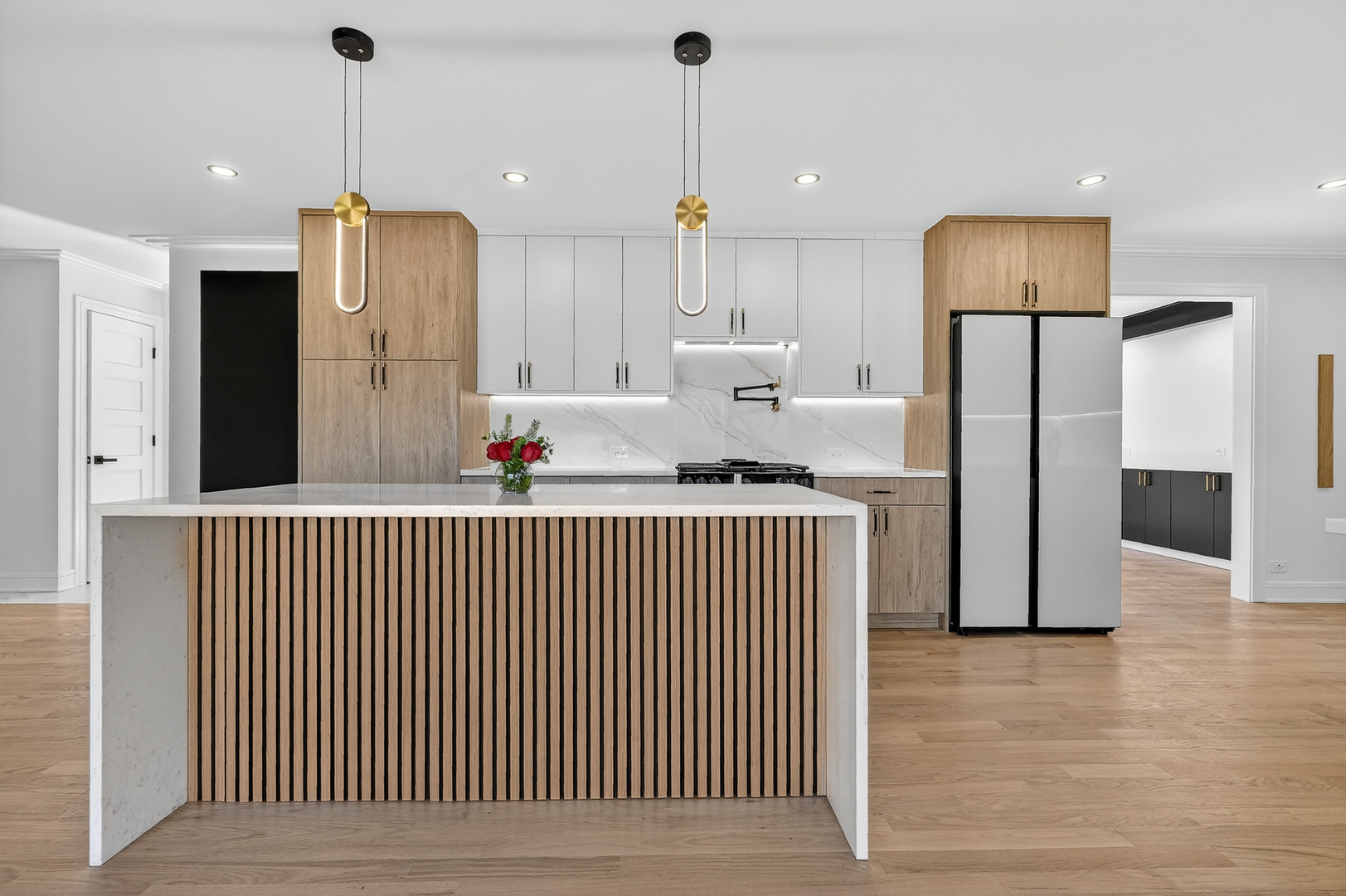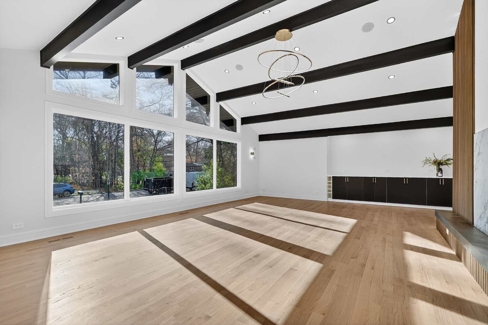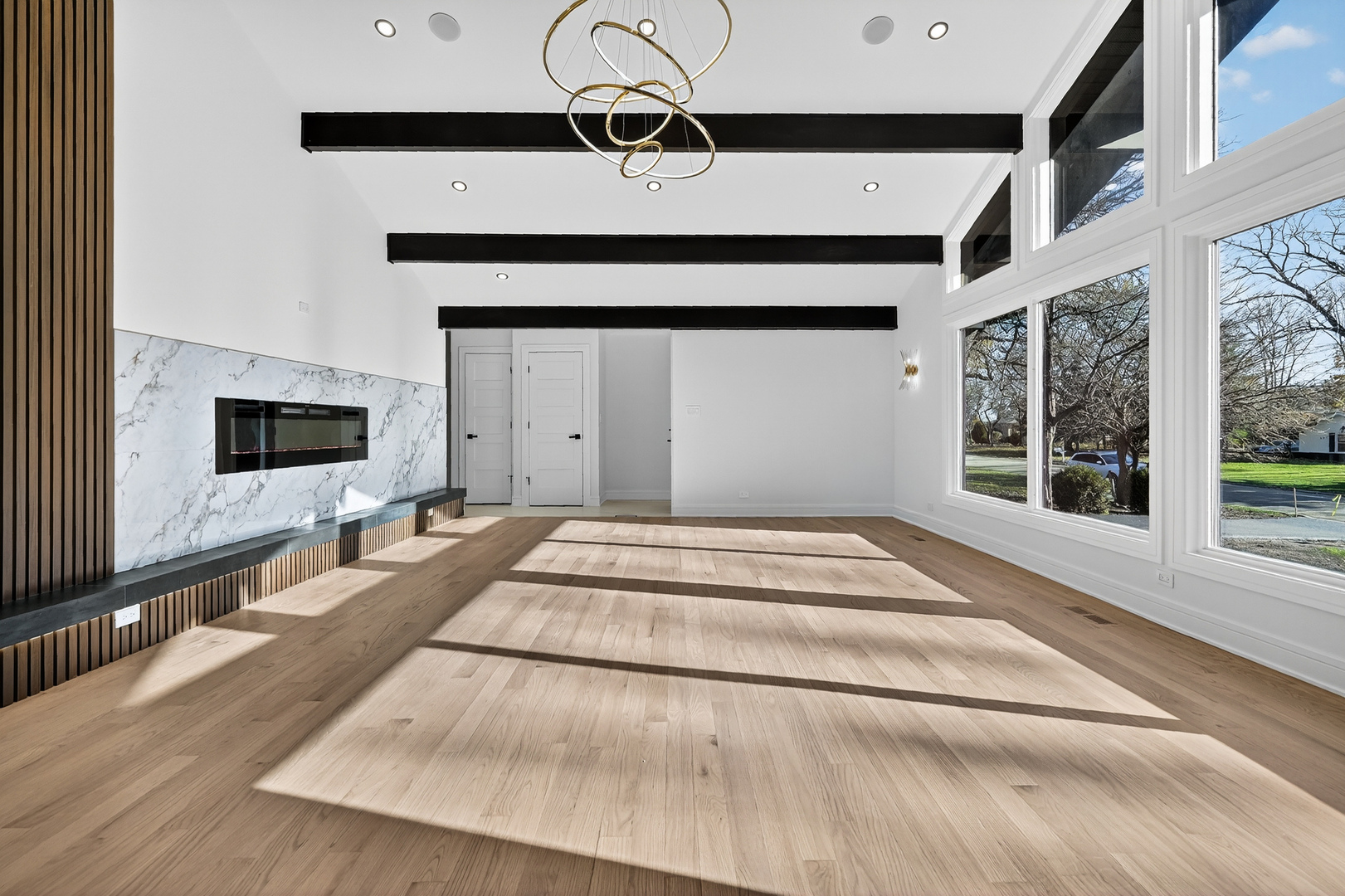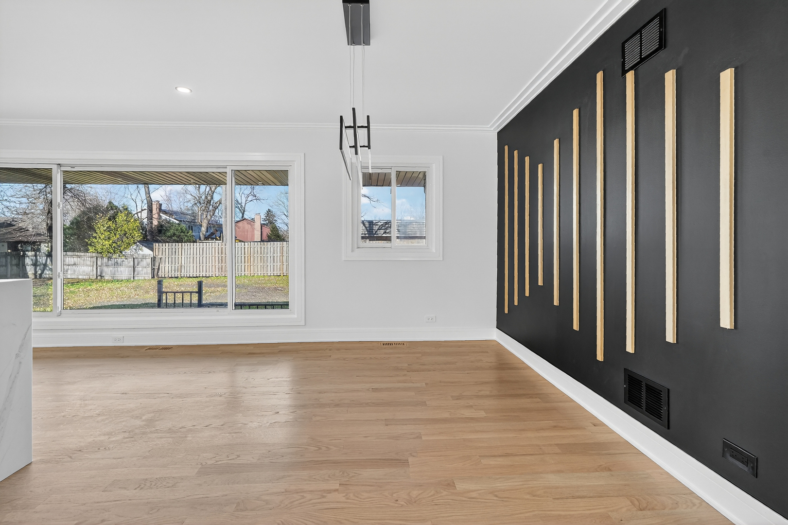 Experience luxury living on a serene 1/2-acre lot in this fully renovated, design-forward ranch featuring 4 bedrooms, 3.5 baths, and a finished basement with soaring ceilings. Oversized floor-to-ceiling windows flood the living and dining areas with natural light, highlighting rich hardwood floors and sophisticated custom carpentry throughout. The custom kitchen boasts high-end Samsung Bespoke appliances, premium finishes, and seamless flow for entertaining. The expansive primary suite includes a custom walk-in closet and a spa-like bath with heated flooring. A generous mud room/laundry room adds functionality and elegance. The lower level offers impressive living space with pre-wired speaker cables, a dedicated wine cooler, and endless flexibility for entertainment. The main living room is equipped with installed speakers and a receiver, while the garage is ready for an electric vehicle charger. Set in the highly sought-after Fremd High School district and surrounded by mature trees, this property blends modern luxury with suburban tranquility.
