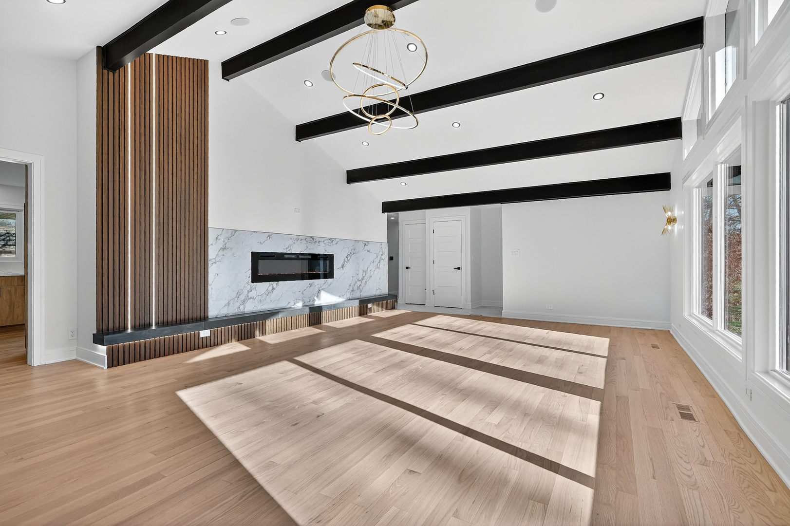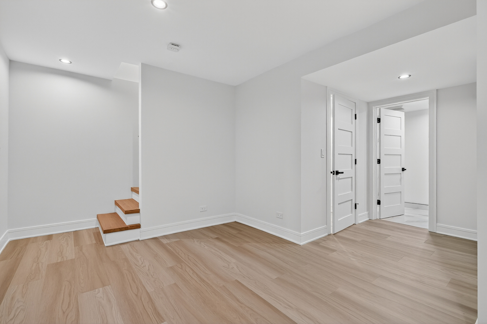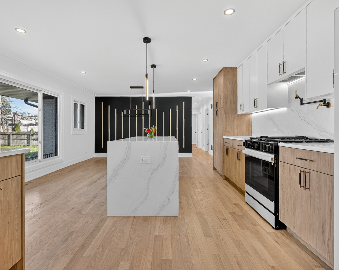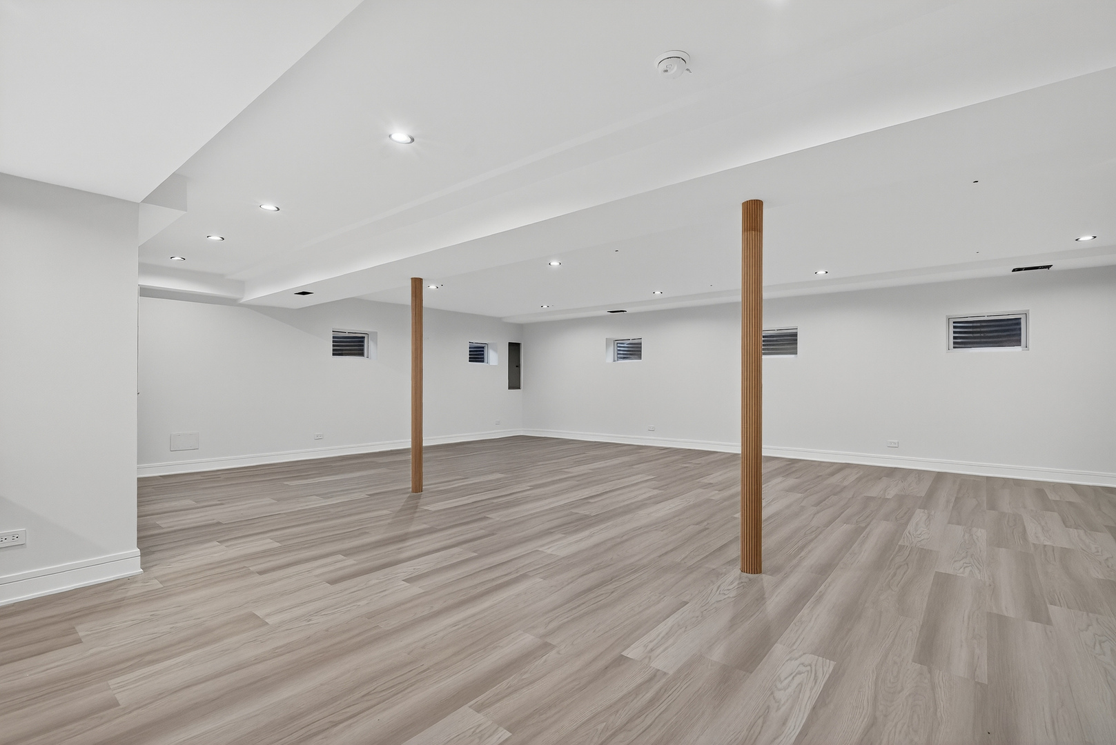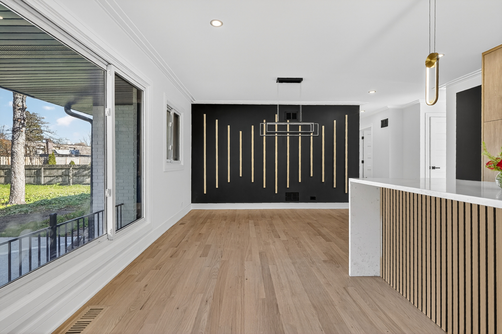 Experience luxury living on a serene 1/2-acre lot in this fully renovated, design-forward ranch featuring 4 bedrooms, 3.5 baths, and a finished basement with soaring ceilings. Oversized floor-to-ceiling windows flood the living and dining areas with natural light, highlighting rich hardwood floors and sophisticated custom carpentry throughout. The custom kitchen boasts high-end Samsung Bespoke appliances, premium finishes, and seamless flow for entertaining. The expansive primary suite includes a custom walk-in closet and a spa-like bath with heated flooring. A generous mud room/laundry room adds functionality and elegance. The lower level offers impressive living space with pre-wired speaker cables, a dedicated wine cooler, and endless flexibility for entertainment. The main living room is equipped with installed speakers and a receiver, while the garage is ready for an electric vehicle charger. Set in the highly sought-after Fremd High School district and surrounded by mature trees, this property blends modern luxury with suburban tranquility.