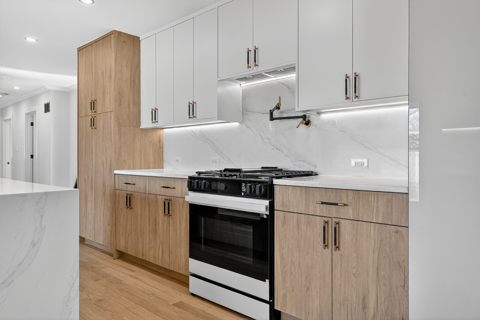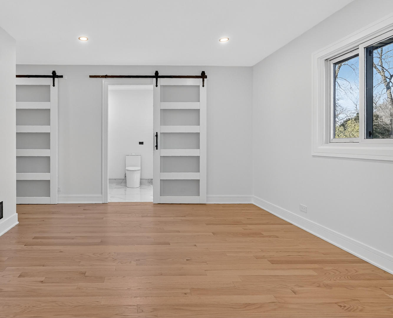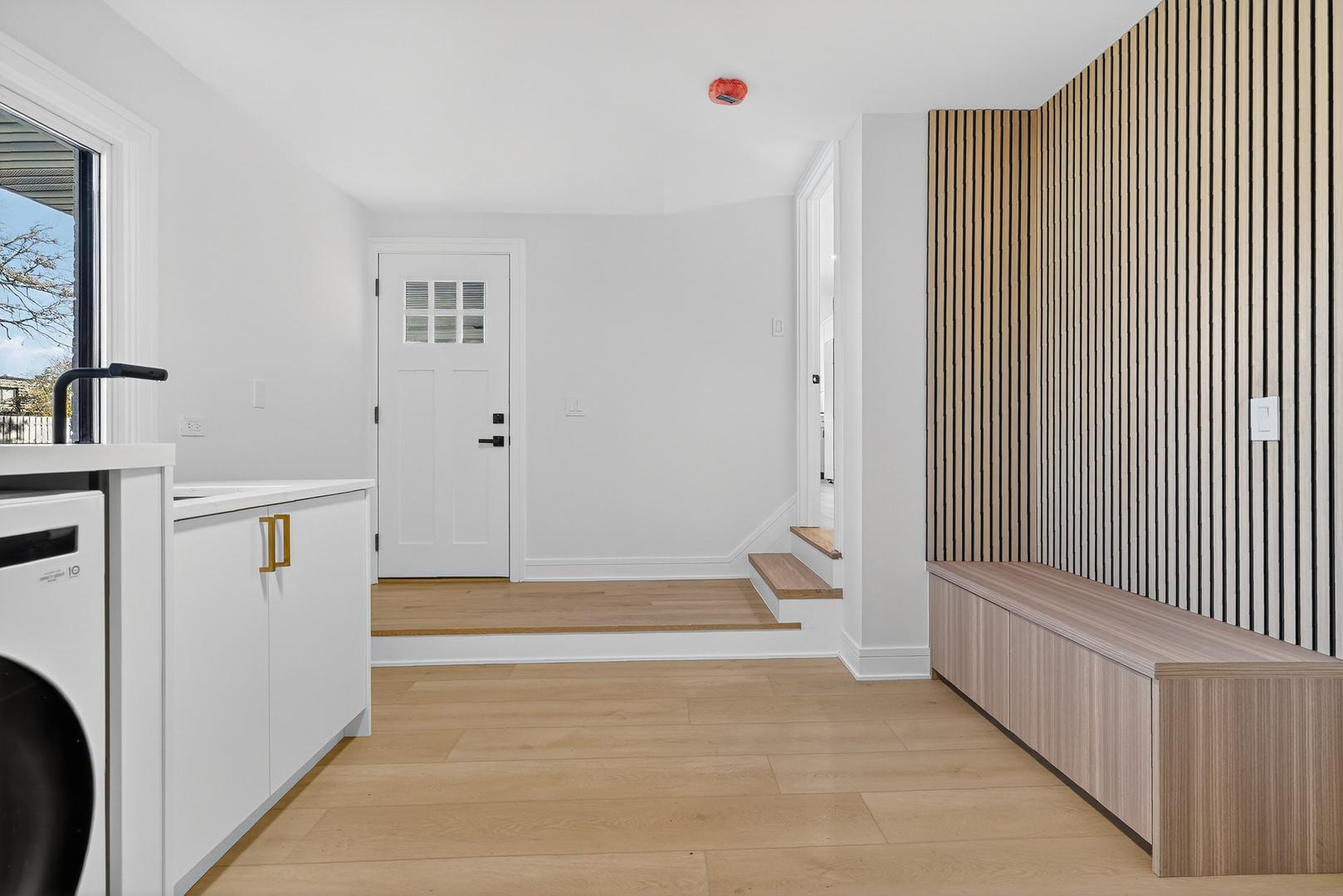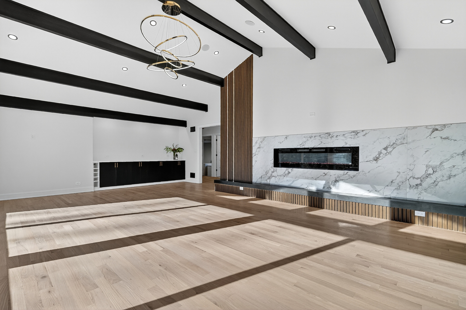 Experience luxury living on a serene 1/2-acre lot in this fully renovated, design-forward ranch featuring 4 bedrooms, 3.5 baths, and a finished basement with soaring ceilings. Oversized floor-to-ceiling windows flood the living and dining areas with natural light, highlighting rich hardwood floors and sophisticated custom carpentry throughout. The custom kitchen boasts high-end Samsung Bespoke appliances, premium finishes, and seamless flow for entertaining. The expansive primary suite includes a custom walk-in closet and a spa-like bath with heated flooring. A generous mud room/laundry room adds functionality and elegance. The lower level offers impressive living space with pre-wired speaker cables, a dedicated wine cooler, and endless flexibility for entertainment. The main living room is equipped with installed speakers and a receiver, while the garage is ready for an electric vehicle charger. Set in the highly sought-after Fremd High School district and surrounded by mature trees, this property blends modern luxury with suburban tranquility.