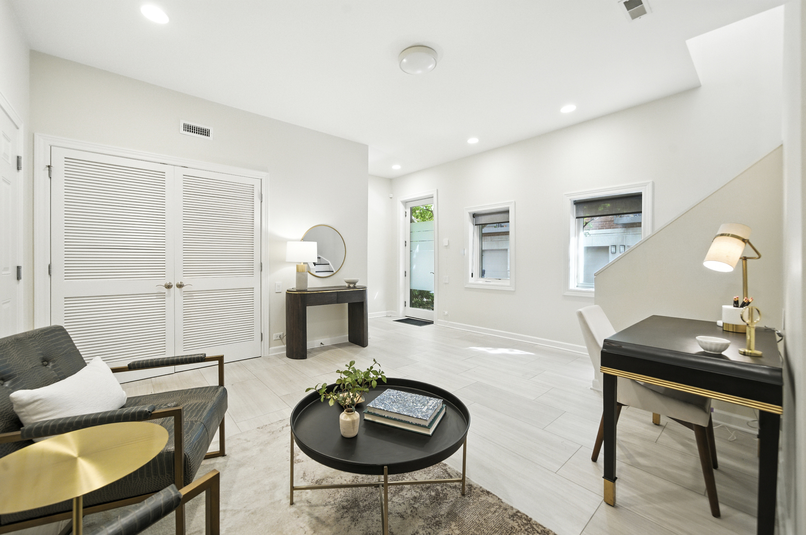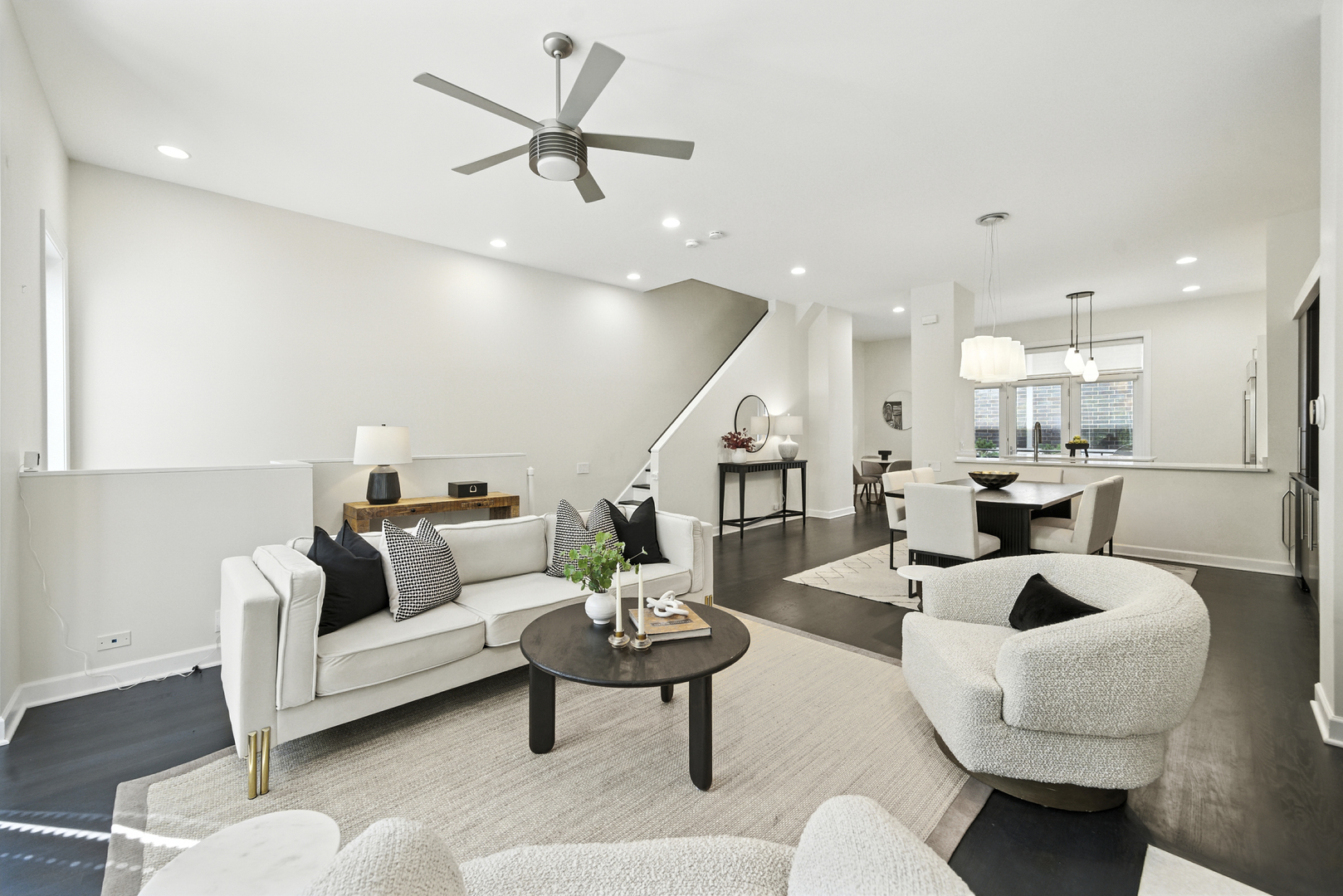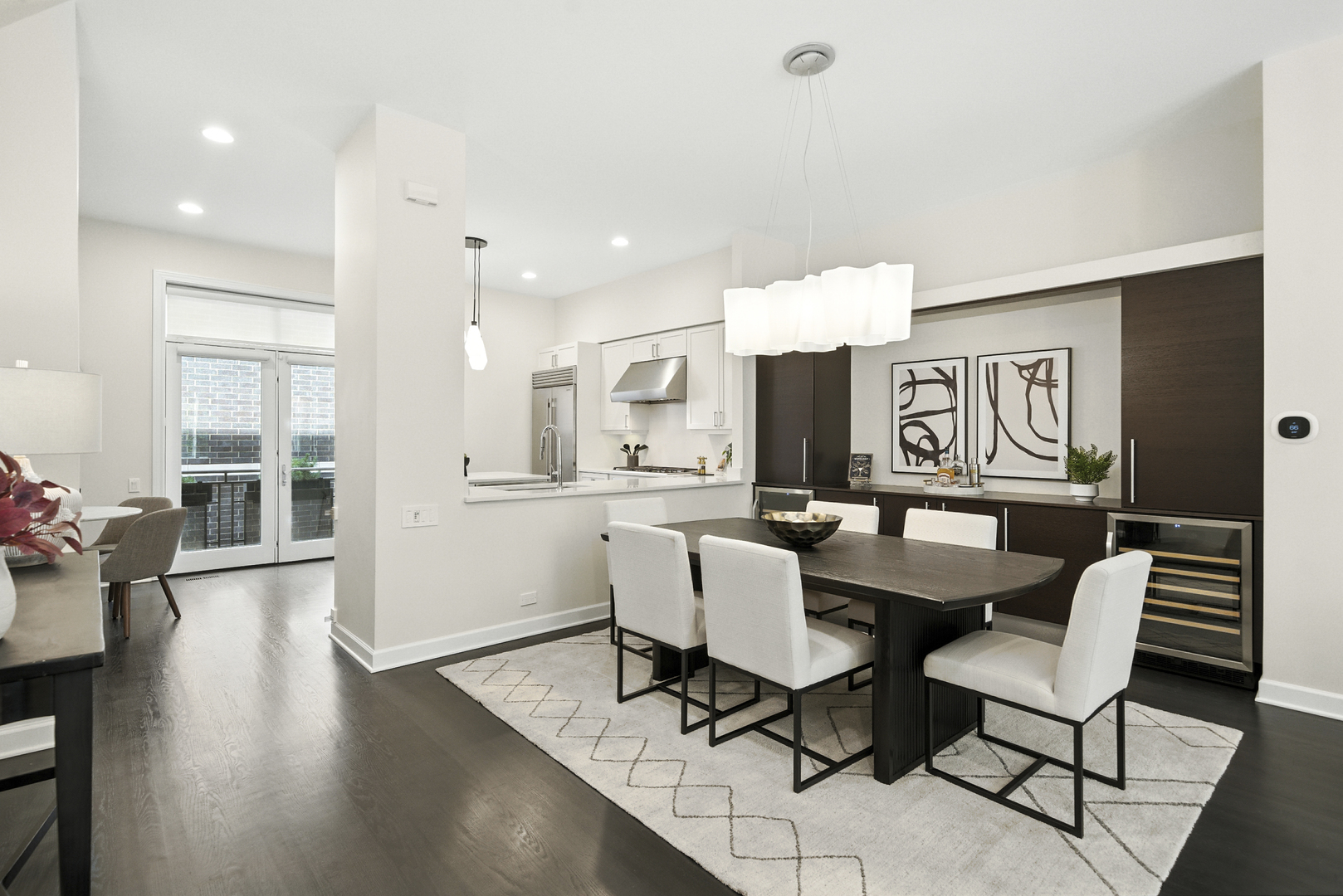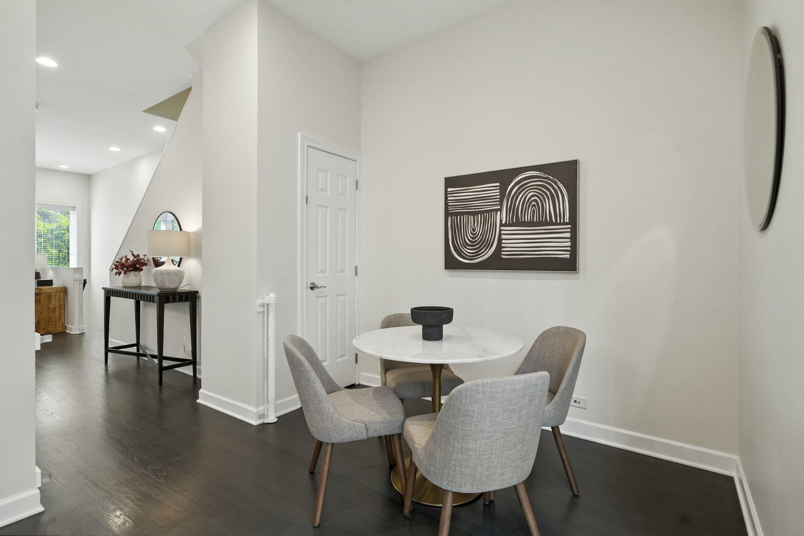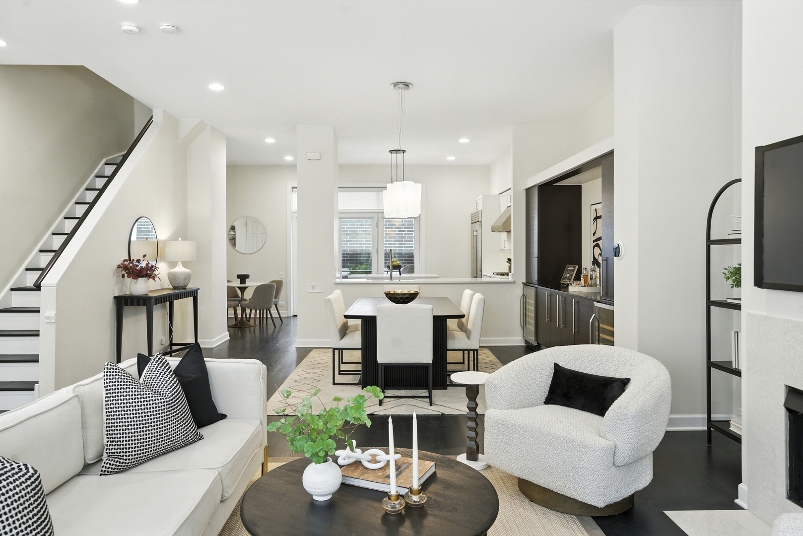Stunning, sophisticated 3 bedroom plus den, 3 bathroom River North townhome in the coveted City Club gated community! This home is spacious, has a wonderful floor plan and lives like a single family home tucked away in the middle of River North! Thoughtfully updated and light-filled, this 4 level unit boasts stunning hardwood floors and 10 foot ceilings throughout. The ideal open floor plan is an entertainer’s dream featuring a beautifully updated kitchen with 42″ cabinetry, white quartz counters and backsplash, updated Subzero and Wolf stainless steel appliances, gracious island with breakfast bar, adjacent breakfast nook, walk-in pantry and generous sized balcony perfect for grilling with a Coyote gas grill installed and ready to go! Kitchen opens to a large dining space with built-in buffet and bright living room with gas fireplace, overlooking the tree-lined courtyard. The third level has a stunning king-sized primary suite with bay window, elegant custom walk-in closet, and grand en-suite bath with new quartz counter dual vanity, whirlpool bath, and oversized shower. Spacious second bedroom with custom closet and second full bath with quartz counter vanity complete this floor. The top level includes an enormous third bedroom with a giant walk-in closet, easily adaptable to a bedroom + den, along with a third full bath. Gorgeous rooftop terrace with spectacular city views! Lower level makes a perfect office/den/fitness room, with tiled flooring. 2 car attached garage, in-unit w/d and abundant storage throughout. All high-end modern appliances – Subzero/Wolf/Miele in the Kitchen, wine fridges, Samsung washer and dryer. Modern mechanicals, two AC units two Furnaces with smart thermostats. Light switches SmartHome capable. Steps from East Bank Club, Starbucks, Chicago CTA stop, Whole Foods, restaurants, shopping, and everything River North has to offer!